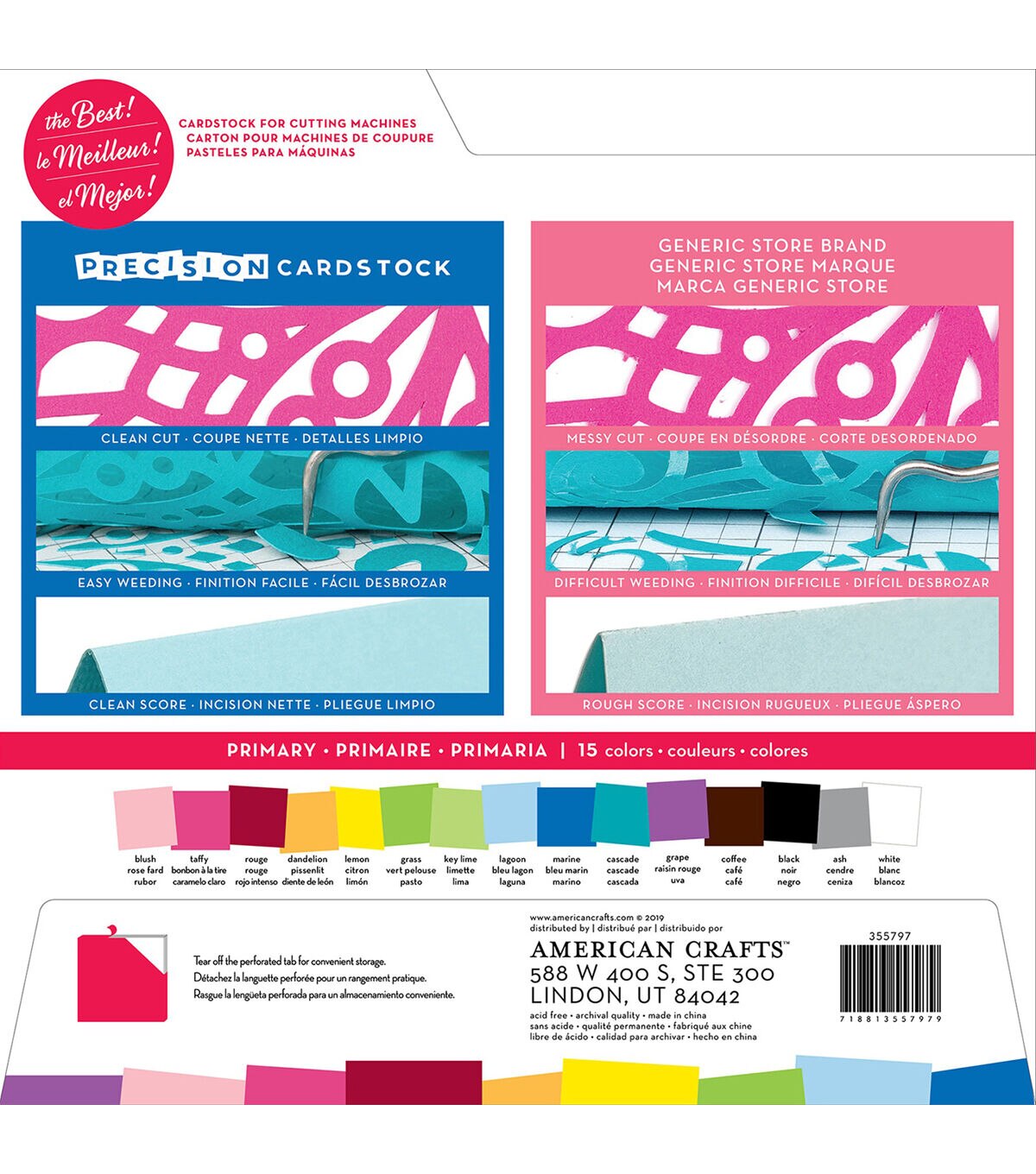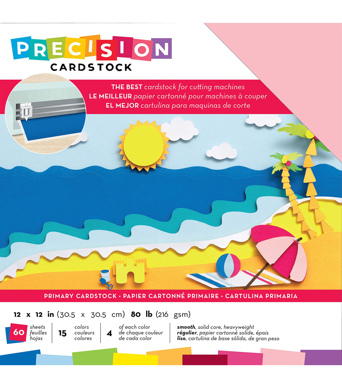 This cardstock is textured, solid core and 80lb (216gsm). Perfect for all cutting machines (sold separately). This package contains 60 12x12 inch sheets of cardstock in 15 colors (four of each color). Acid free. Archival quality. Imported.