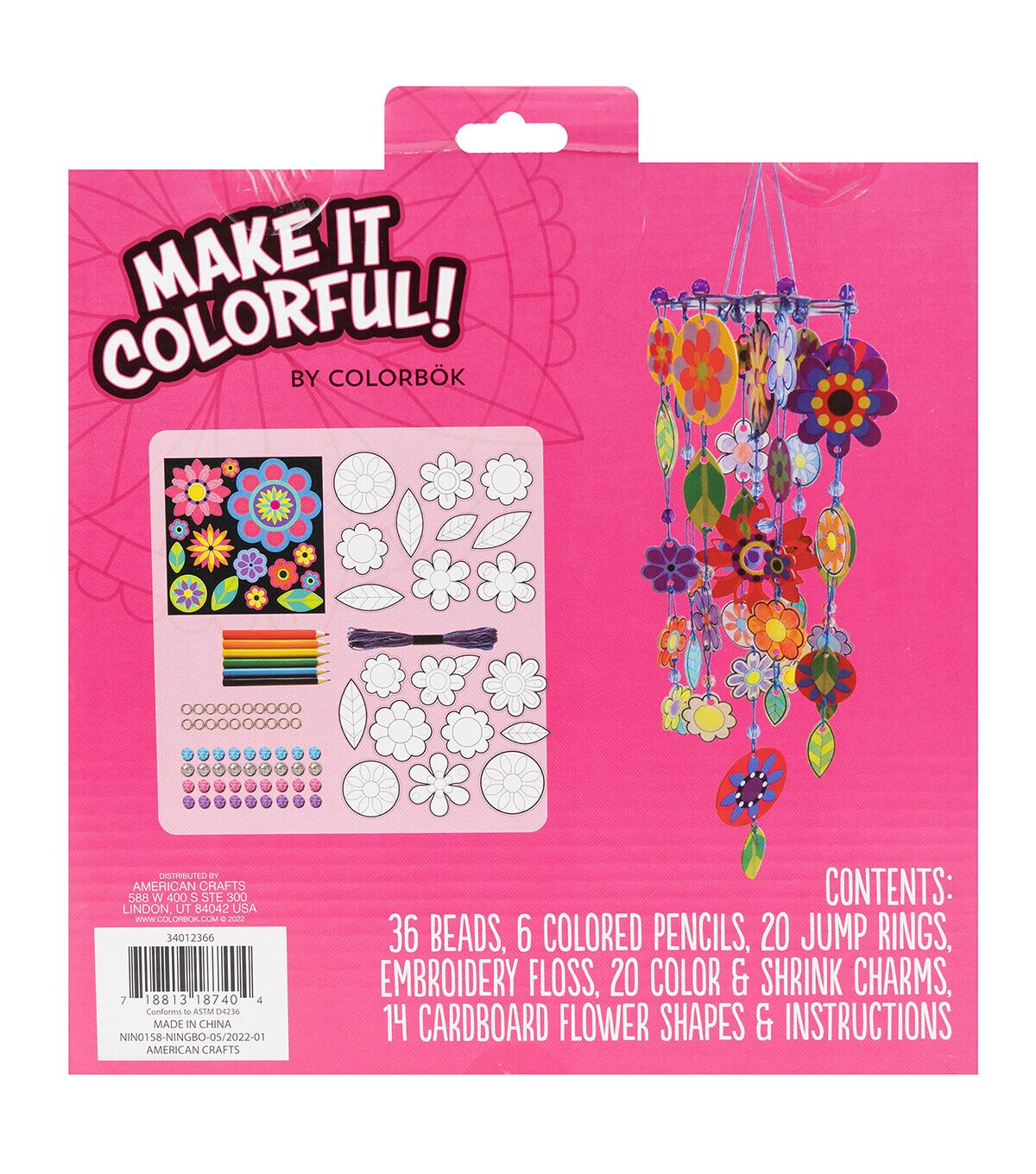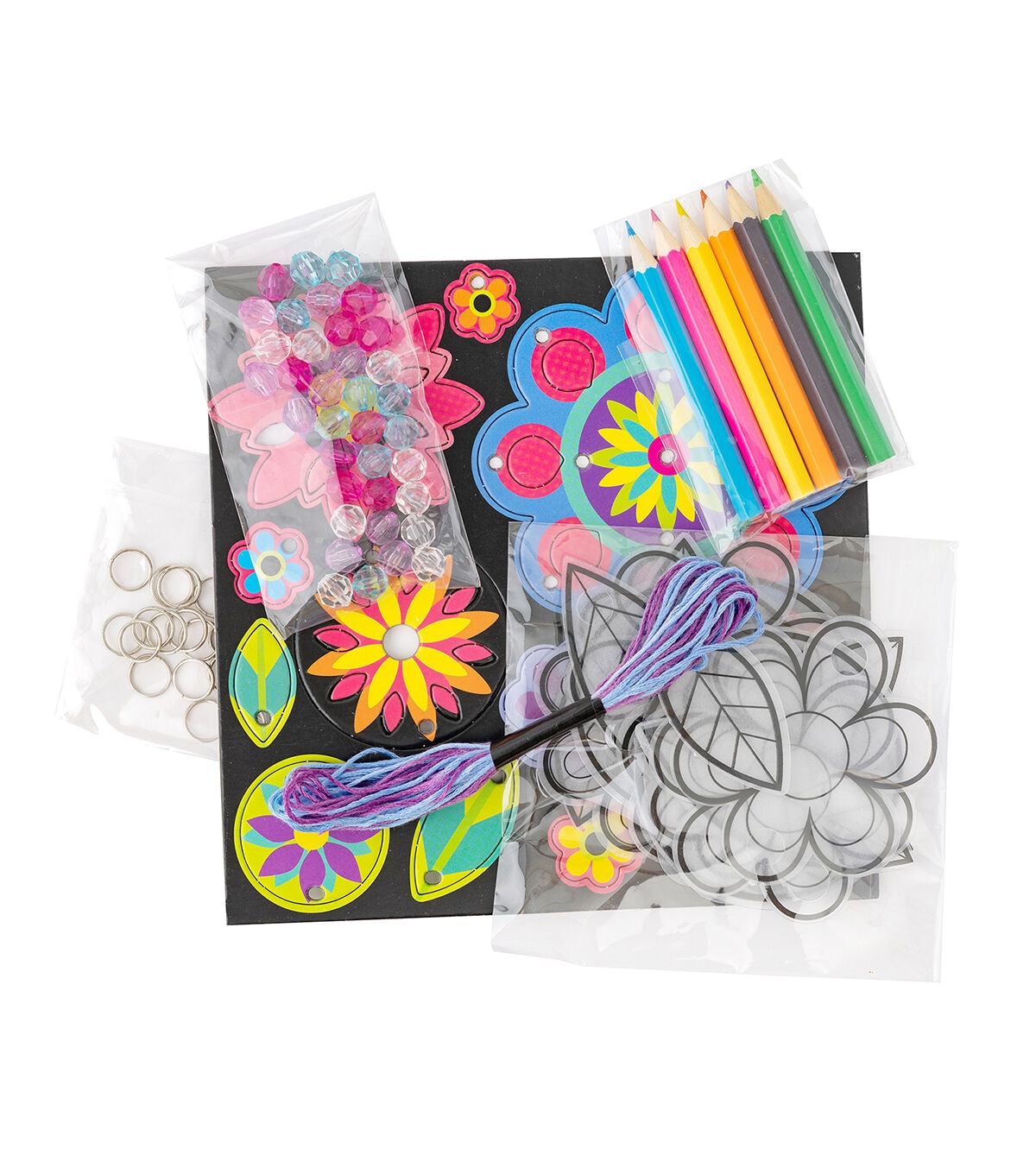 Kids crafting kits are the perfect project for any day! Use them for parties, rainy days, and just for fun. Kits come in a variety of mediums and skill to choose from, so try them all and get creative! For ages 6 and up. This package includes: 36 beads, 6 colored pencils, 20 jump rings, embroidery floss, 20 color & shrink charms, 14 cardboard flowers, and instructions. Makes one mobile.
