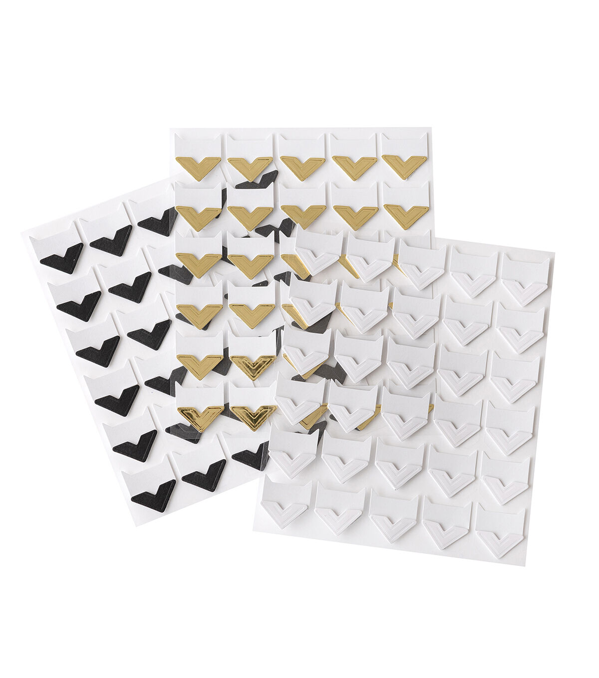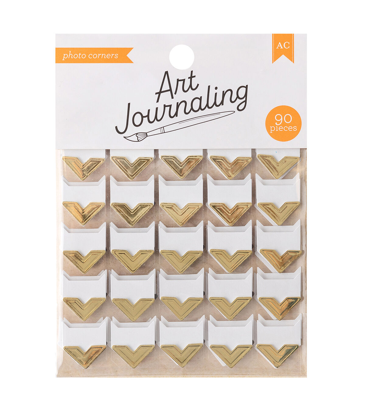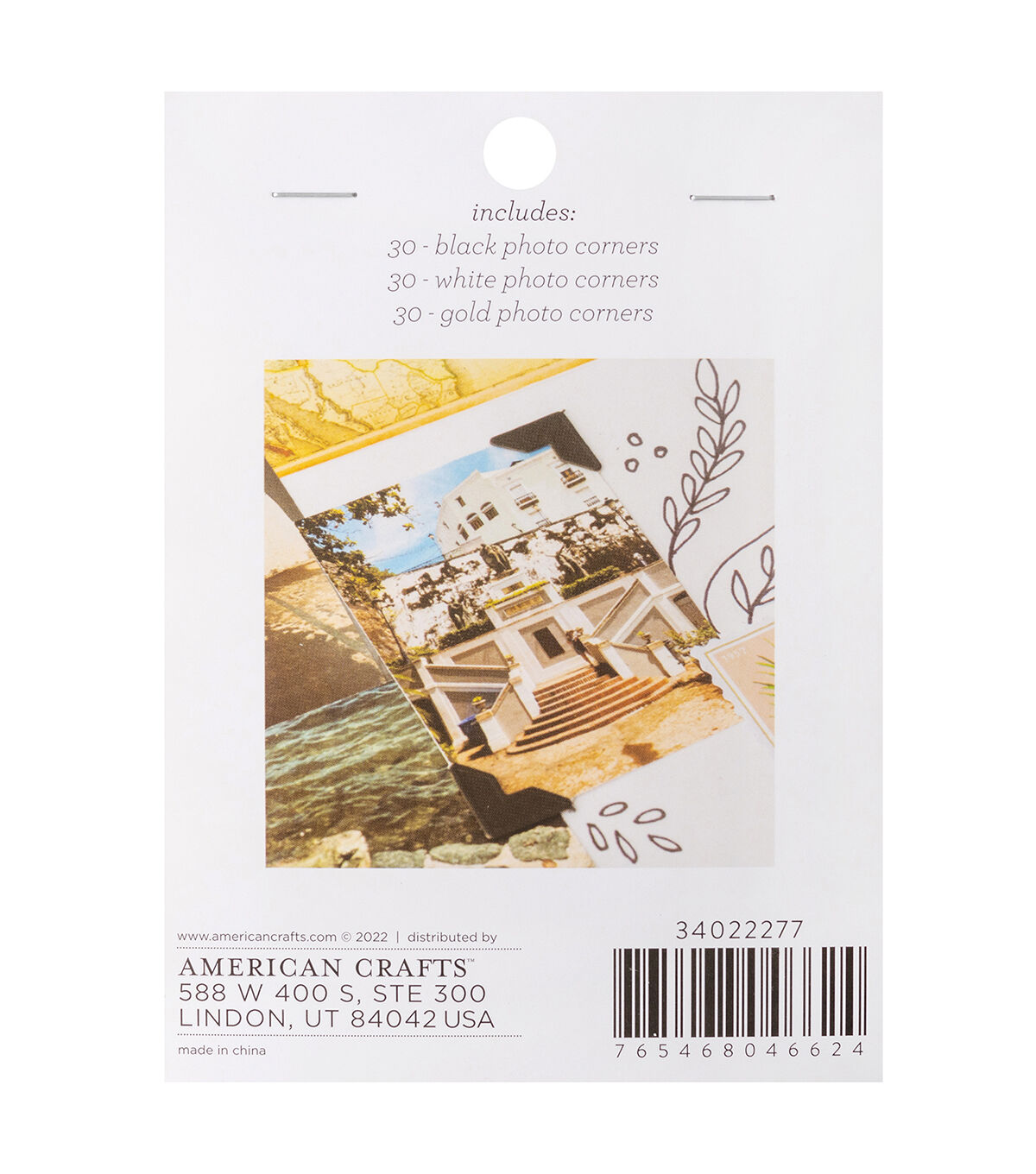 Photo corners are the perfect little detail for journals, scrapbooks, cards, and planners. Pair them with your favorite pictures, or even use them as tiny embellishments on page corners. This pAmerican Crafts kage includes 90 photo corner embellishments in a vibrant gold foil finish.