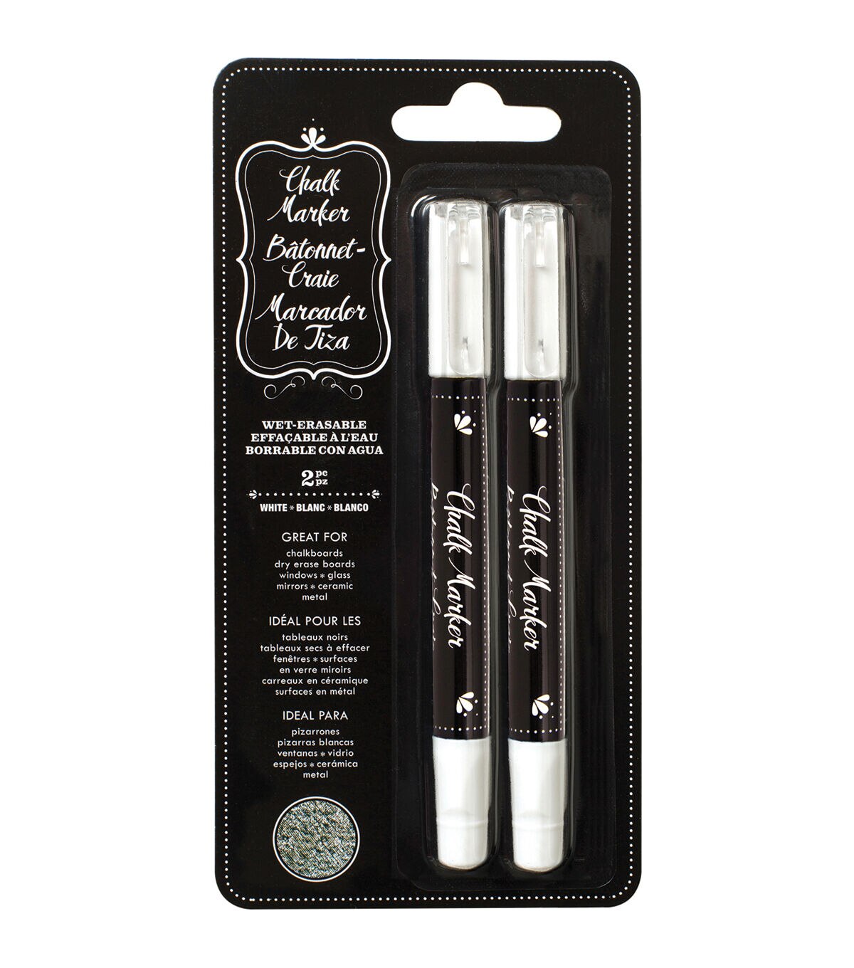 - Includes two white erasable chalk markers.