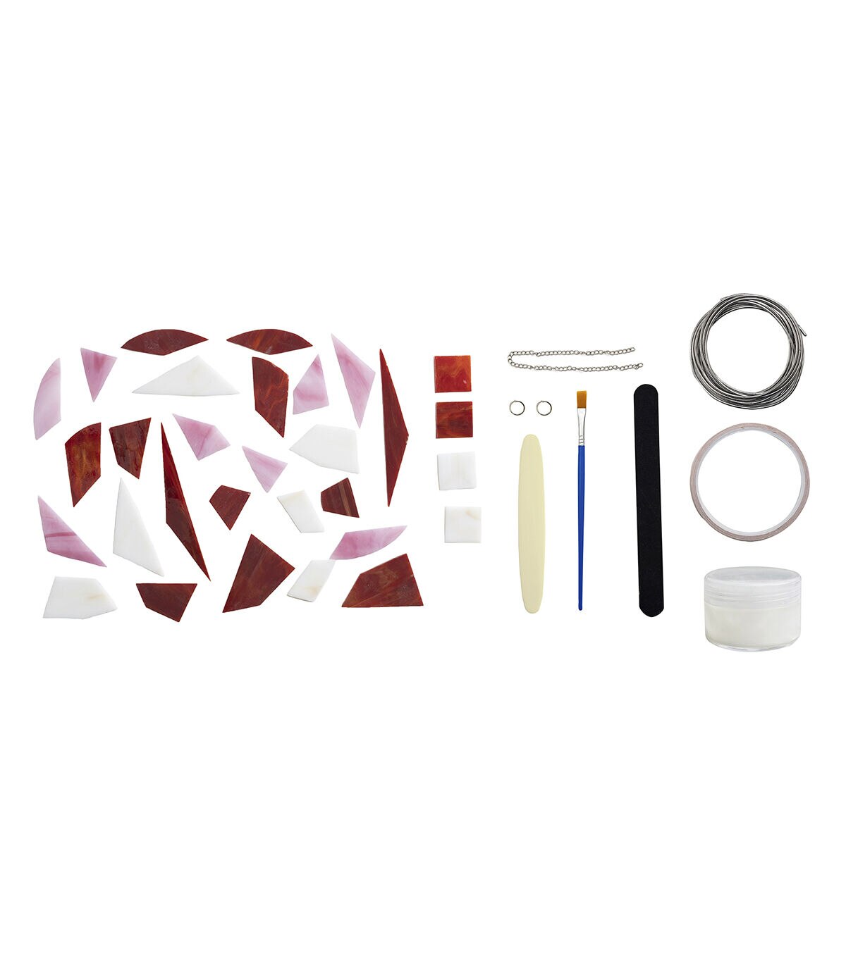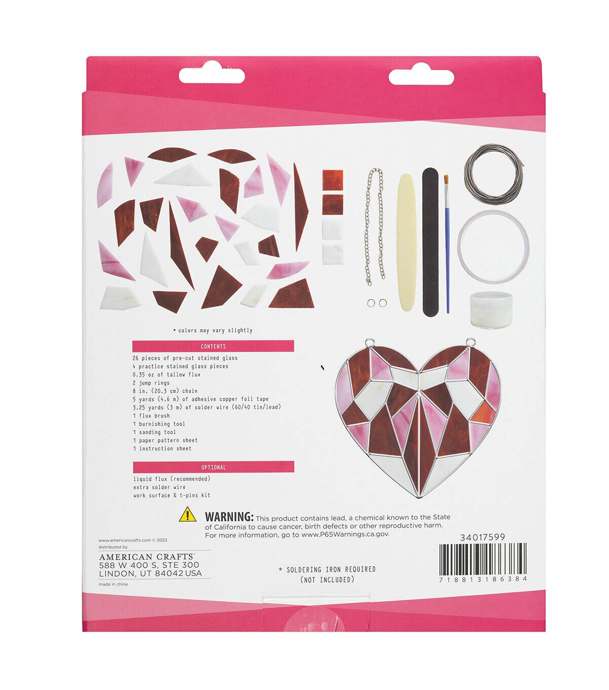 • INCLUDES: Pre-cut stained glass, copper foil tape, tallow flux, solder wire, easy-to-follow instructions, flux brush, burnishing tool, sanding tool, pattern sheet, jump rings, and chain