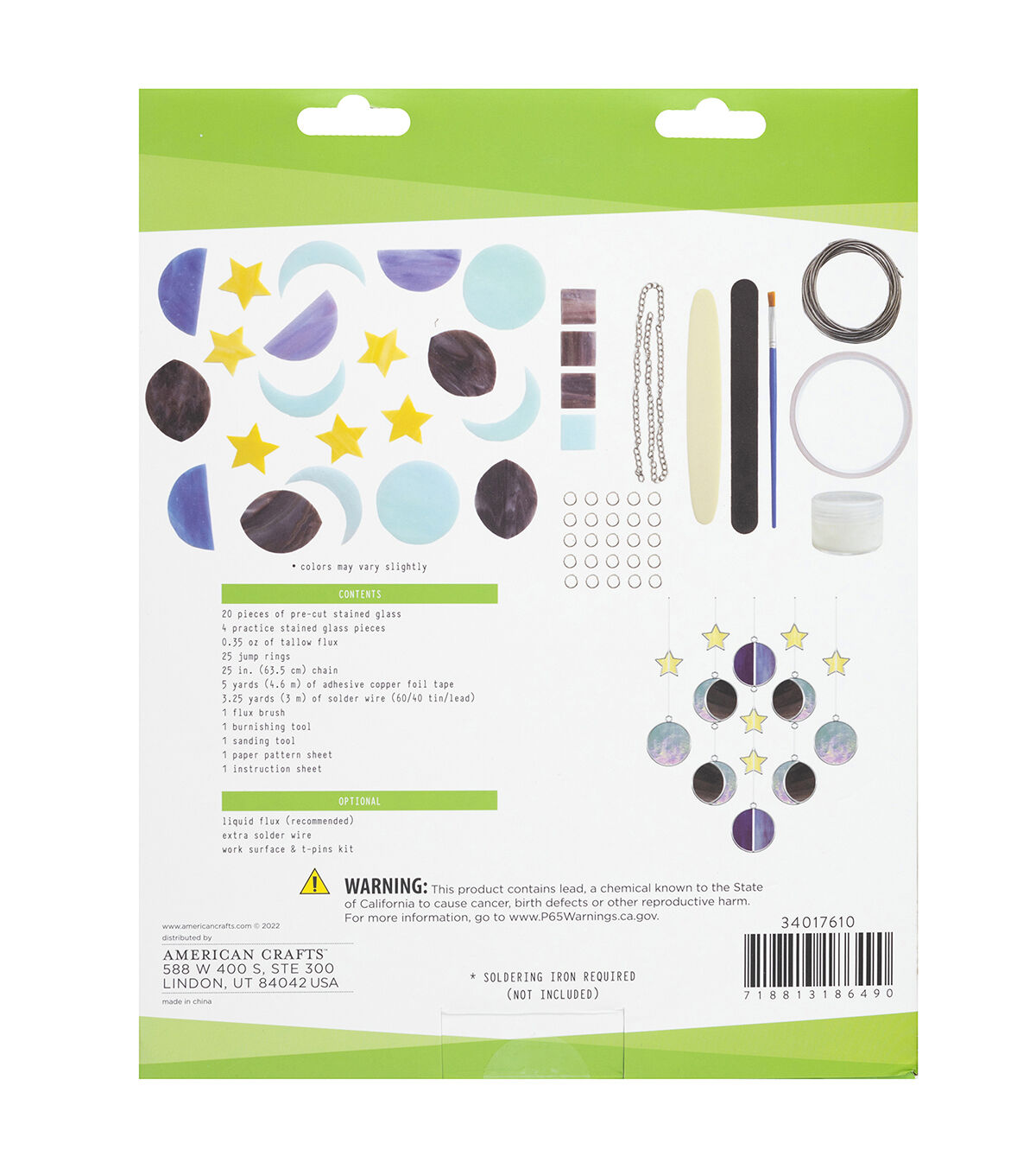 • INCLUDES: Pre-cut stained glass, copper foil tape, tallow flux, solder wire, easy-to-follow instructions, flux brush, burnishing tool, sanding tool, pattern sheet, jump rings, and chain