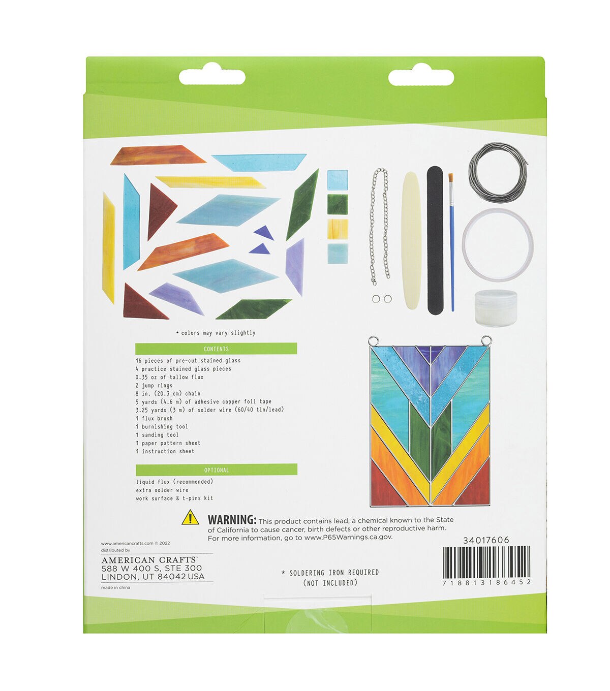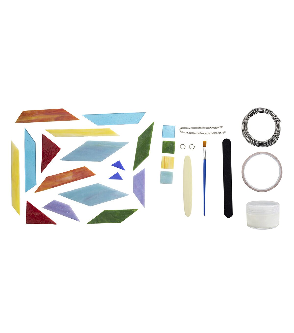 • INCLUDES: Pre-cut stained glass, copper foil tape, tallow flux, solder wire, easy-to-follow instructions, flux brush, burnishing tool, sanding tool, pattern sheet, jump rings, and chain