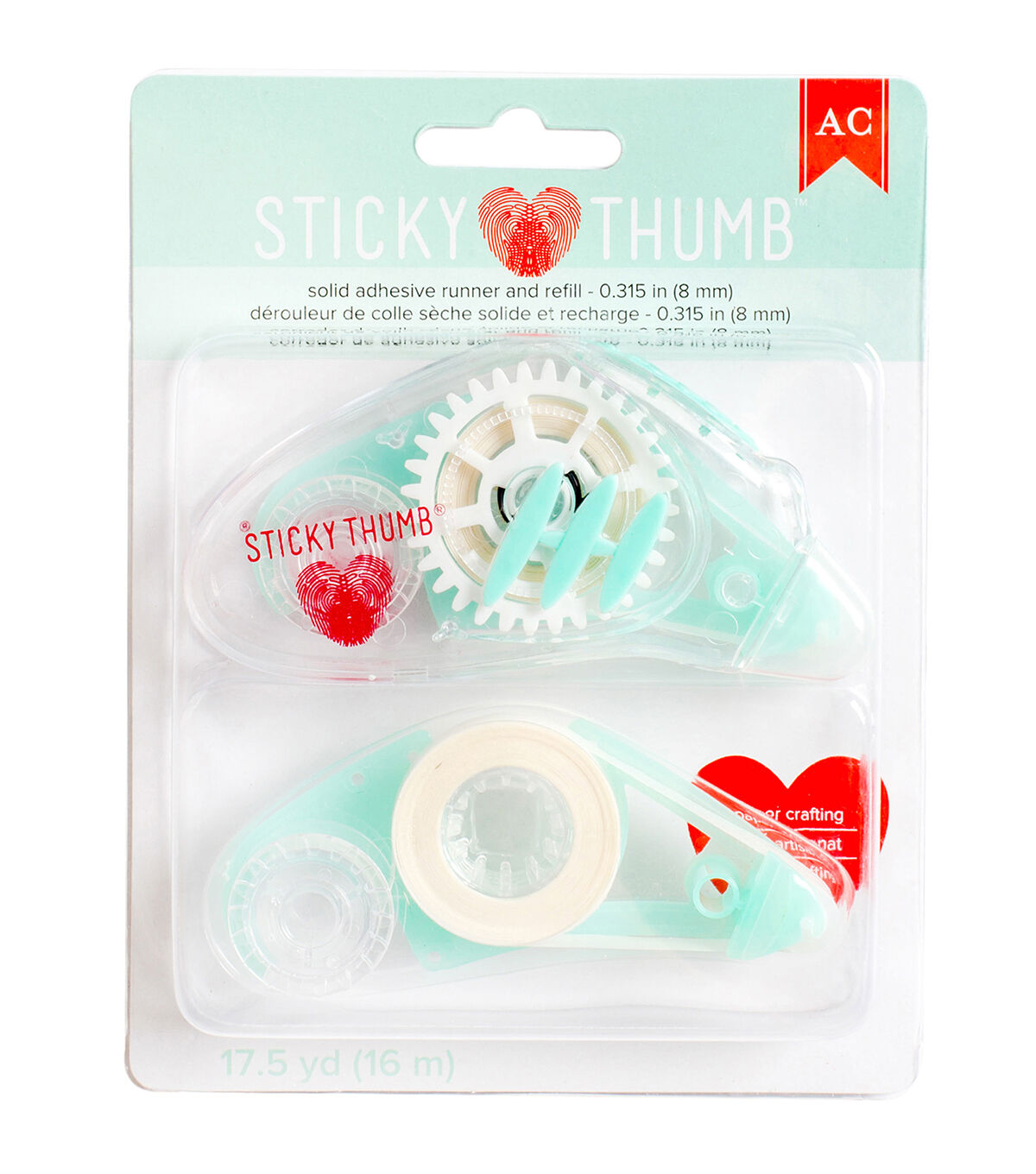 The Sticky Thumb Tape Runner is a permanent adhesive in an easy-to-use refillable dispenser. This package includes one adhesive runner with 8.75 yards of 6/19 inch adhesive and one refill.