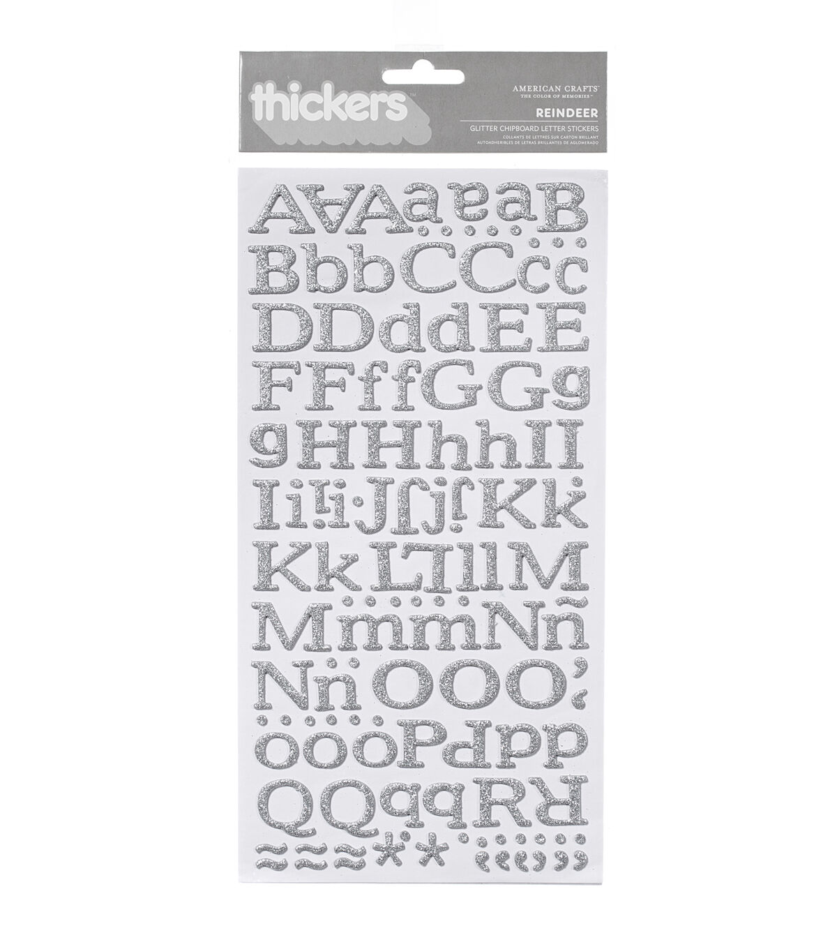 Embellish a variety of creative projects with personalized messages and text when you use the American Crafts Thickers Reindeer Glitter Chipboard Letter Stickers. These dimensional glitter stickers add an element of fun and creativity to scrapbooks, greeting cards, gift wrappings and tags, home decor, personal items and more. You can also use them to add names or initials to book covers, notebooks, fridge magnets and children's crafts. This package contains assorted acid-free chipboard stickers on two backing sheets.