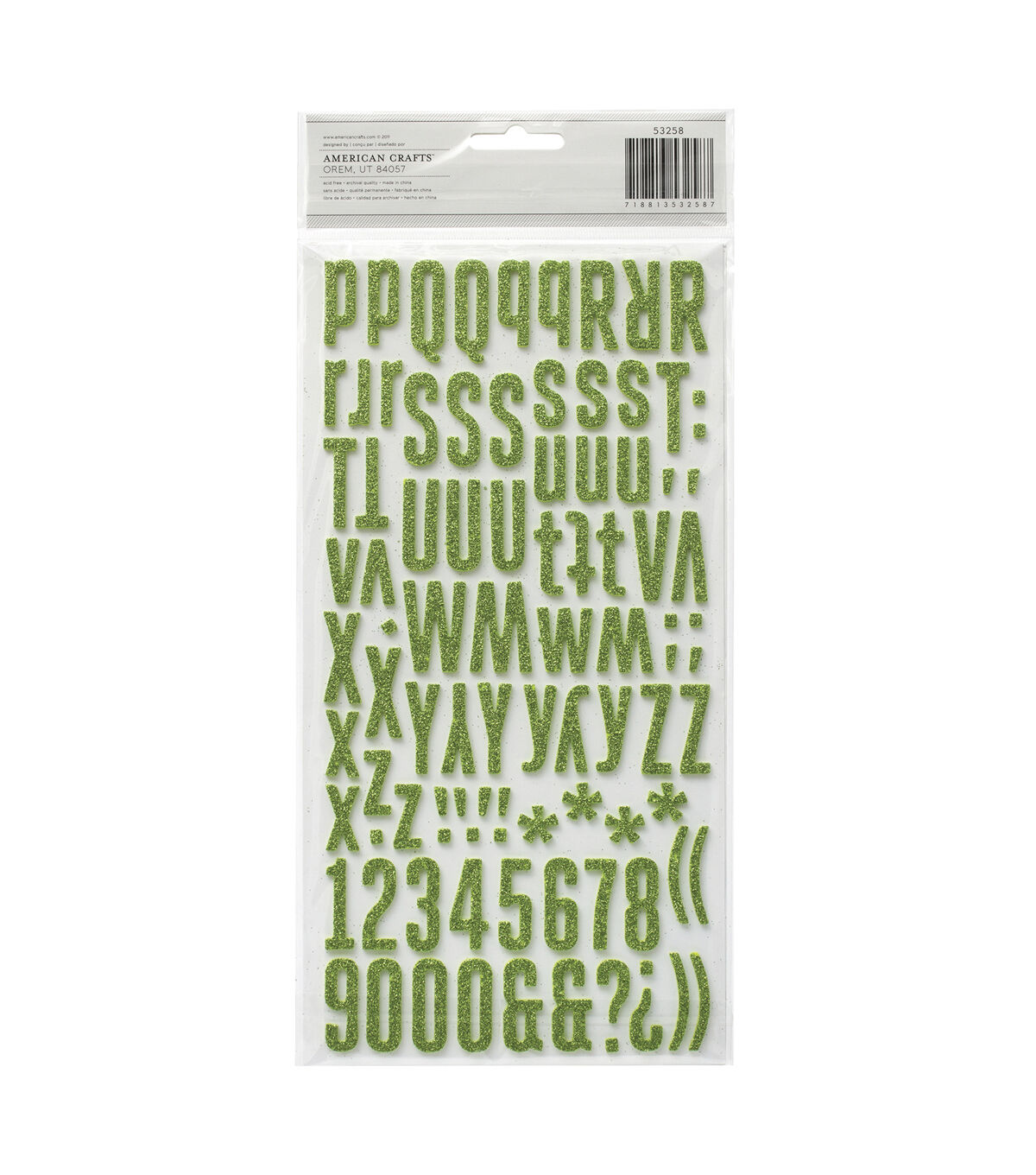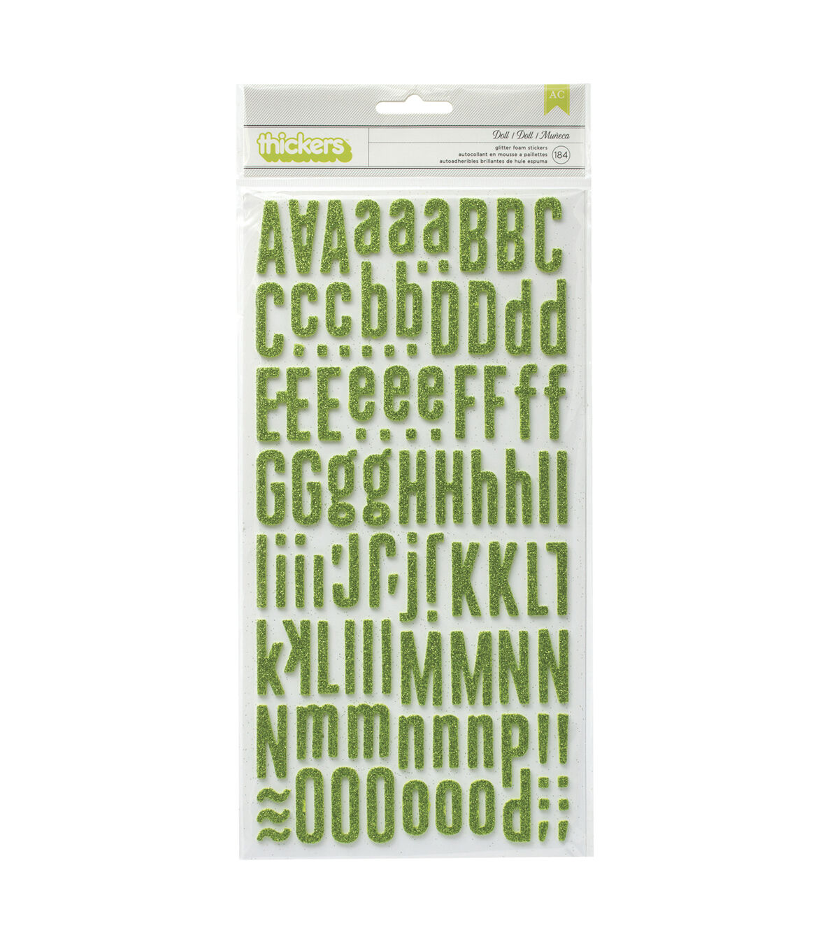 Create cute titles and headlines with these adorable alpha Thickers! This package includes letter, number, and punctuation mark Thickers in a fun green glitter finish to customize your pages.