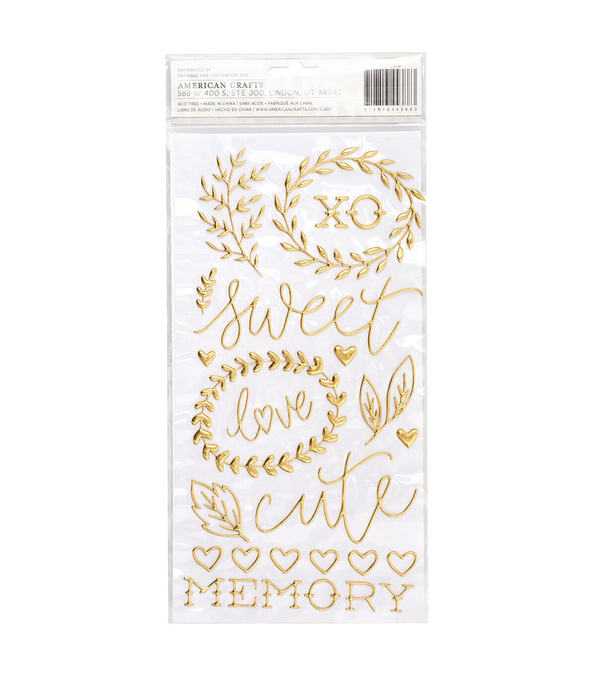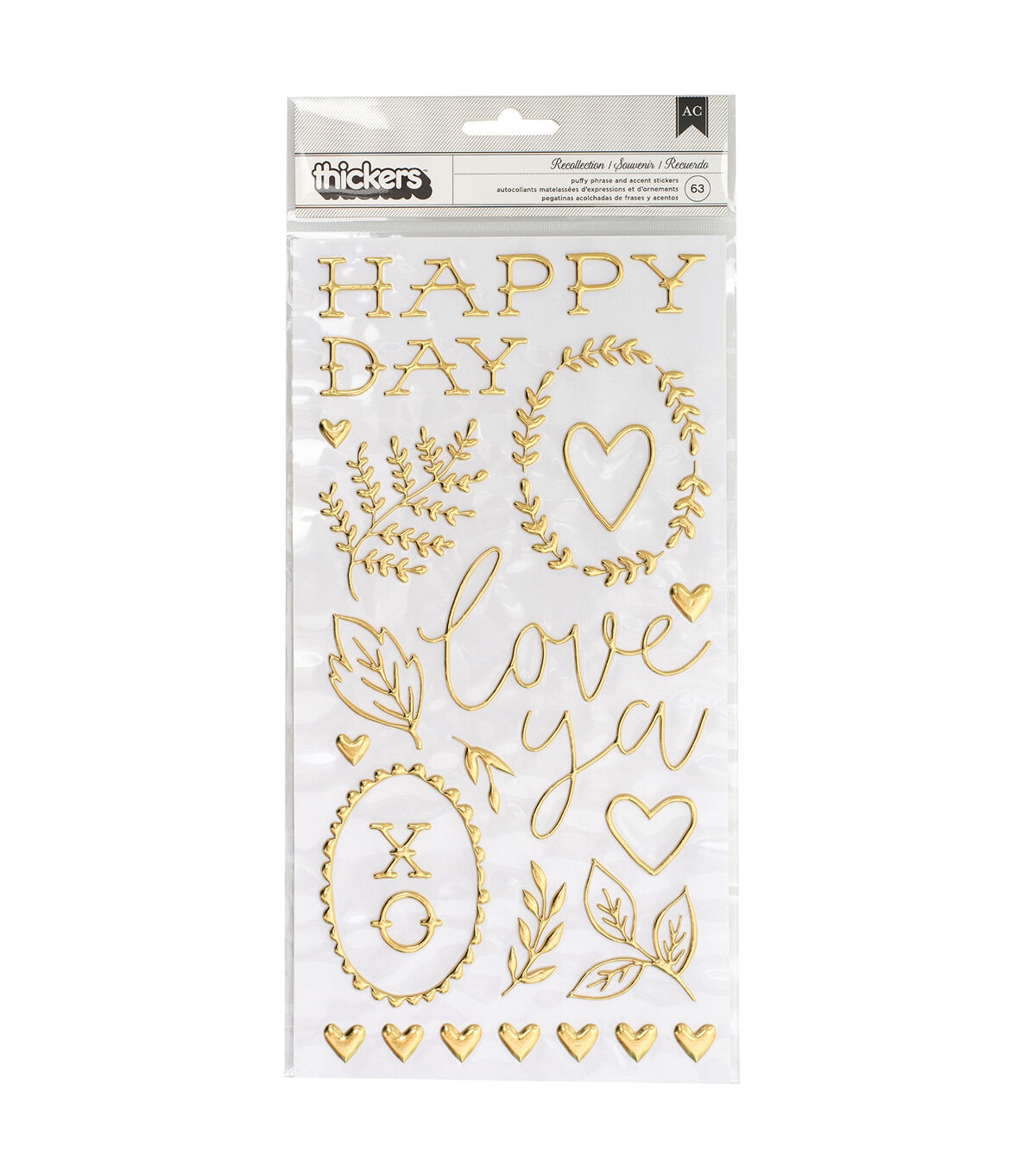 Add a lovely touch of gold to your pages with gold foil Thickers! This package includes 63 gold foil phrases and accents, perfect for scrapbook pages and journals.