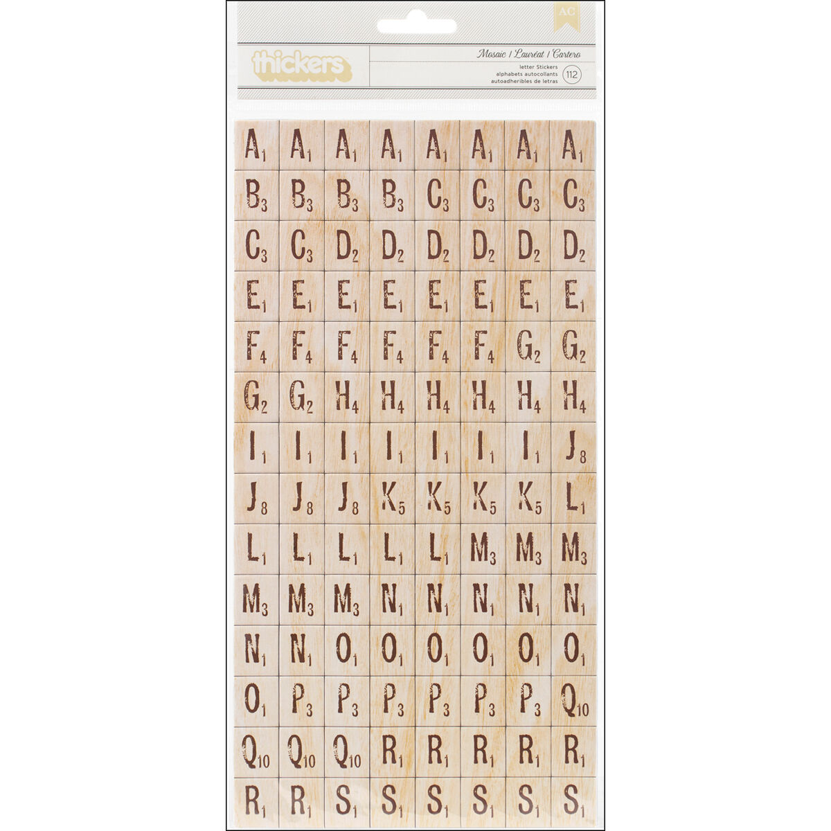 American Crafts Thickers Chipboard Mosaic Alphabet Stickers provide some additional dimension to any of your paper crafting projects. This package contains 112 mosaic letter, number, and punctuation mark stickers in a natural wood color.