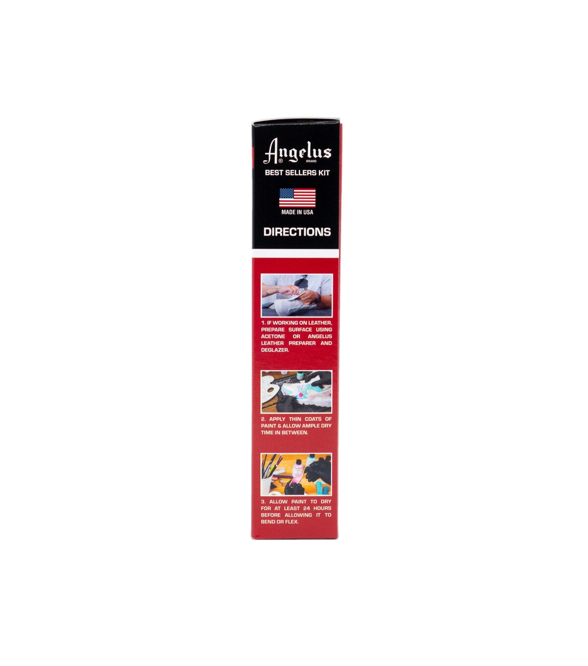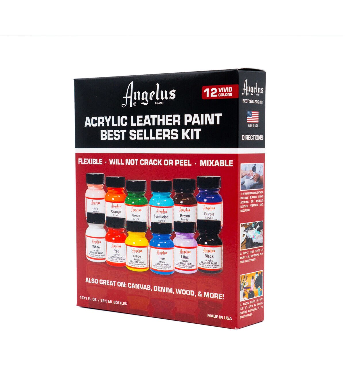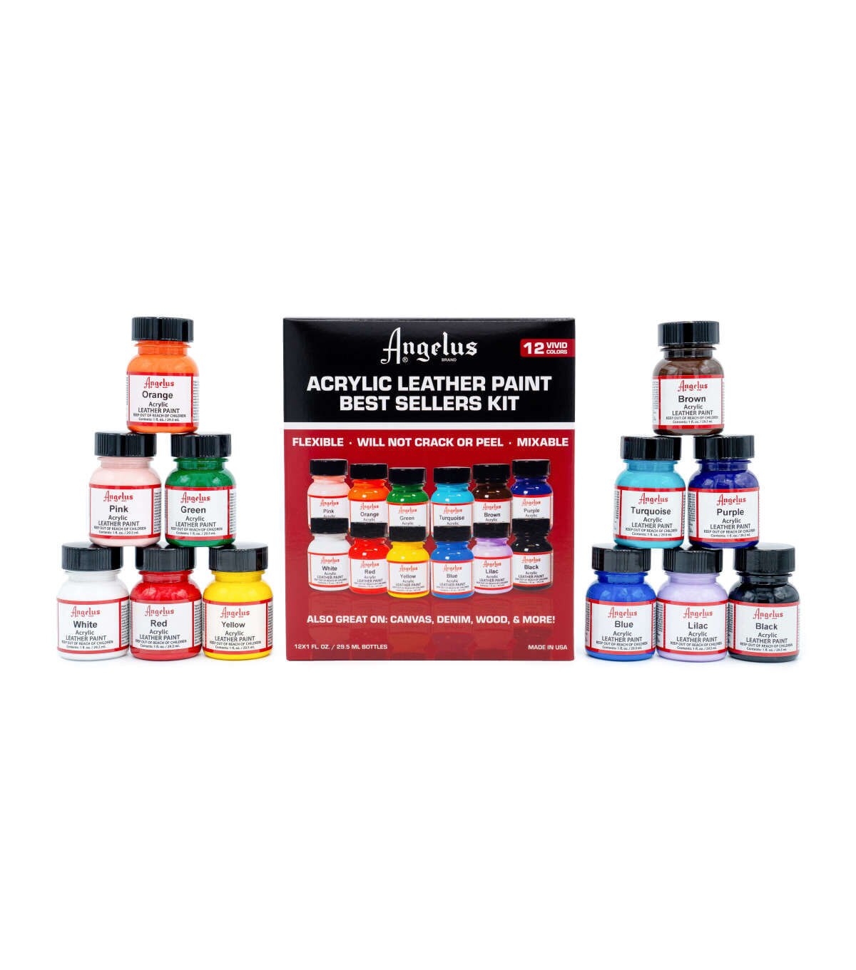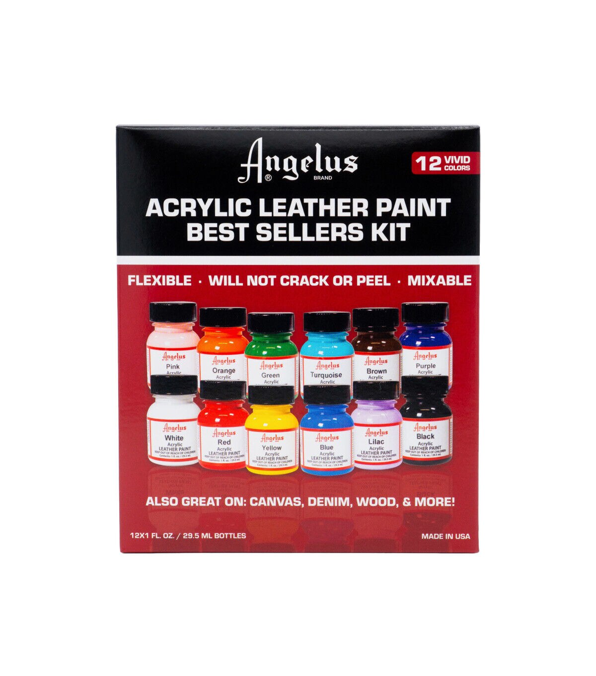 Angelus Acrylic Leather Paint is the leader in custom leather colorings. Paints can be blended together for countless custom colors. Apply with a fine brush, sponge and airbrush. Includes one each of the following 1 oz. Acrylic Leather Paints: Black, White, Red, Orange, Yellow, Green, Blue, Purple, Navy Blue, Turquoise, Lilac & Brown.