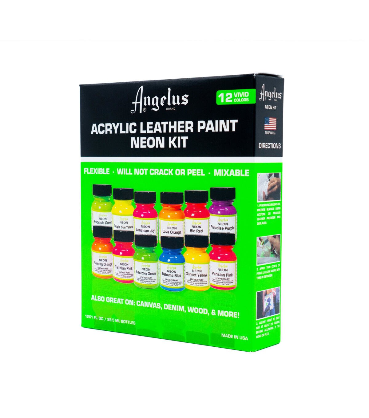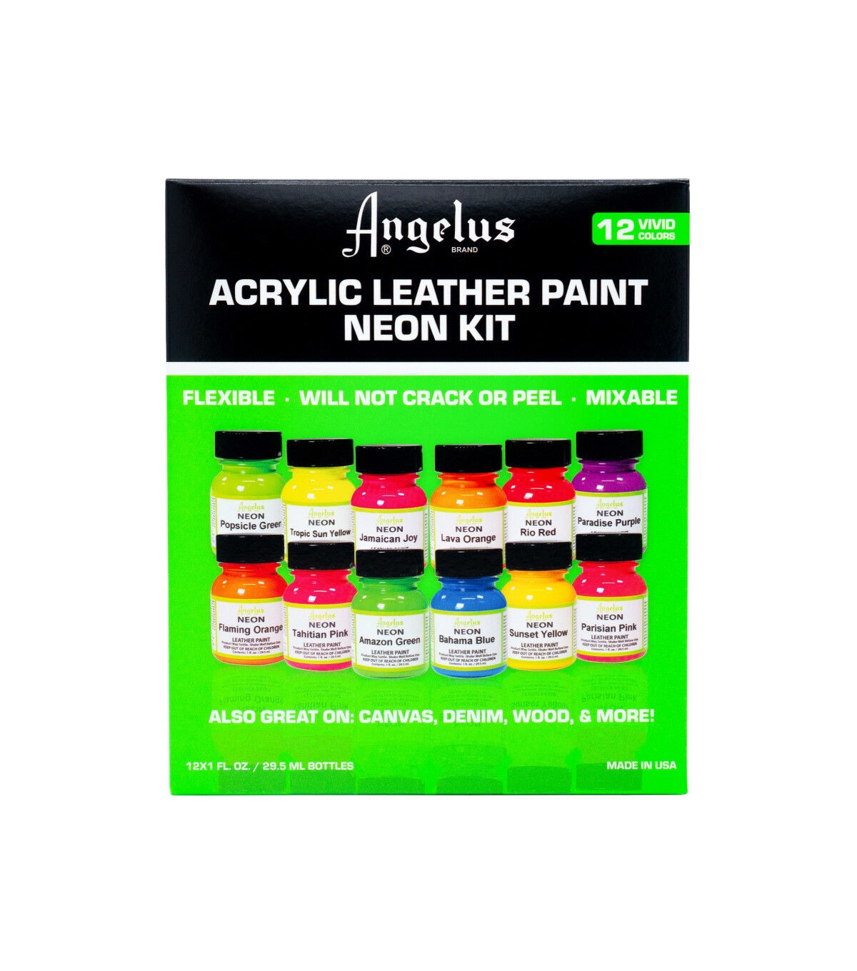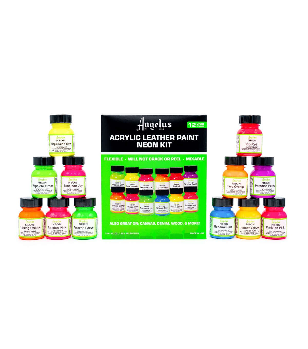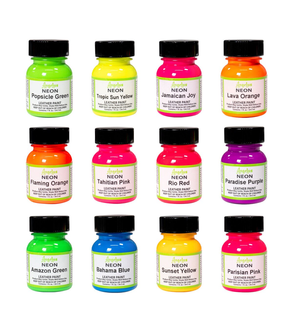 Save BIG when purchasing the complete line of Angelus Neon Colors. This Kit includes one each of the entire Angelus Neon Acrylic Paint 1 oz. line -- Amazon Green, Bahama Blue, Flaming Orange, Jamaican Joy, Lava Orange, Paradise Purple, Parisian Pink, Popsicle Green, Rio Red, Sunset Yellow, Tahitian Pink, & Tropic Sun Yellow.
