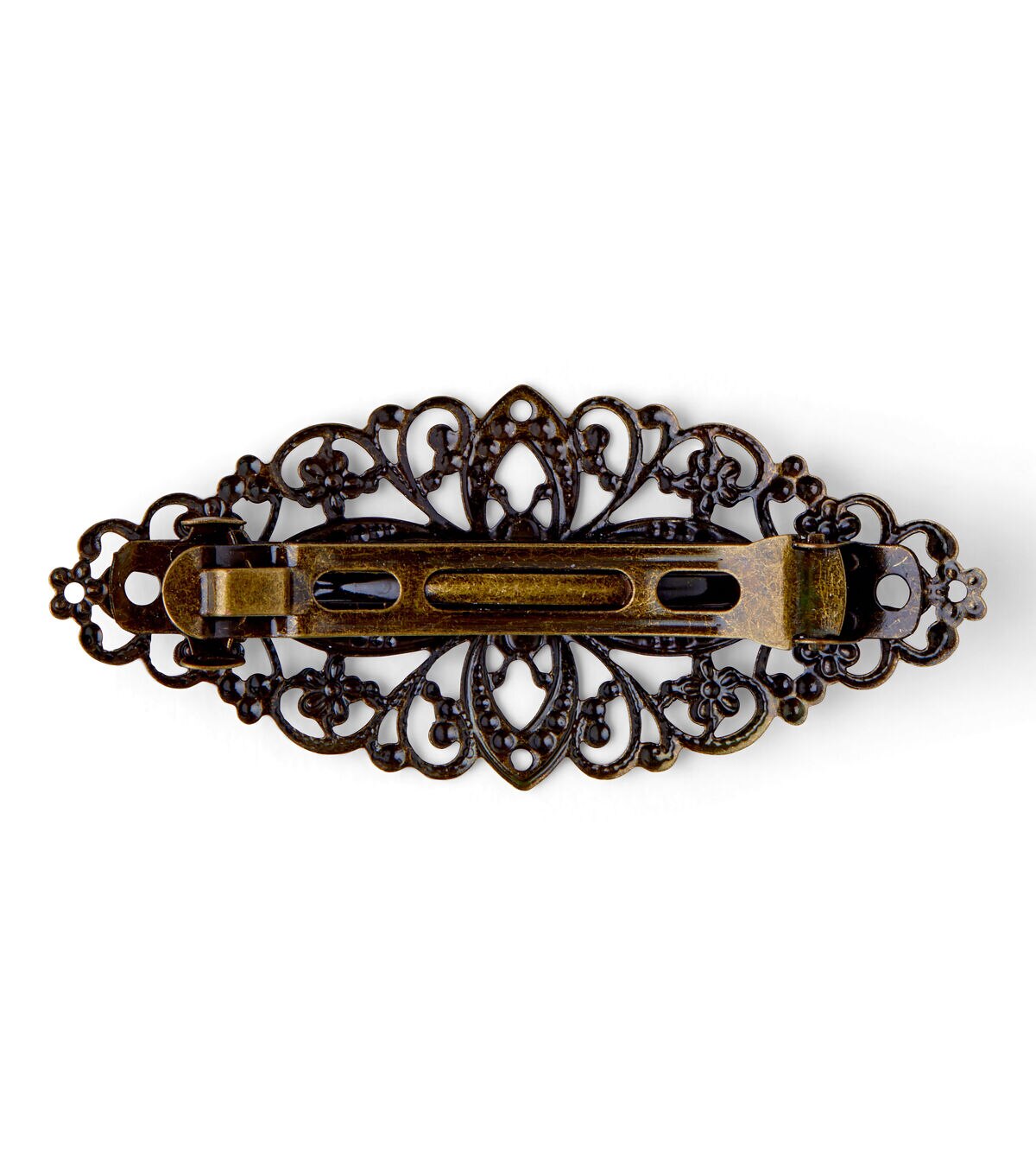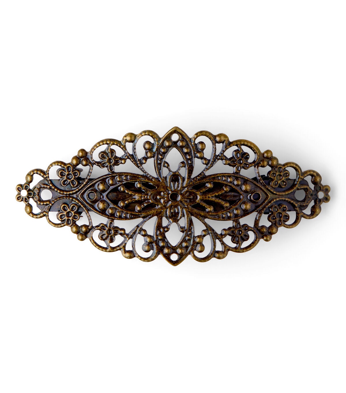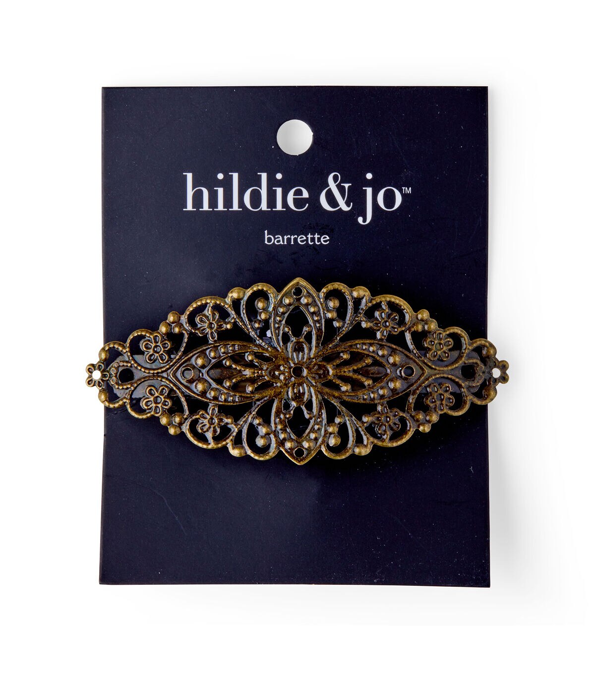 Let your hair make a fashion statement with this hildie & jo Open Scroll Antique Gold Barrette. The barrette has an open feel with a scroll and dot pattern and flowers in antique gold. This iron barrette features an auto lock closure that secures your intricate braids and hairdos in place all day long.