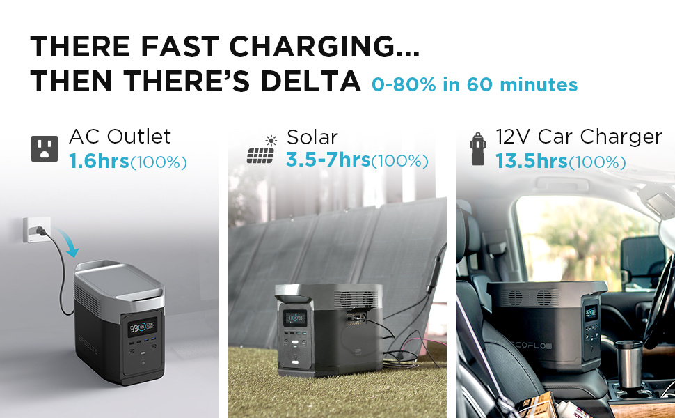 - 【Recharge From 0% TO 80% Within 1 Hour】EFDELTA can be recharged from 0% to 80% in 1 hour and to 100% in 2 hours. X-STREAM TECHNOLOGY: ECOFLOW patented X-Stream Technology empowers EFDELTA recharged at 10 times the speed of most portable power stations in the market with just a standard AC cable. (NO HEAVY, BULKY ADAPTOR or BRICK).