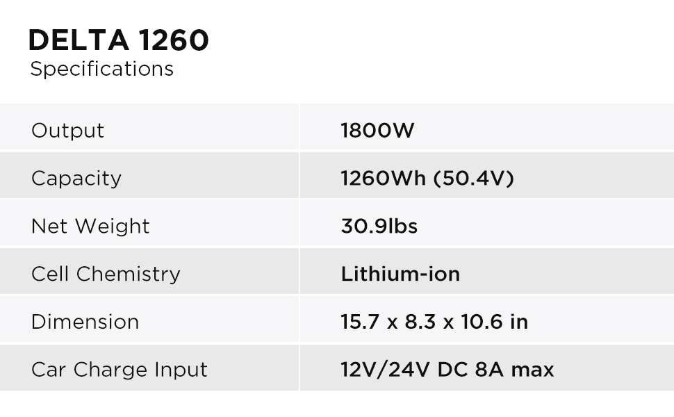 - 【High Performance and Handy Power Source】DELTA is a portable power station with 1260Wh,which to meet different kinds of electricity demands outdoor usage for home, travel, camping, backseat on long road trips.