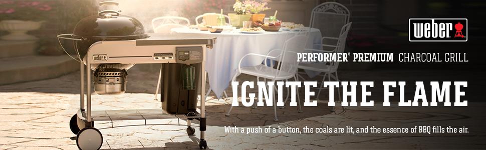 The Performer Deluxe grill features an exclusive Touch-N-Go gas ignition system that ignites charcoal briquettes with the push of a button. Especially handy is an LCD countdown cook timer with a large readout . The timer attaches to the grill or can be easily removed if you'd prefer to take it inside or keep it with you. The grill is outfitted with innovative heavy-duty Gourmet BBQ System cooking grates, a 2-part grate system that may be used in tandem with Weber's Gourmet BBQ System cookware collection. The grill's classic porcelain-enameled bowl and lid with a One-Touch Cleaning system and high capacity ash catcher make clean up hassle free. Storage options are plentiful with the CharBin storage container which protects your charcoal from the elements and a sturdy painted metal table is right at hand while grilling. Also features a wire bottom shelf, no-rust aluminum vent and a glass-reinforced nylon handle. Uses disposable 14.1 or 16.4 oz. LP cylinders.