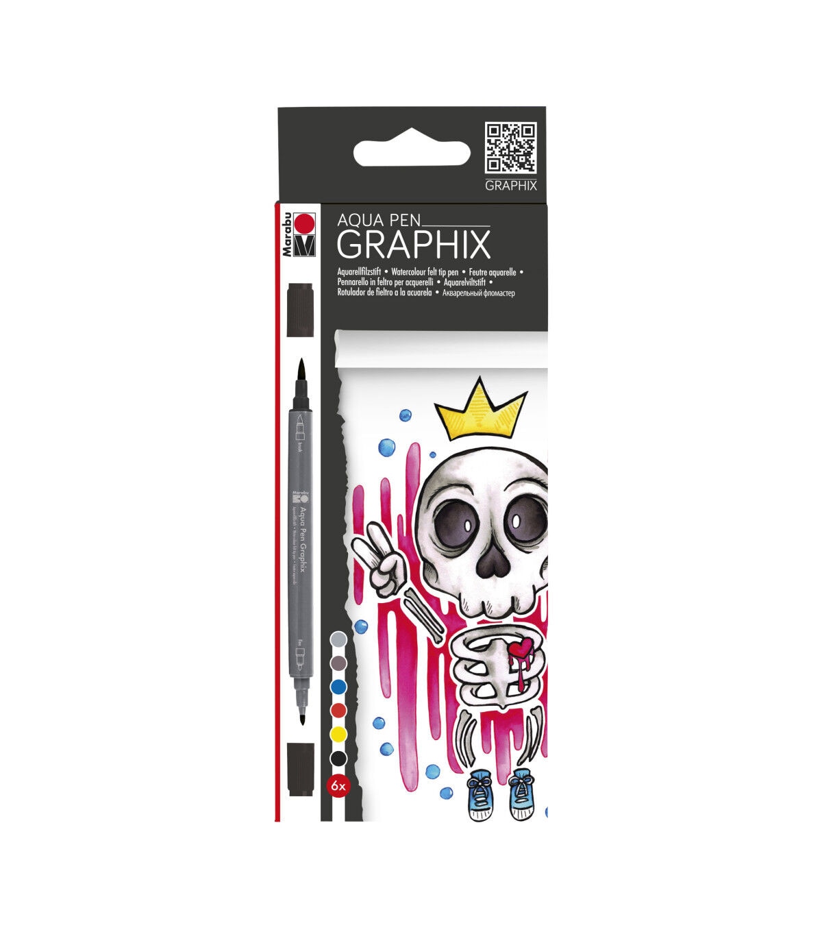 Let your imagination run free! Aqua Pens are versatile watercolor pens in a vibrant array of colors. Designed especially for painting on watercolor paper, water-based Graphix Aqua dual-tip pens offer water-based pigment ink in a range of brilliant colors. Use the contour tip for details and crisp lines or the flexible brush top to apply color. Draw or color lines and solids as you would with any marker, or blend and spread the color with a damp brush for paler hues and shading. The King of Bubblegum 6-Color Set includes black, yellow, light vermilion, smoky quartz, azure blue and gray.