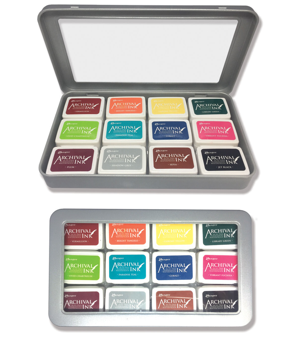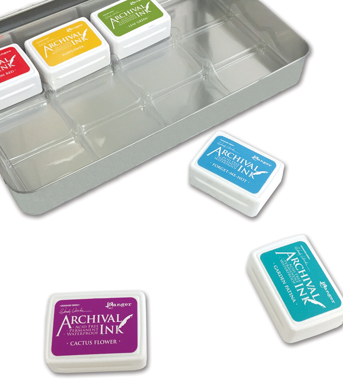 Organize and transport Ranger's Mini Archival Ink pads easily in this compact, clear windowed hinged tin. Includes removable insert tray.