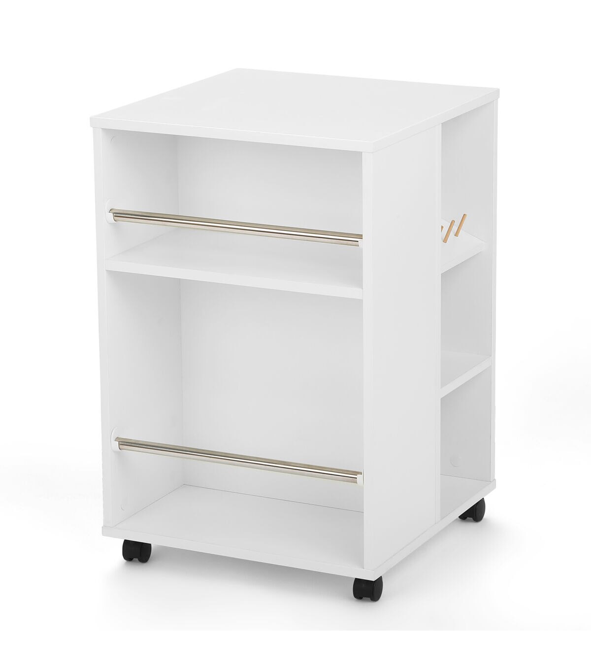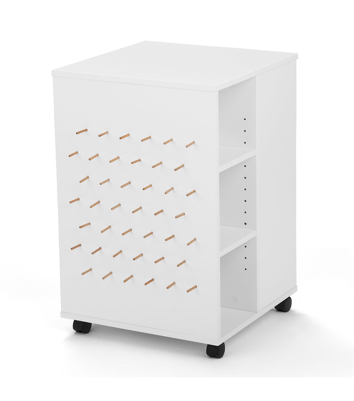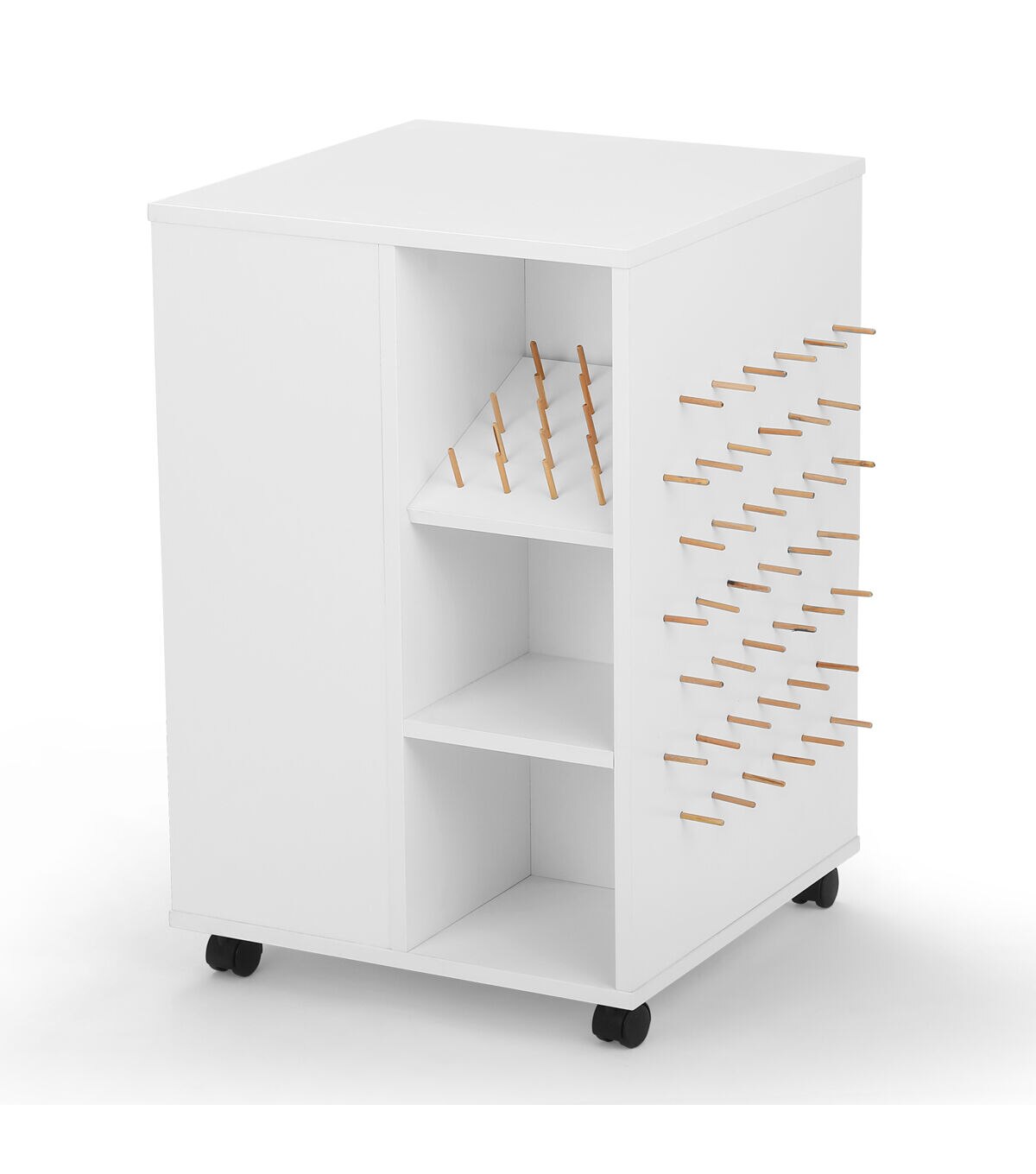 Arrow Cabinets Storage Cube has a durable design with composite body construction and a white mar resistant melamine laminate that will last a lifetime. Each side of your four-sided Storage Cube offers storage and organization for all sorts of sewing and crafting accessories. You’ll find plenty of storage with three adjustable shelves on one side while the opposite side has one shelf dedicated to 18 thread spindles and two more storage shelves. Spin your Cube around to reveal 42 removable thread and bobbin holders with varying lengths to hold thread, bobbins, scissors and any other craft accessory allowing you to customize to your needs. The last side of your Storage Cube features two rods for hanging and storing ribbon, yarn or embroidery interfacing. Plus behind the rods is 7-inch of more storage space for books, fabric or baskets. Your Storage Cube has 4 lockable casters that allow you to spin it around and move it where you need it.