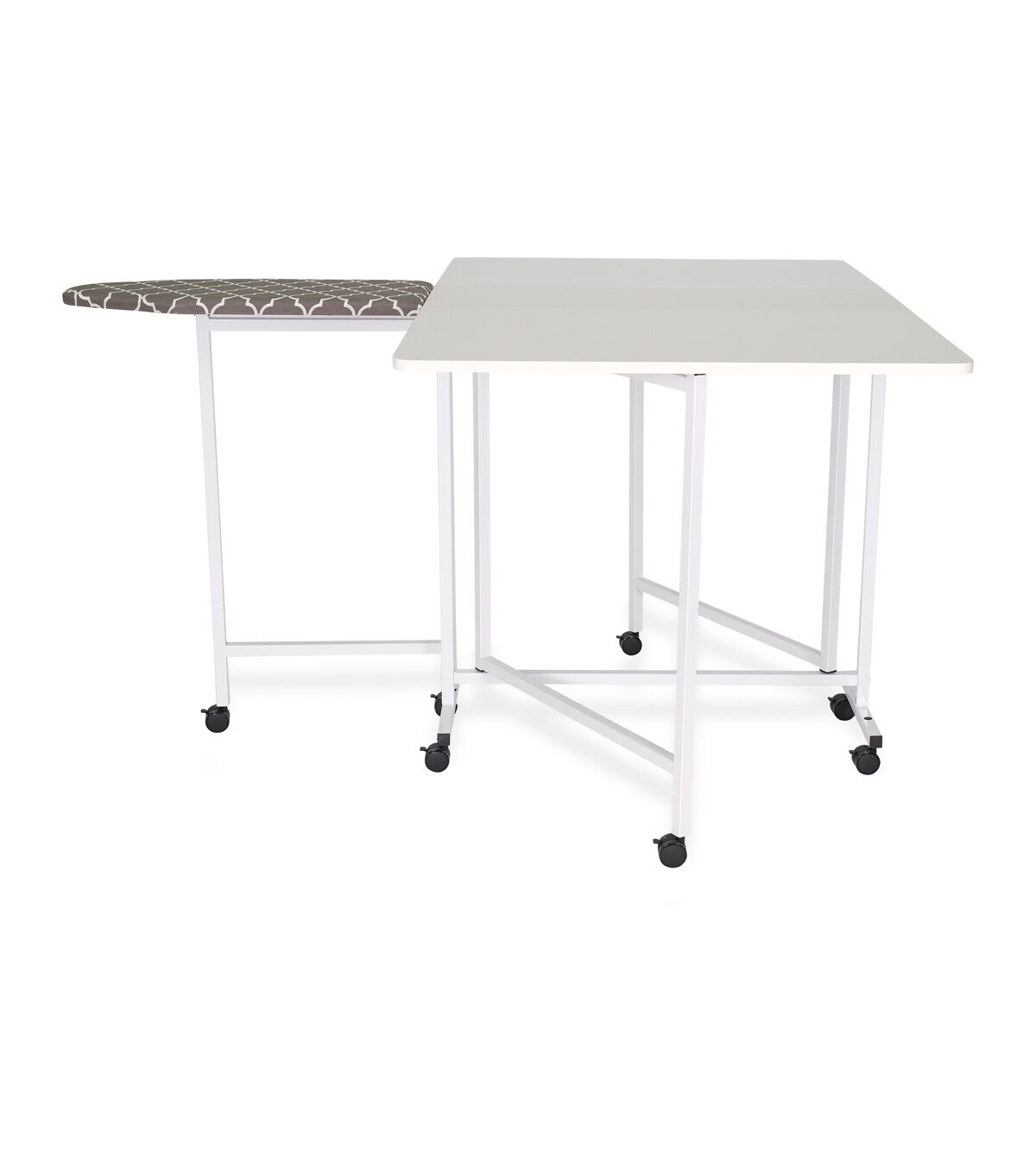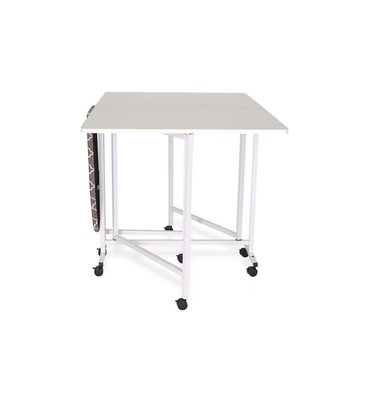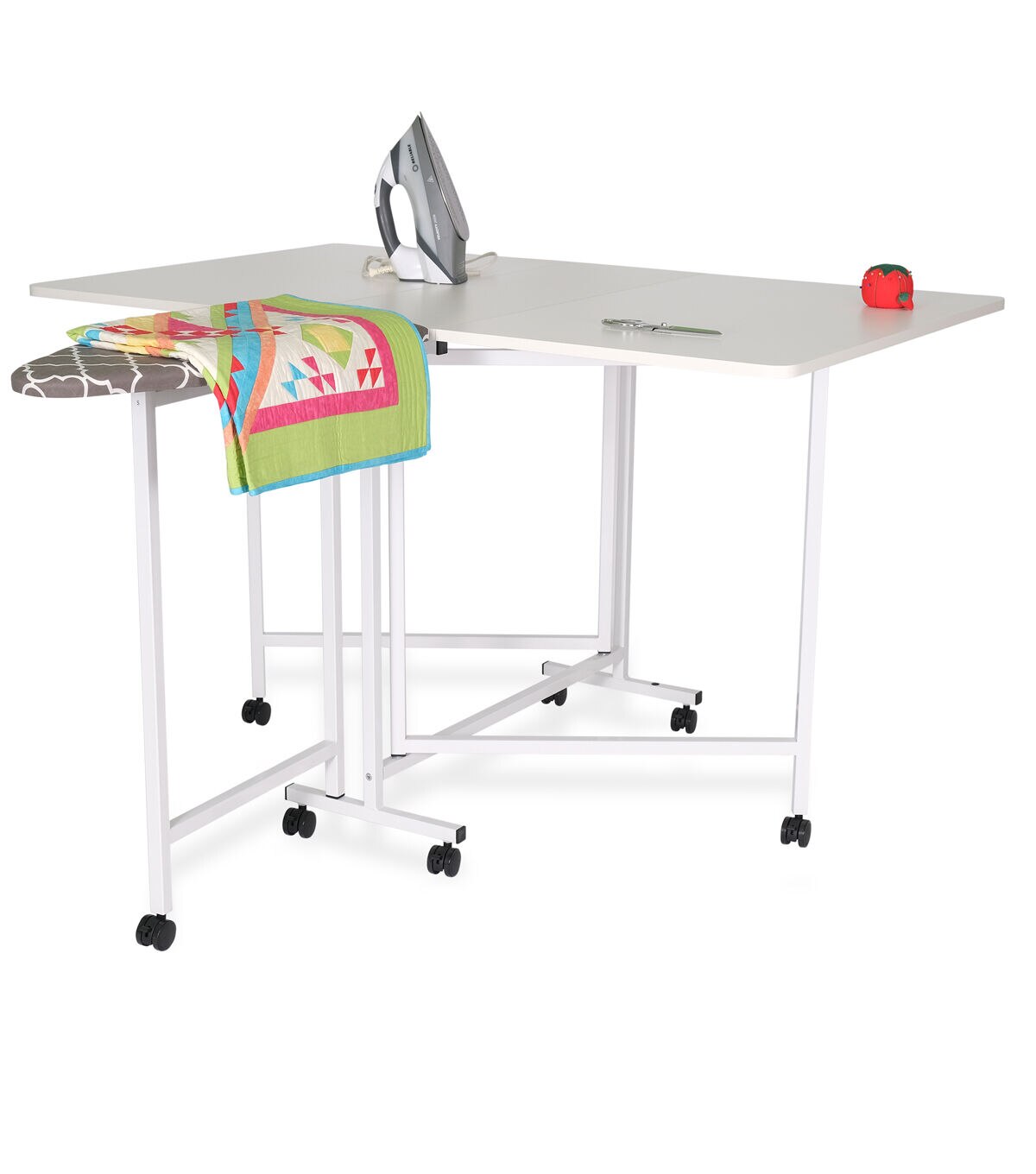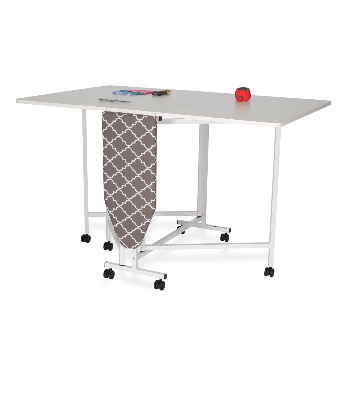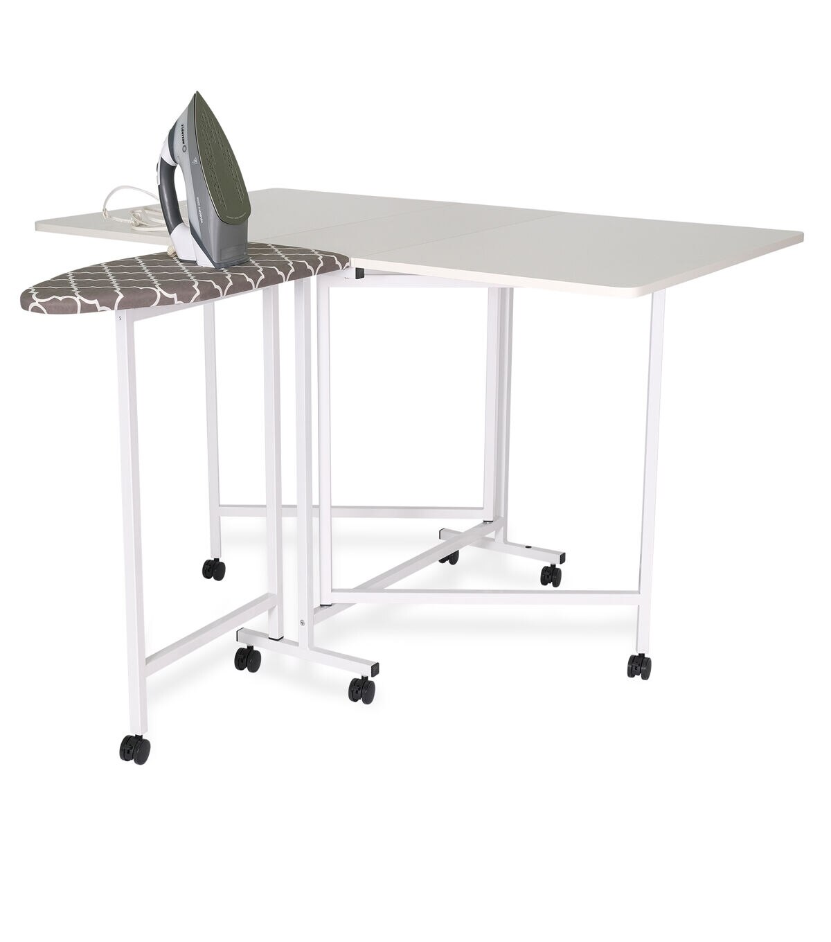 Meet your new 2-in-1 cutting and ironing workstation! Millie is a one-stop shop cutting and pressing table designed to consolidate your working area and add convenience to your cutting project workflow. Millie features an expansive 63″ x 39″ cutting area, a built-in folding ironing station, and heavy-duty casters for easy mobility in your sewing area! The best part? When not in use, Millie folds into a compact, home-friendly footprint for easy storage!