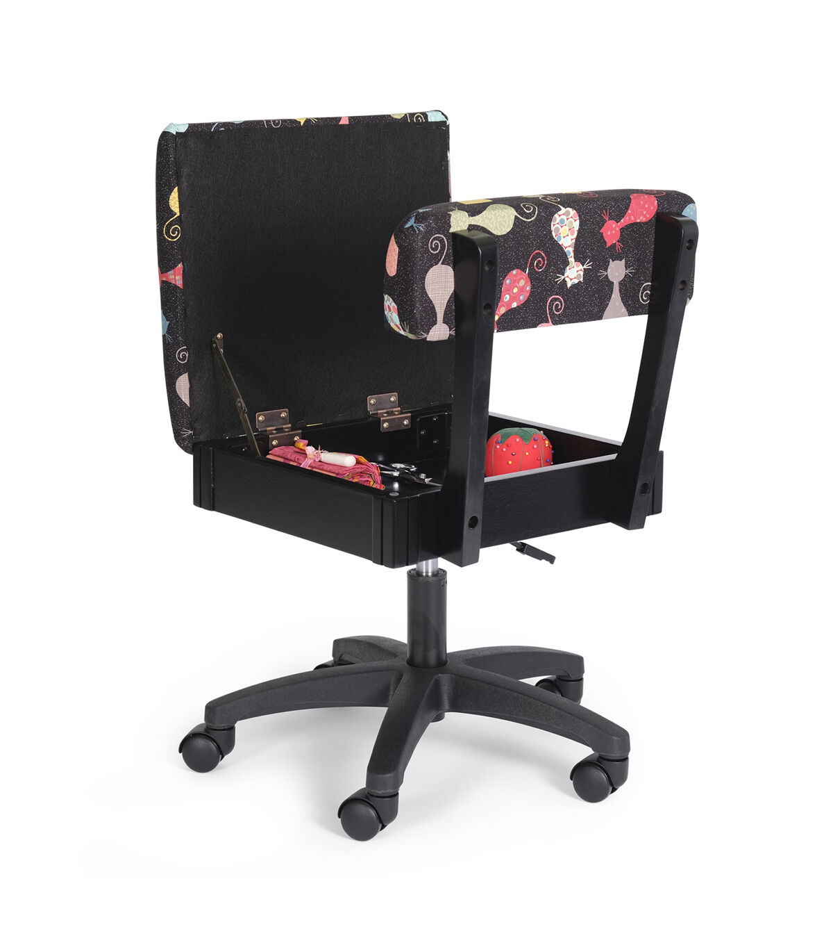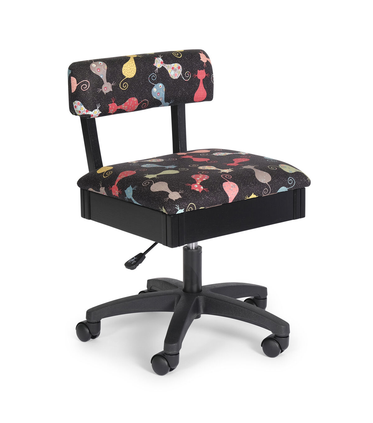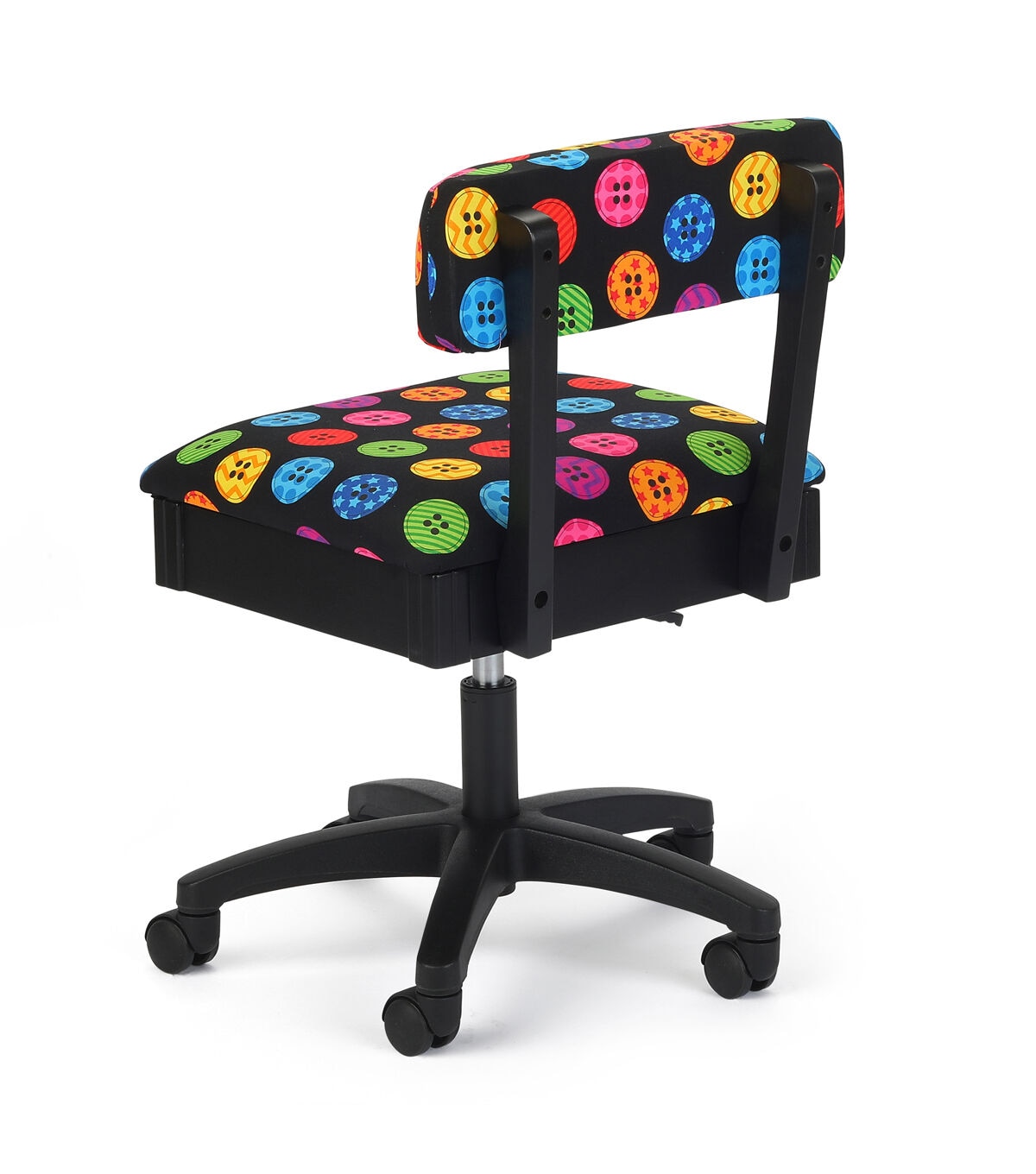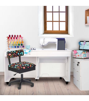 The Arrow Adjustable Height Hydraulic Sewing and Craft Chair provides comfort and ergonomic support, so you can sew all day long. Position the chair at just the right height with a simple press of a lever, and roll right up to center needle of your sewing machine on a sturdy star caster base with 5 casters. The chair’s heavy-duty cotton upholstery fabric is available in whimsicle patterns to match your personal style.