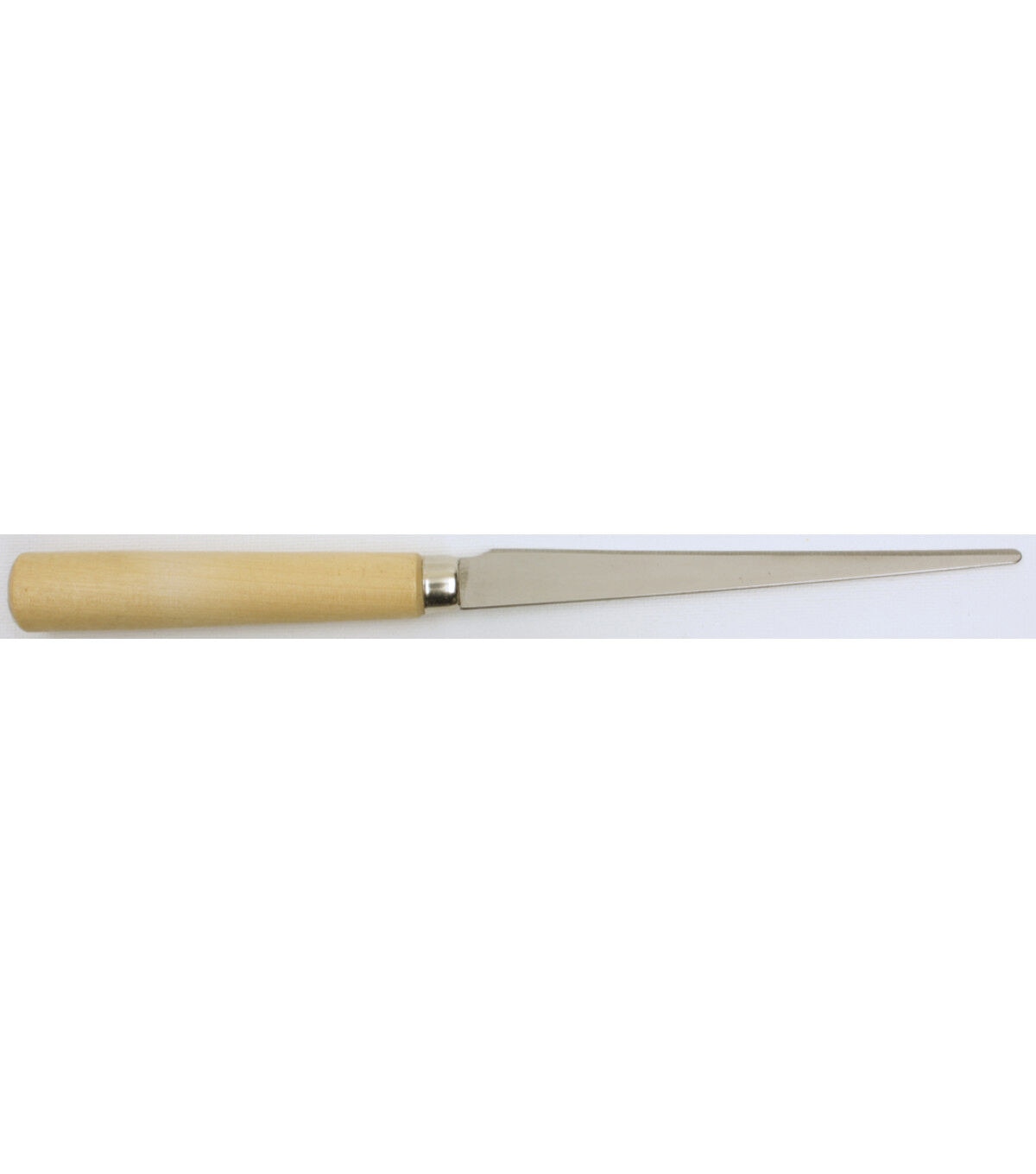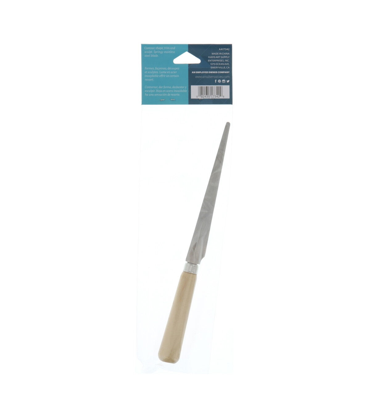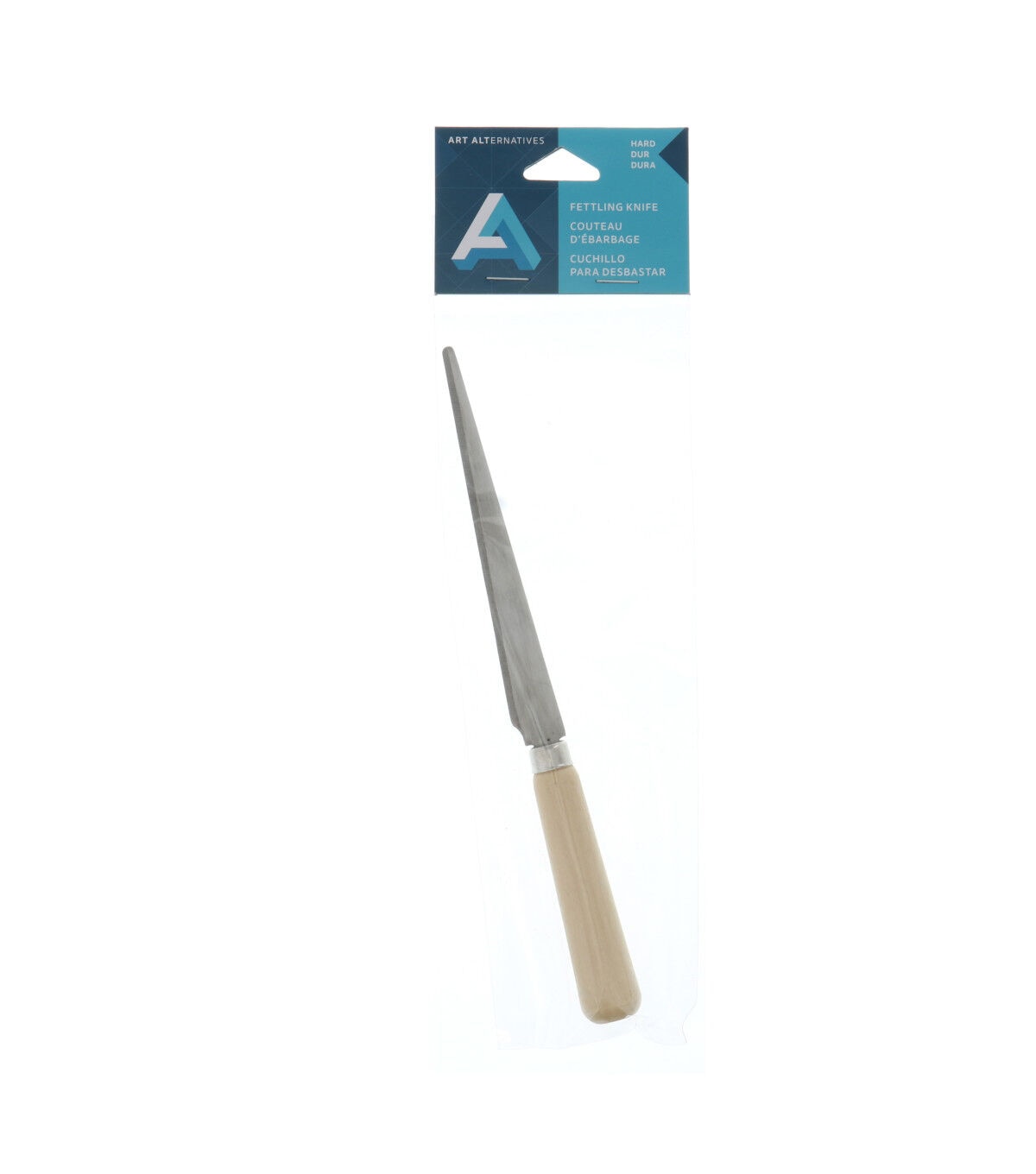 This fettling knife is a useful tool for potters, ceramicists, students and beginners. Sharp enough to trim leather hard clay but dull enough to safely use in the classroom with young children, this multi-purpose knife is ideal for carving and sculpting clay or trimming pour hole waste and removing mold marks on mold-made forms. This blade is "hard," giving it a firm, spring-like feel.