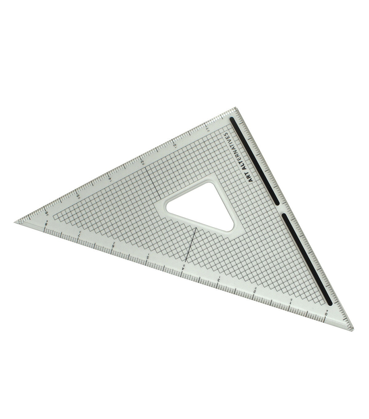 This clear acrylic triangle features grid markings including centering lines to facilitate scaled drawings, geometric compositions, and detailed linework. This is a multi-use tool, handy for measuring, drawing and cutting. Two edges are beveled for even line work, and the third has a stainless steel edge designed for cutting.