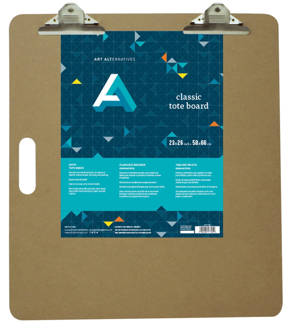 This portable 23" x 26" tote board makes an ideal surface for indoor or outdoor sketching and painting. It features an easy-carry cutout handle, two extra-sturdy Butterfly Clips for securing drawing pads and paper to the board as well as a heavy-duty rubber band to keep your chosen surface in position.