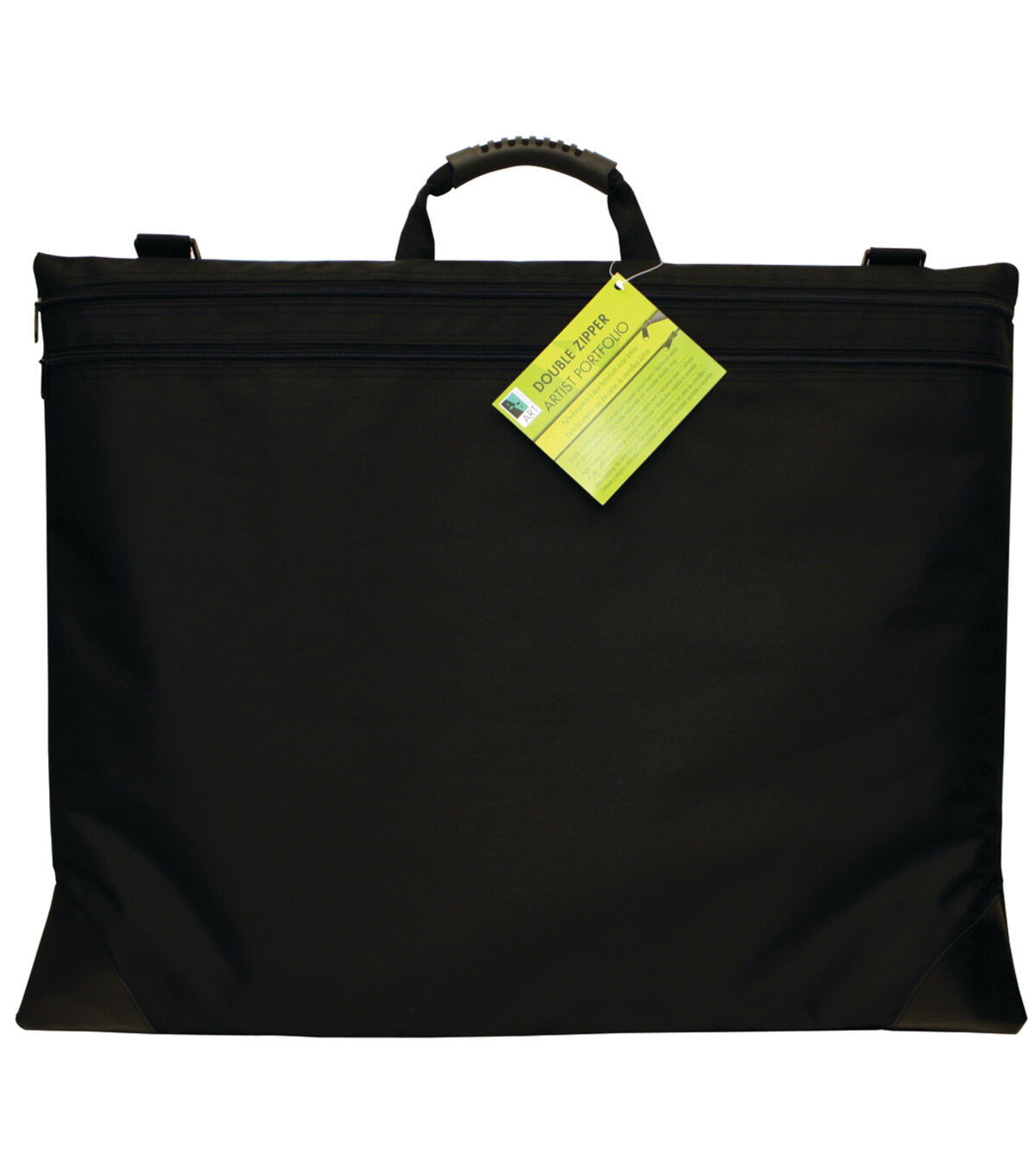 The Art Alternatives Double Zipper Artist Portfolio features a removable and adjustable shoulder strap with a no-slip shoulder pad, an ergonomic, comfort grip handle, and reinforced, bound seams for added durability. Imitation leather corner reinforcements provide stylish strength and two large zippered compartments create separate storage options for the artist. They are made of water-resistant nylon and sized two inches larger than stated dimensions in each direction.