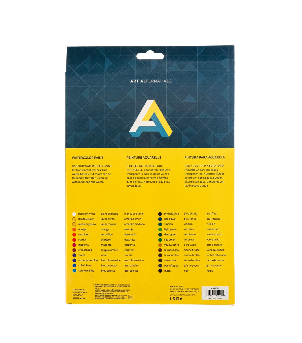 Economy Watercolor Paint Sets from Art Alternatives are ideal for beginners, students and value-conscious artists. These sets feature 12ml tubes of vivid colors which can be mixed with water. The 24-Color Set includes titanium white, lemon yellow, medium yellow, orange, vermilion, scarlet, magenta, crimson red, violet, ultramarine blue, cobalt blue, cerulean blue, phthalo blue, deep blue, viridian, light green, deep green, sap green, yellow ochre, burnt sienna, burnt umber, raw umber, Payne's gray, black and a paint brush.