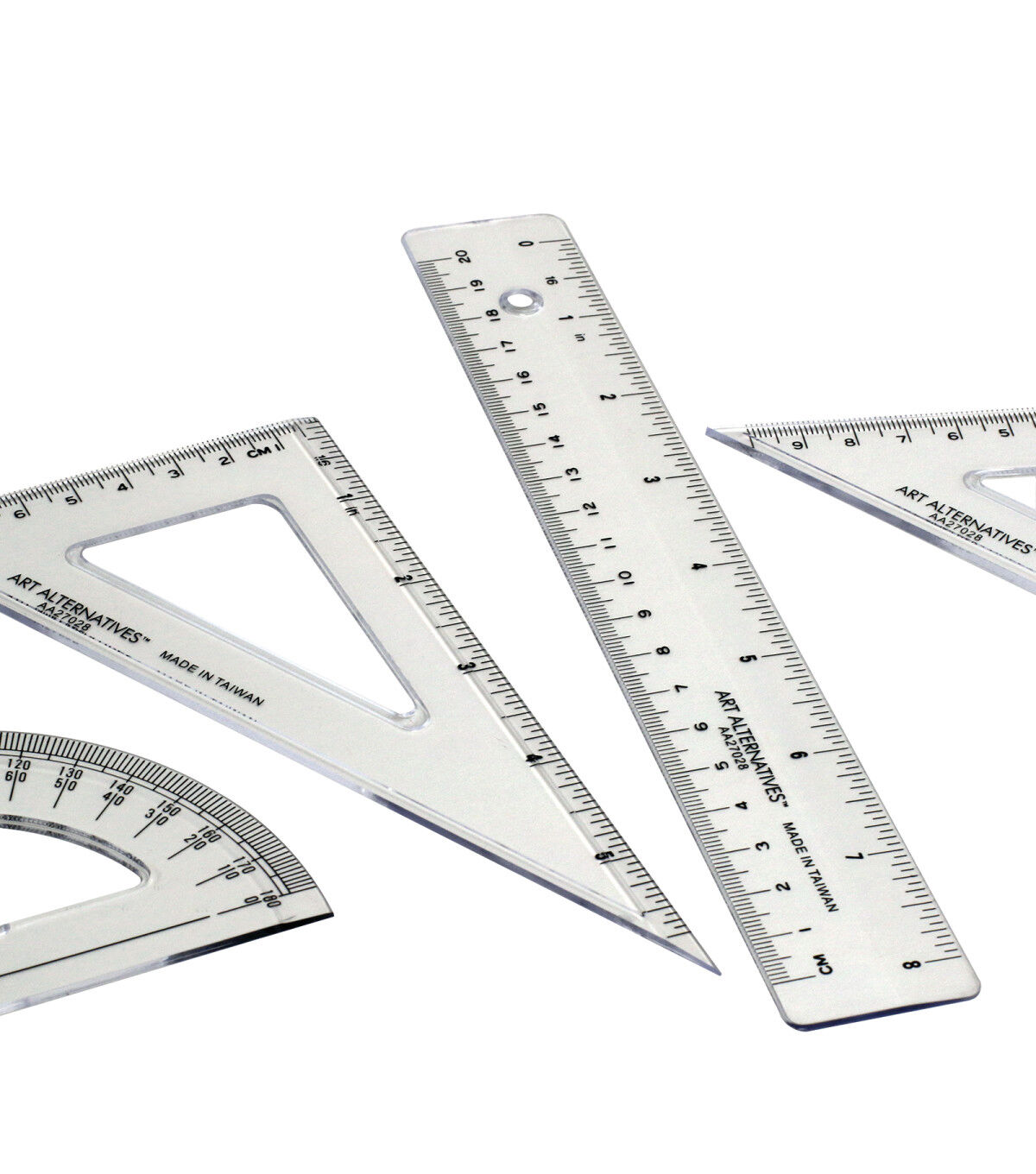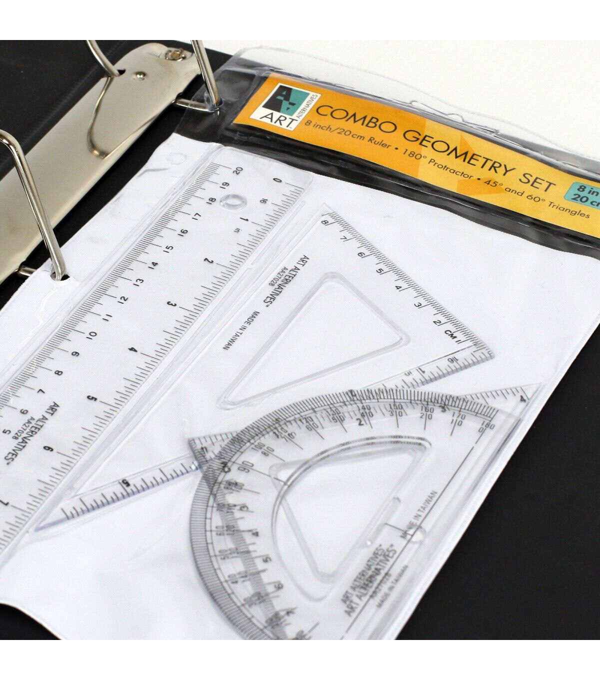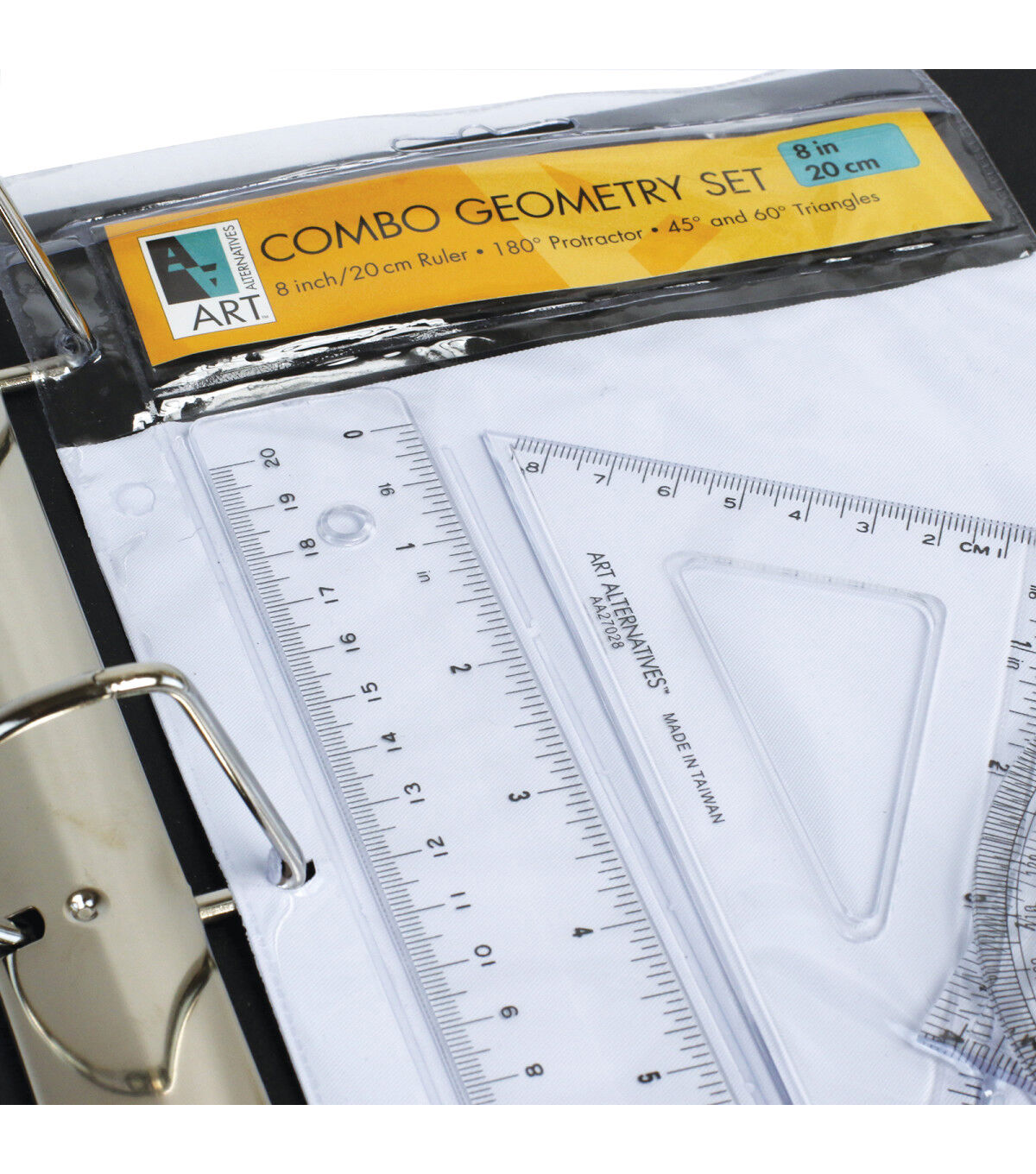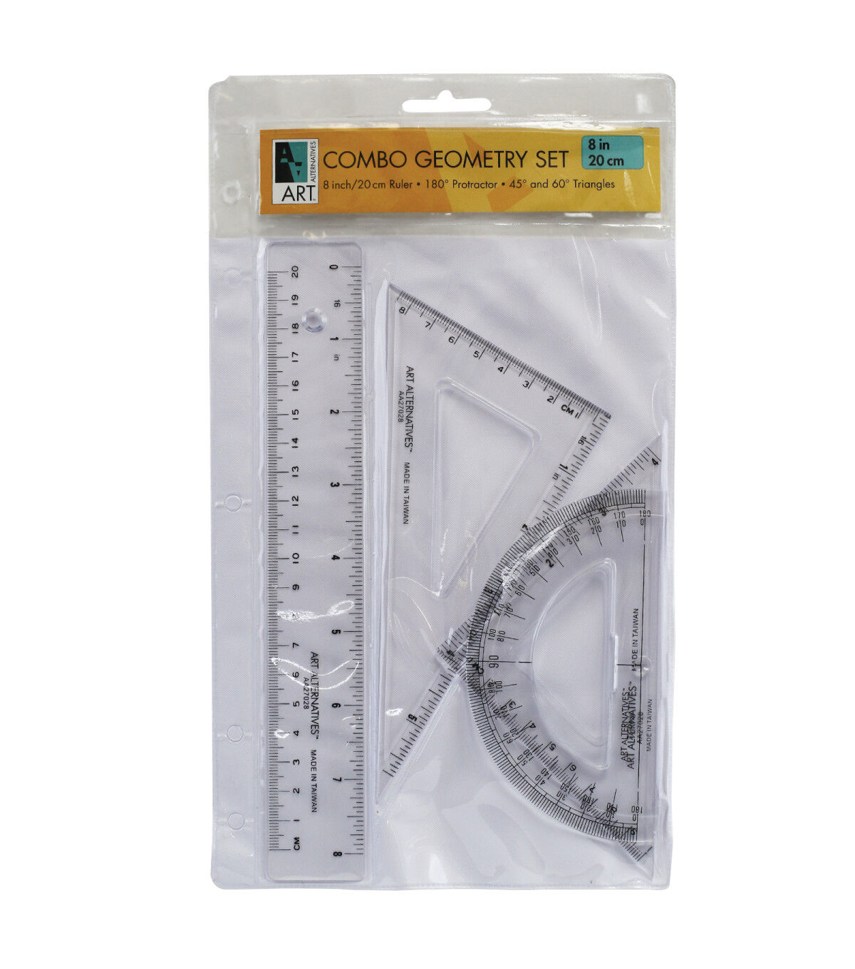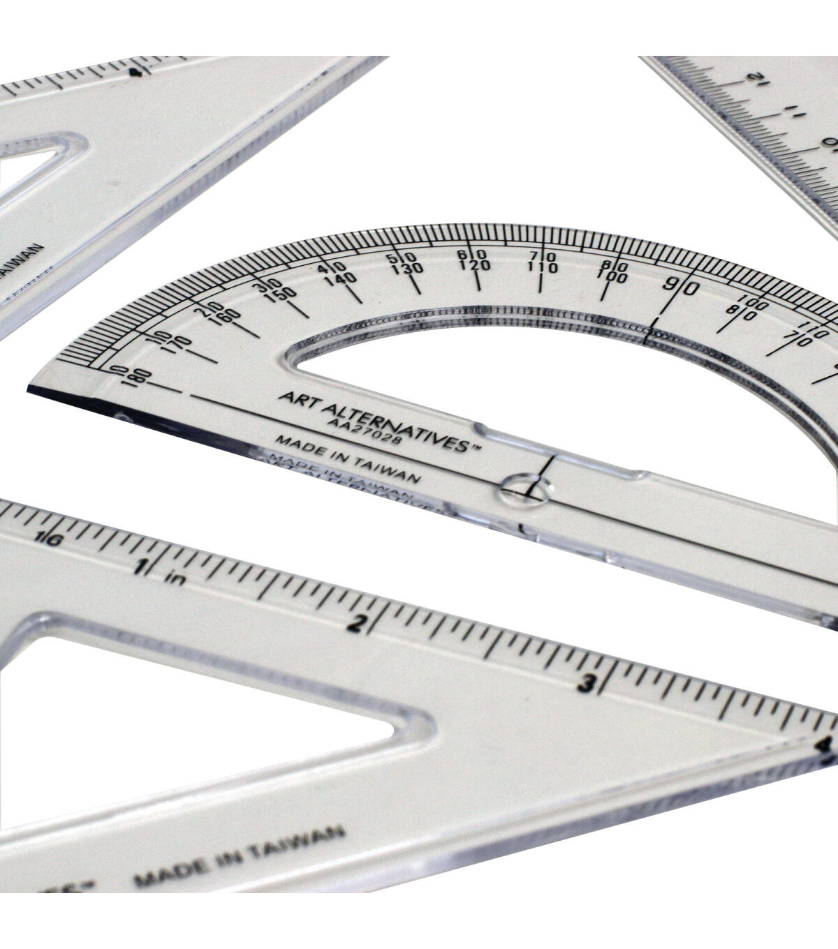 Perfect for students and professionals alike, this geometry set contains a 180° protractor, 45° and 60° triangles and a 6" ruler. The rulers and triangles all have inch and centimeter calibrations for all your measuring needs, and have a clear construction that allows you to see the material you are working with.