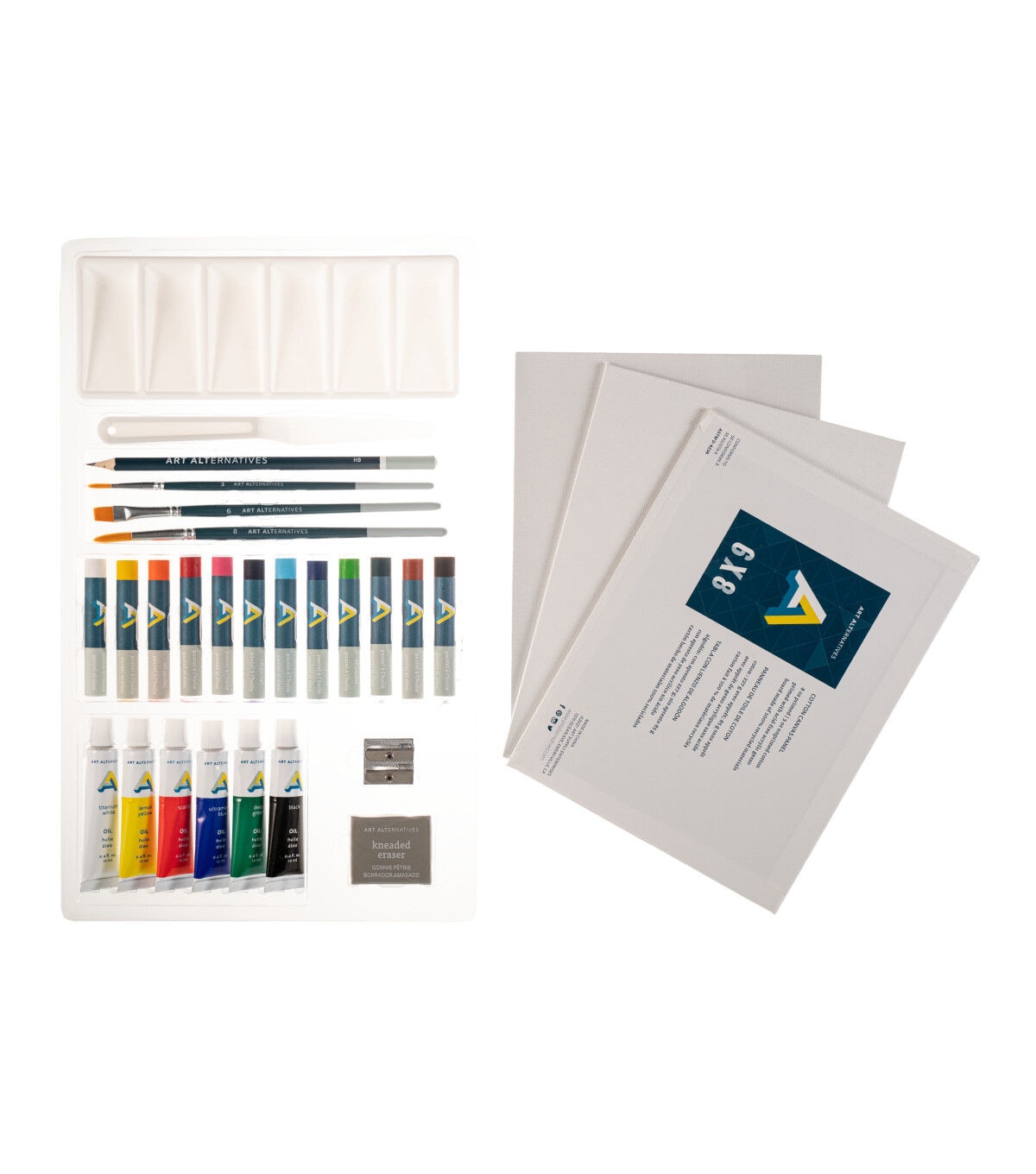 Get started painting in oil with everything you need in one set! This set includes one 6-well paint palette, one painting knife, one HB sketching pencil, six 12ml oil paint tubes, twelve oil pastels, three brushes, a kneaded eraser, pencil sharpener and three canvas boards.