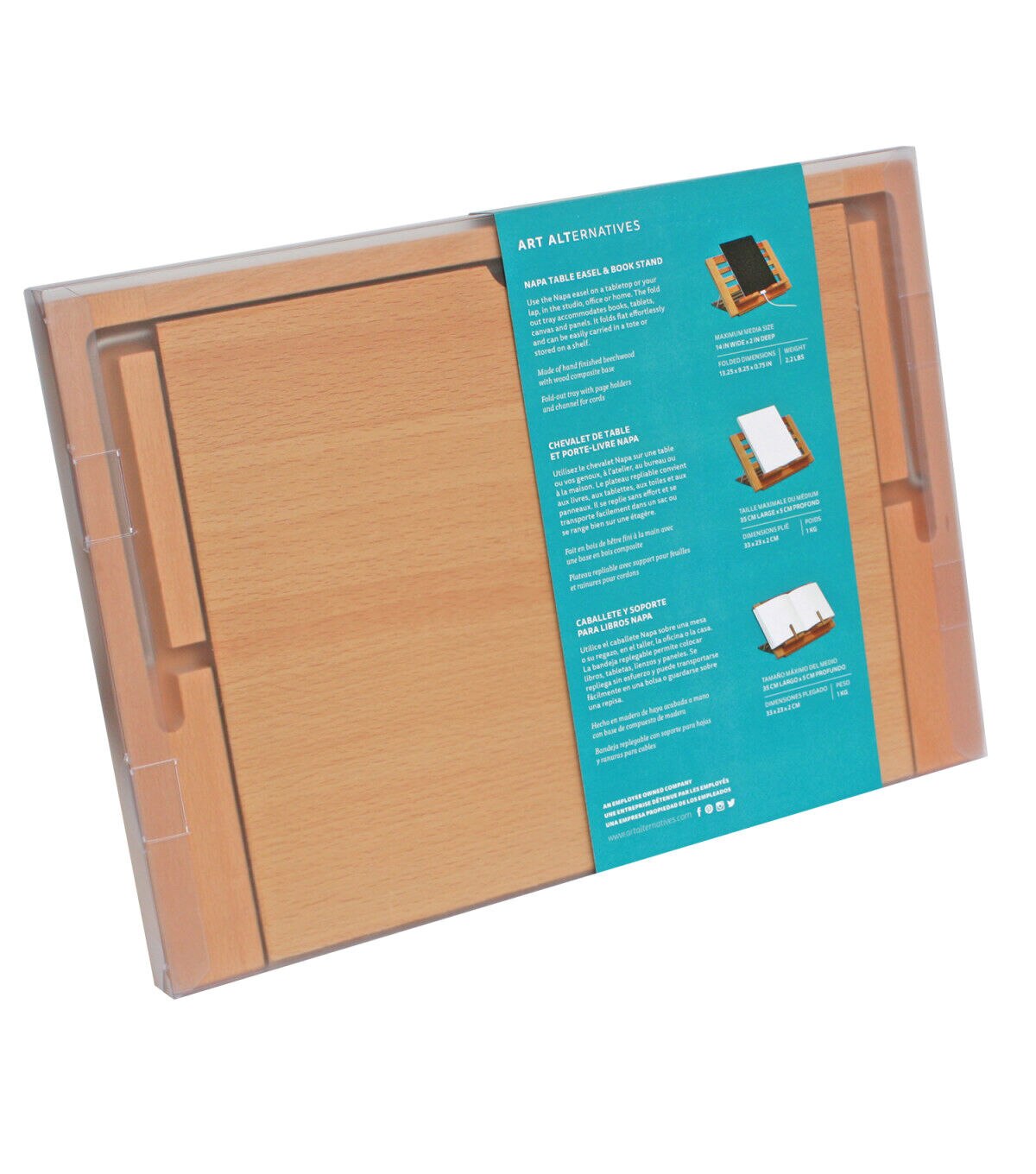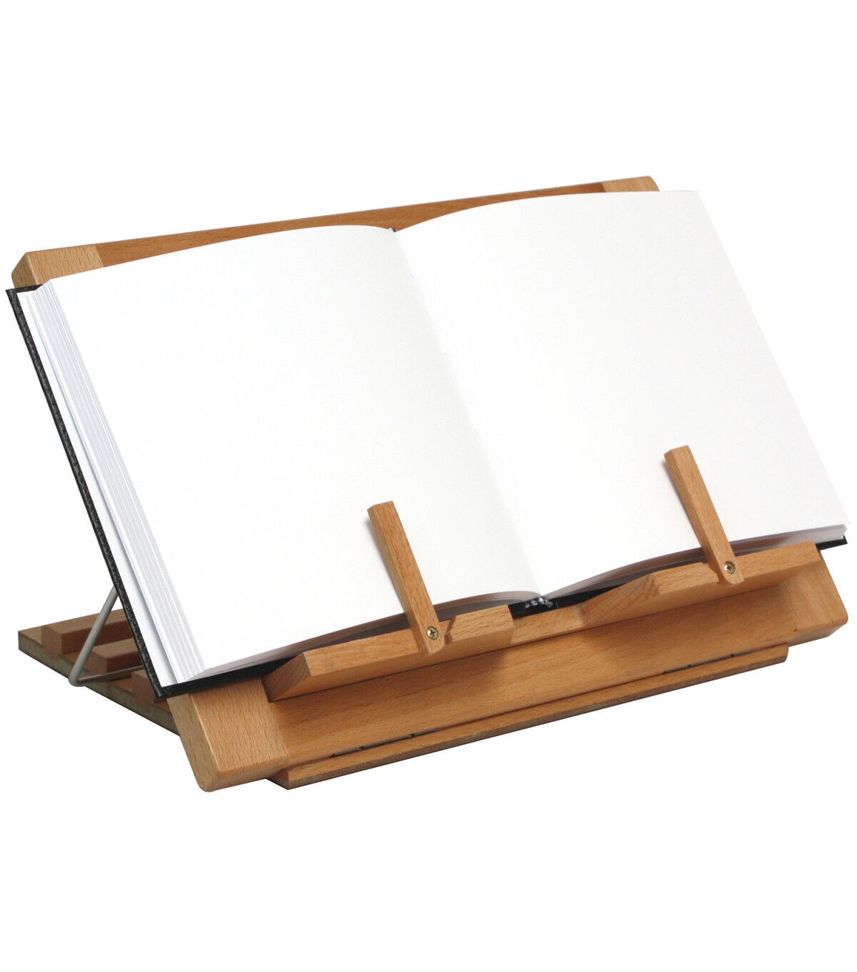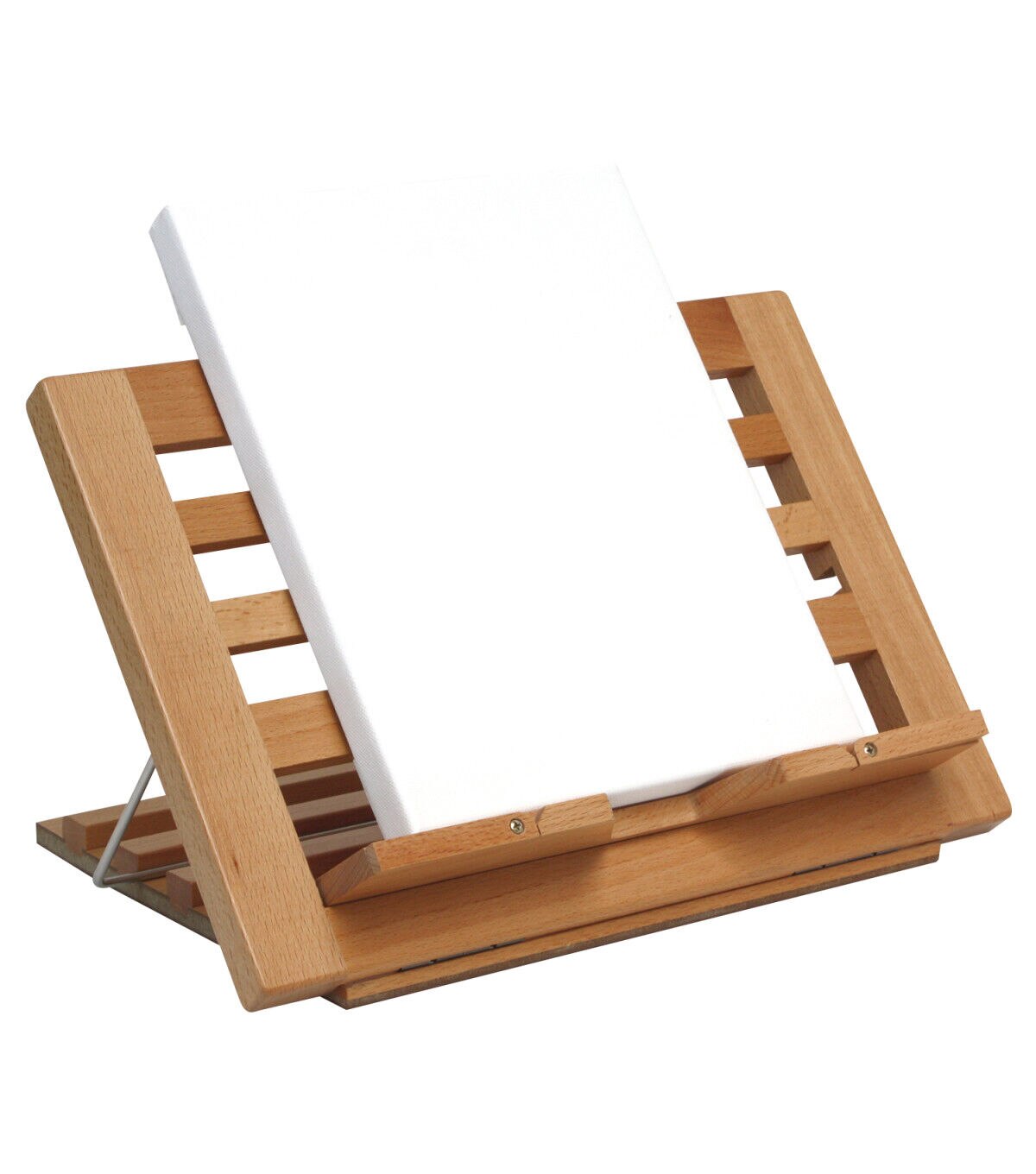 This tabletop easel and book stand is the perfect studio, office or home addition for use with books, tablets, canvas or panels. Featuring a tray for brushes or writing utensils and two flip-up page holders to securely mark your place, this easel is multi-purpose and convenient to use. A beveled center cut-out allows tablets to charge while on the stand. The easel incline adjusts to three positions for optimal positioning, ships fully assembled with no set up hassle and folds flat for easy storage or transport.