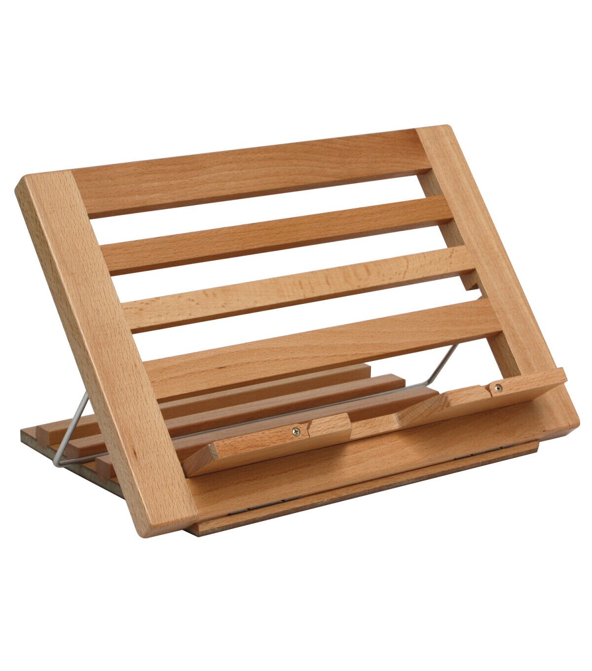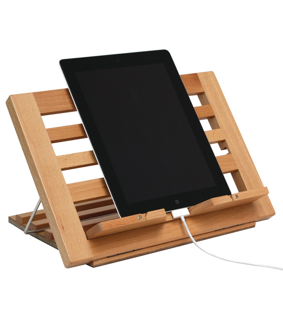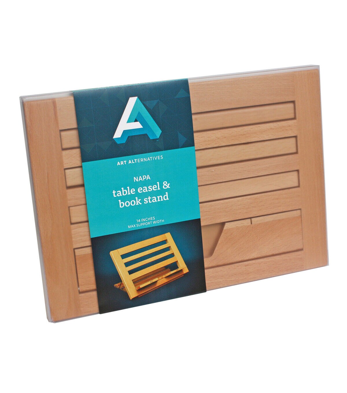 This tabletop easel and book stand is the perfect studio, office or home addition for use with books, tablets, canvas or panels. Featuring a tray for brushes or writing utensils and two flip-up page holders to securely mark your place, this easel is multi-purpose and convenient to use. A beveled center cut-out allows tablets to charge while on the stand. The easel incline adjusts to three positions for optimal positioning, ships fully assembled with no set up hassle and folds flat for easy storage or transport.