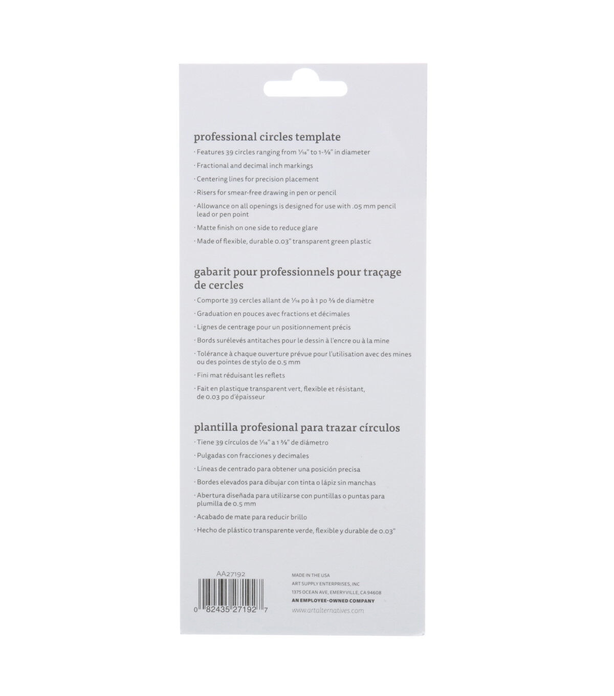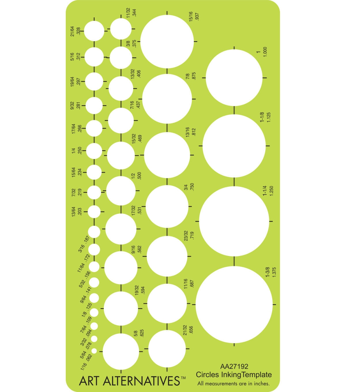 This template features circles with fractional and decimal inch markings plus metric equivalents and centering lines for precision placement. This ellipses template is ideal for designers and artists for maintaining consistent, accurate shapes throughout your design. The allowance on all openings is designed for use with .5mm pencil lead or pen point.