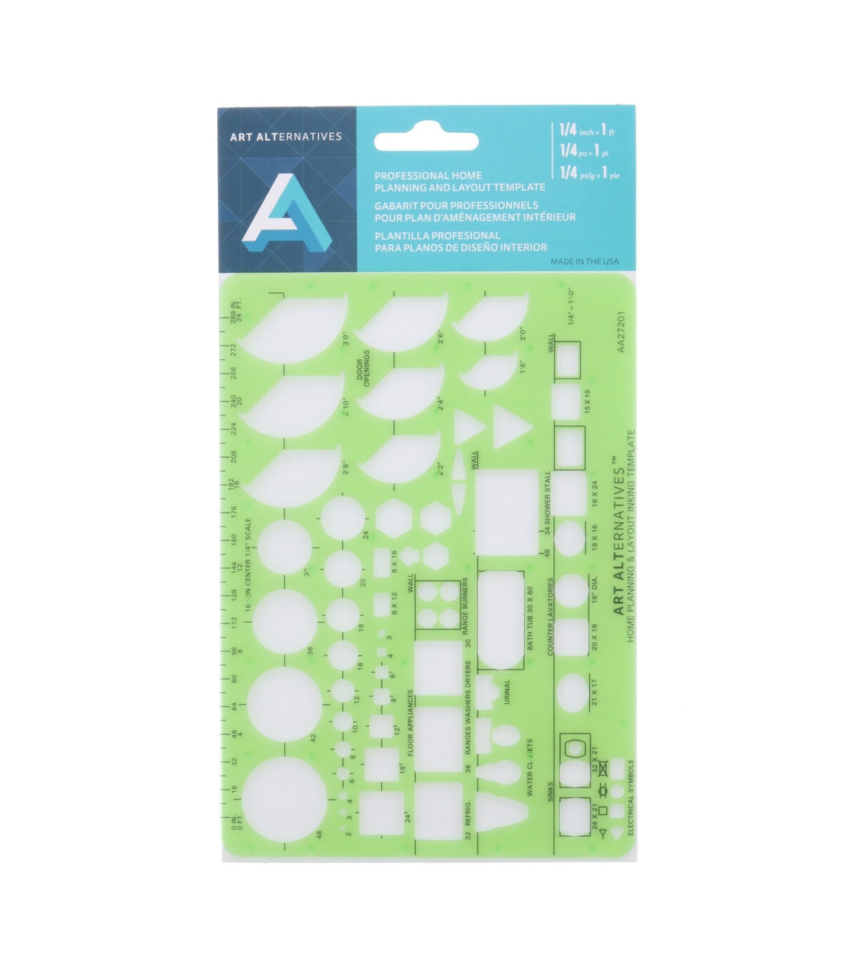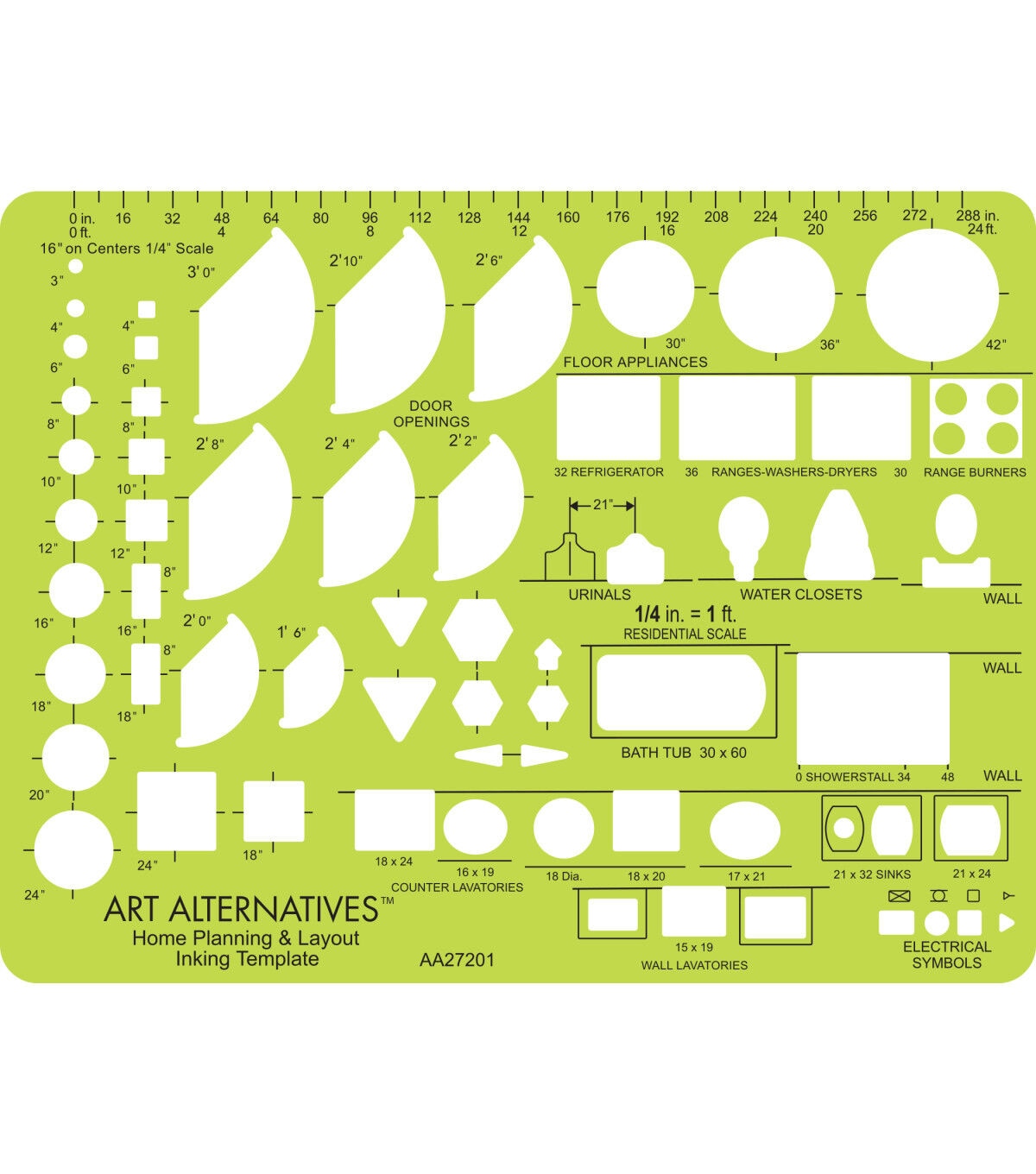 Whether you are designing a home, renovating a room or learning how to draft, this template is extremely useful. It contains a selection of symbols with standard lavatory and kitchen fixtures and appliances, door swings, electrical symbols and more. Made of flexible, durable .03" transparent green plastic. This tool is designed for precision and attention to detail, with centering lines for placement and an allowance on all openings especially for use with .5mm pencil lead or pen point.