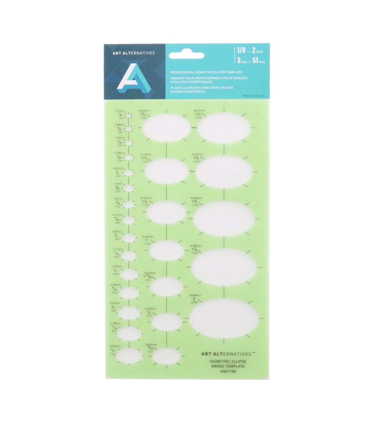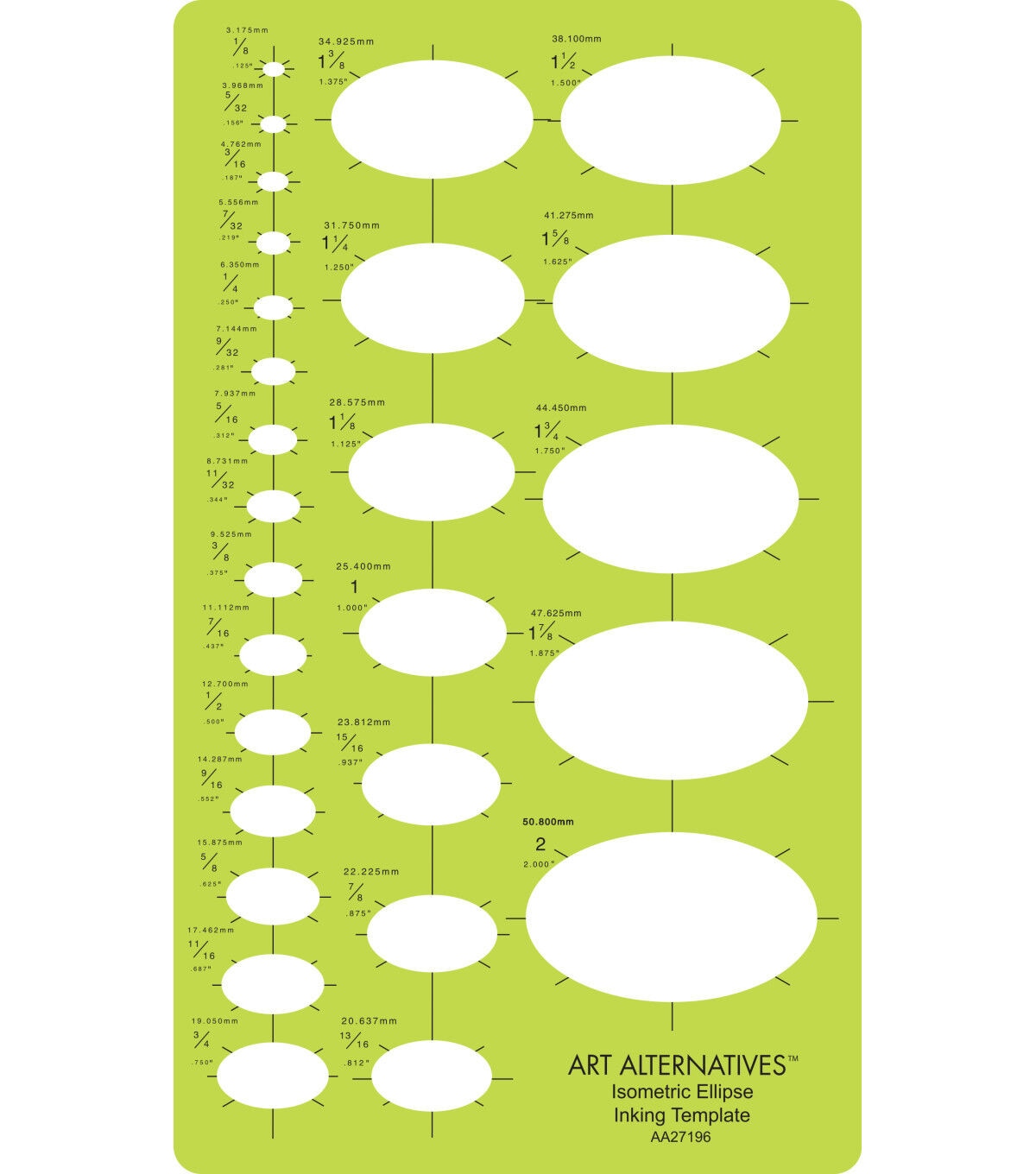 This ellipses template is ideal for designers and artists for maintaining consistent, accurate shapes throughout your design process. Made of flexible, durable 0.03" transparent green plastic, this template features ellipses from 1/8" to 2" in projections of 35° with the isometric diameters measured through the 30° diagonal. It includes fractional and decimal inch markings plus metric equivalents, centering lines for precision placement. Designed to work best with a .5mm pencil lead or pen point. Use for typography, architectural drafting, pattern creation and more.