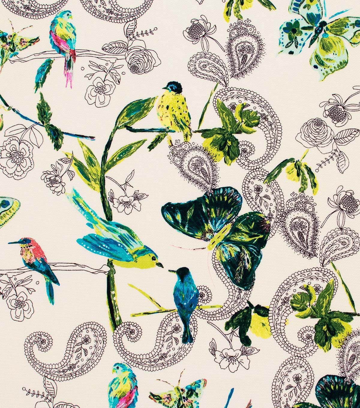 Art Gallery Fabrics believes in inspiring makers and values the importance of fabric collections made with love to fit a modern lifestyle with a chic, sophisticated touch. This canvas fabric was designed by Bari J. and features an array of painterly birds, butterflies and foliage in shades of turquoise and green, on a cream background.