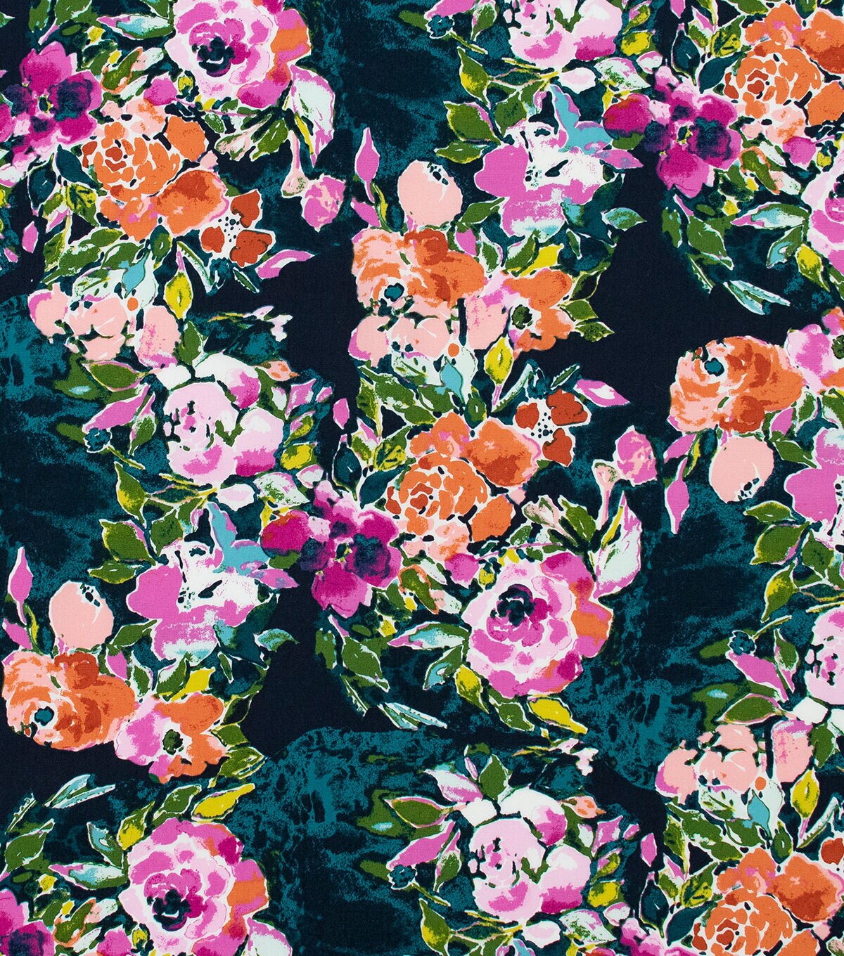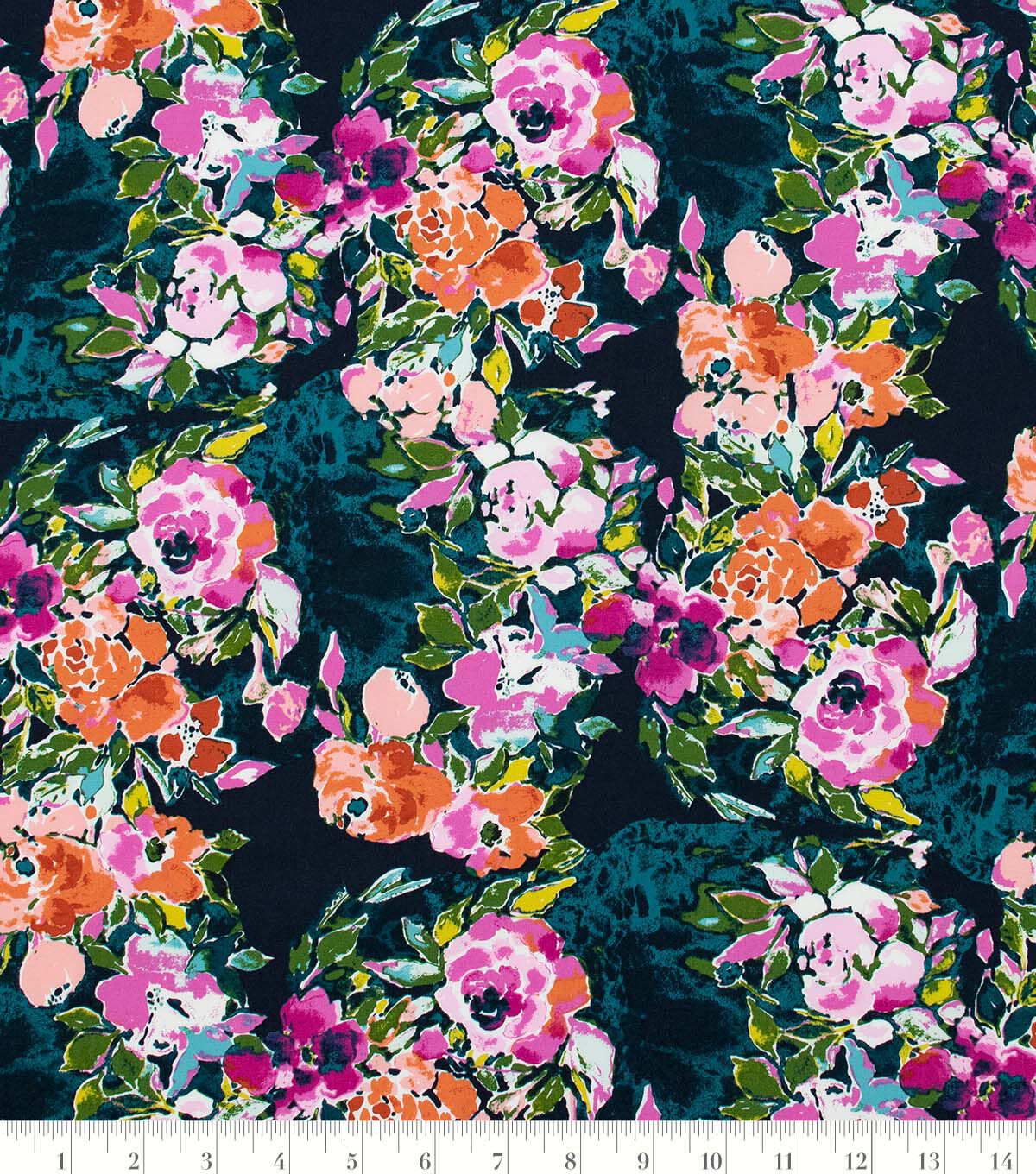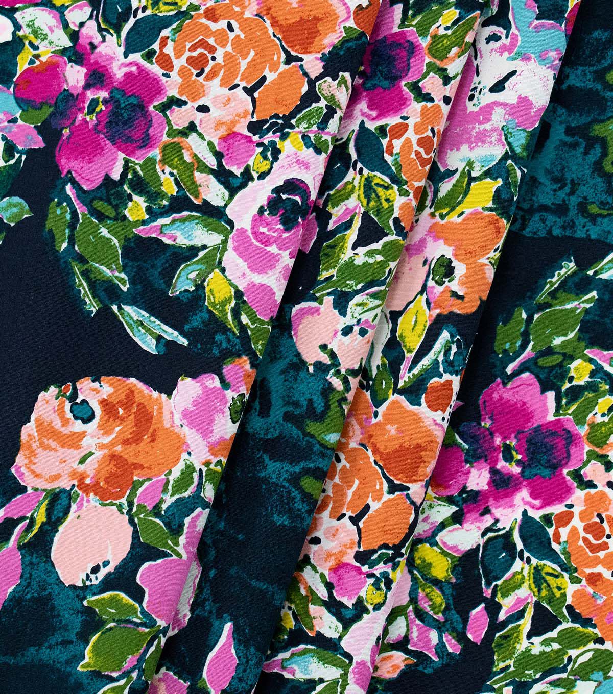 Art Gallery Fabrics believes in inspiring makers and values the importance of fabric collections made with love to fit a modern lifestyle with a chic, sophisticated touch. This fabric is part of the Bloomsbury Collection designed by Bari J. and features an array of painterly flowers in shades of pink, rusty orange and green, on a dark blue background.