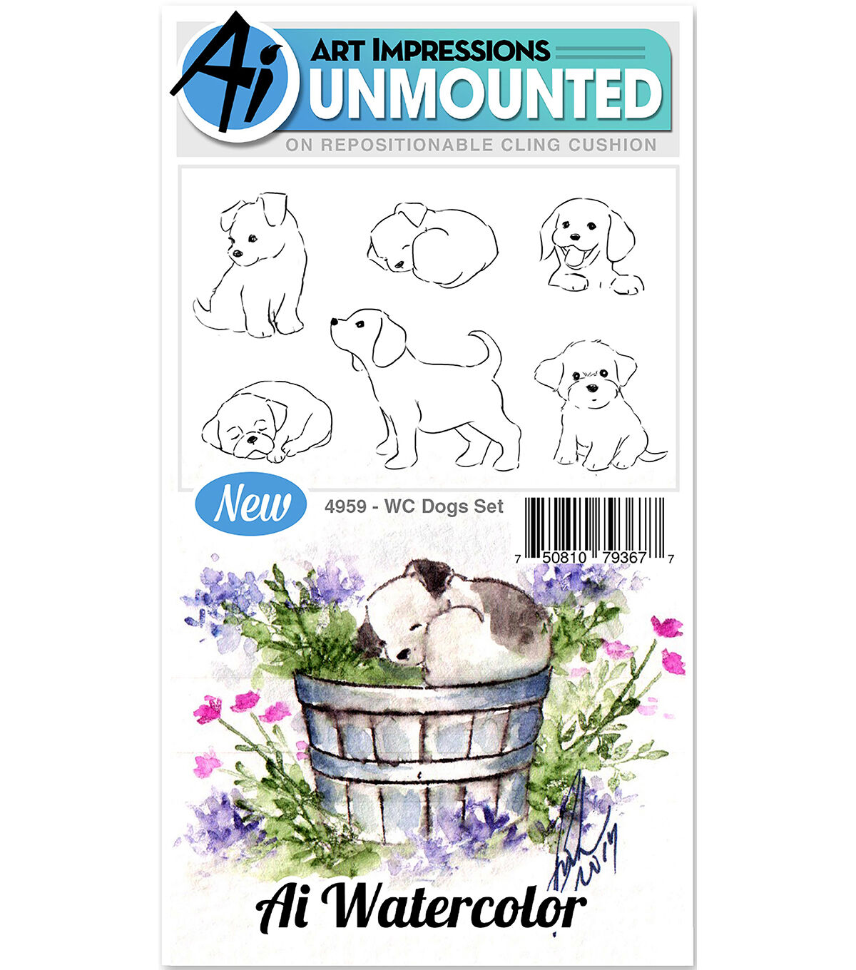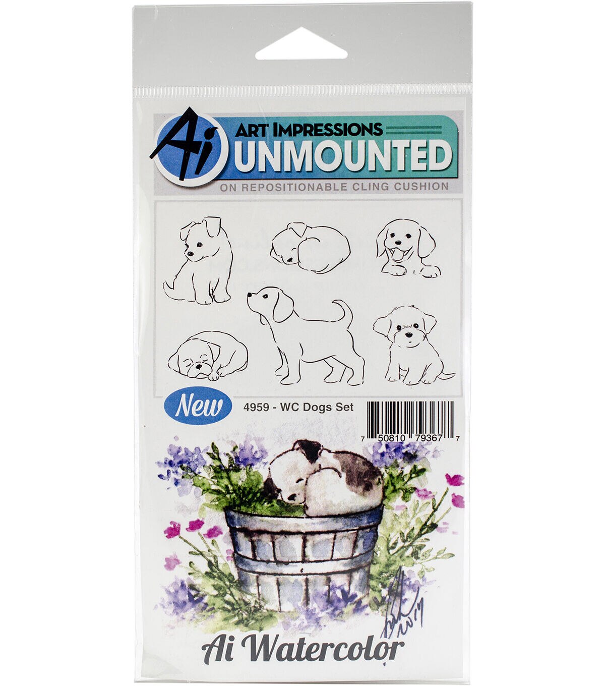 This set will help you to create beautiful watercolor designs. Stamps are rubber on a repositionable cushion and are unmounted. This package contains Dogs: six stamps on one 3.75x7 inch sheet. Made in USA.