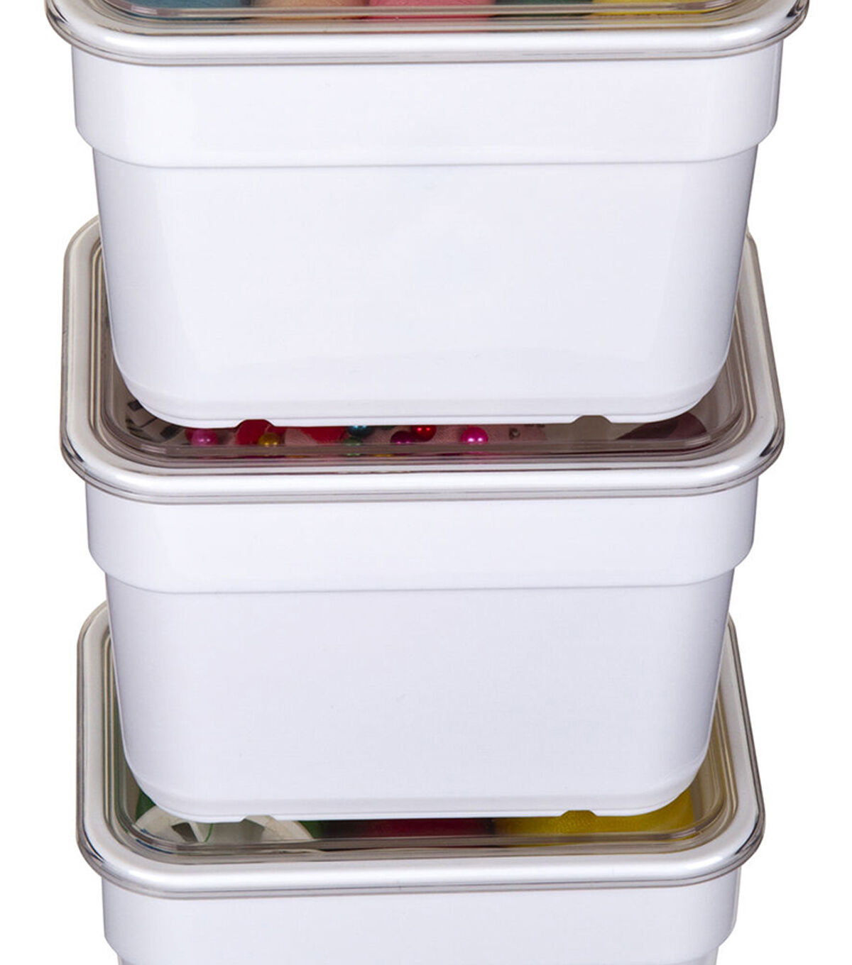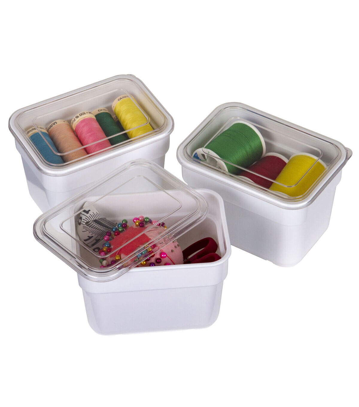 Set of 3 ArtBin Bins with Lids. Feature a clear lid for easy viewing of supplies inside. The body of the bins is designed to sit upon a peg board. Also fits into ArtBin Super Satchels. These ArtBin Bins with Lids are ideal for organizing small supplies such as buttons, beads, embellishments, pins, erasers and more. No more digging through drawers to find your small supplies!
