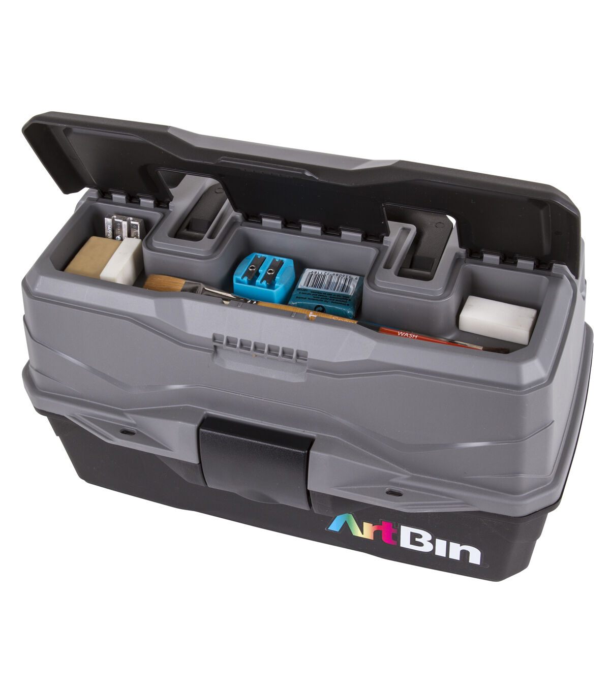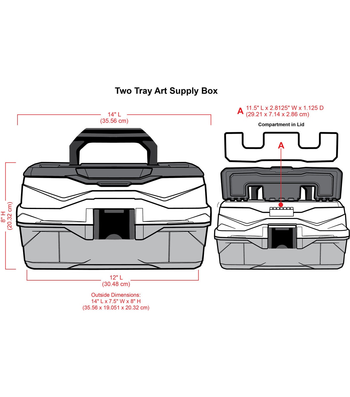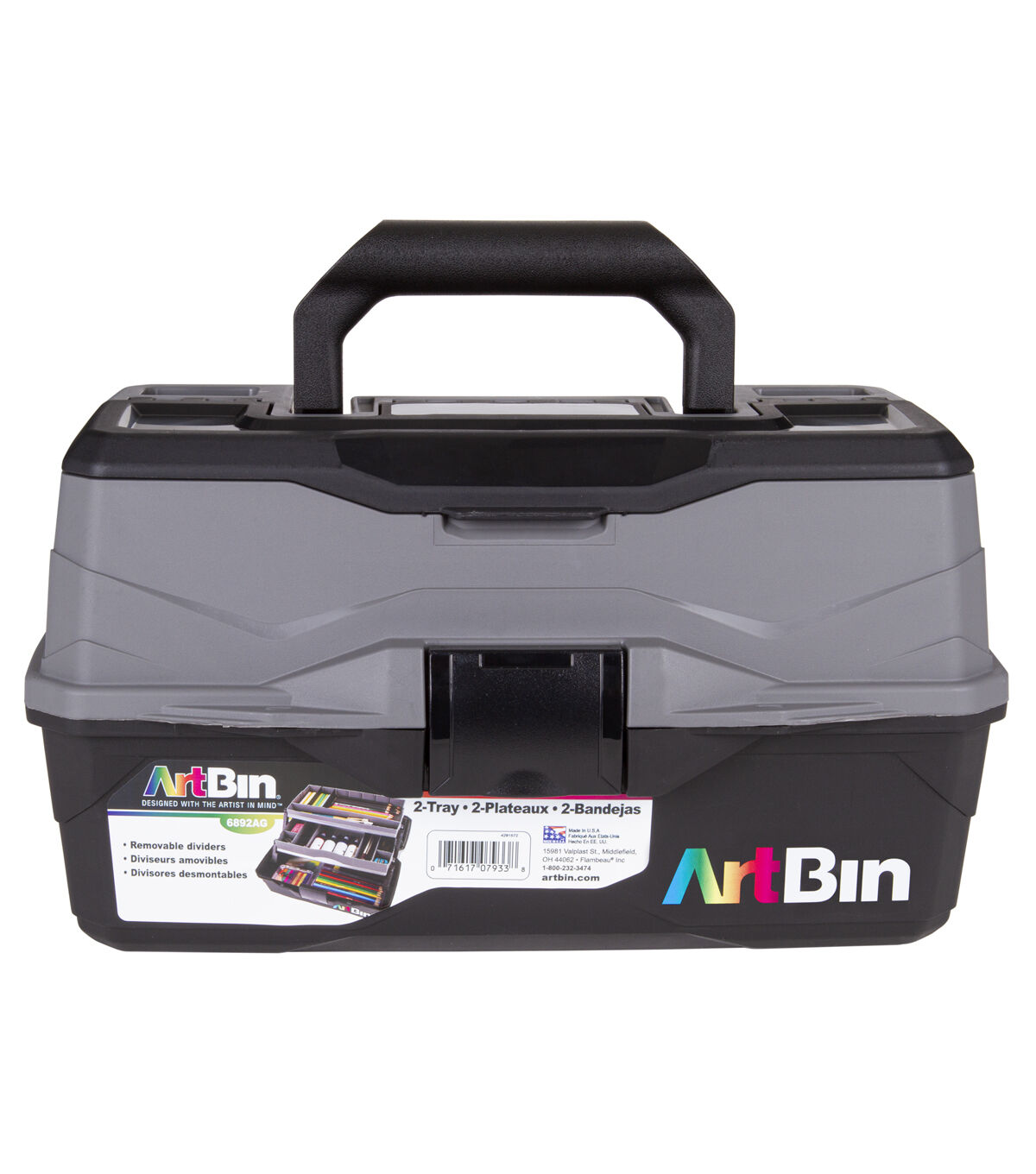 The ArtBin Two Tray Box features 2 cantilevered trays with removable dividers. The top tray with removable dividers is designed to allow for more storage of longer items such as paint brushes, pencils and markers. It has a large open area in the bottom of the box for storage of bulkier supplies. Perfect for both the professional and student Artist.