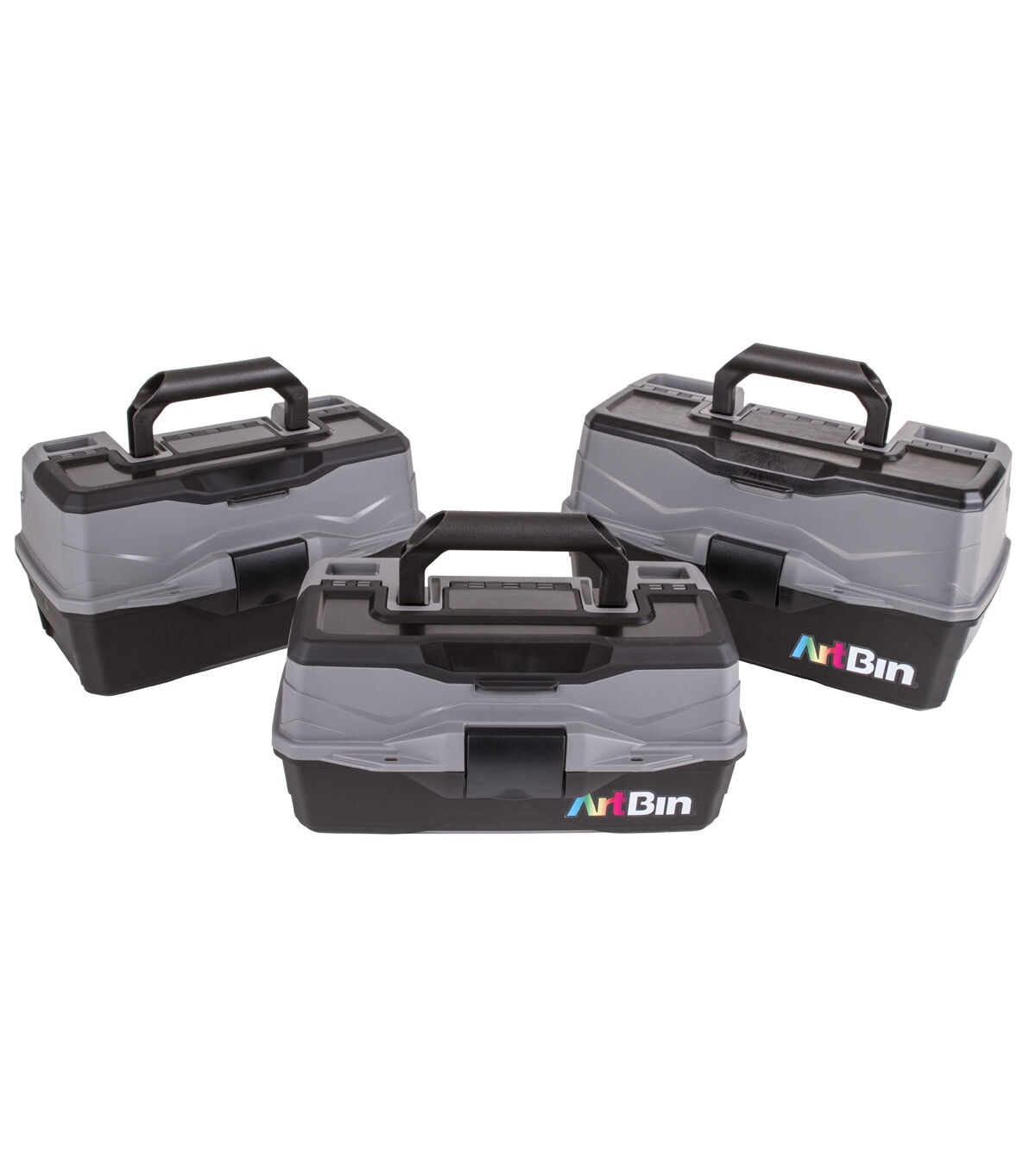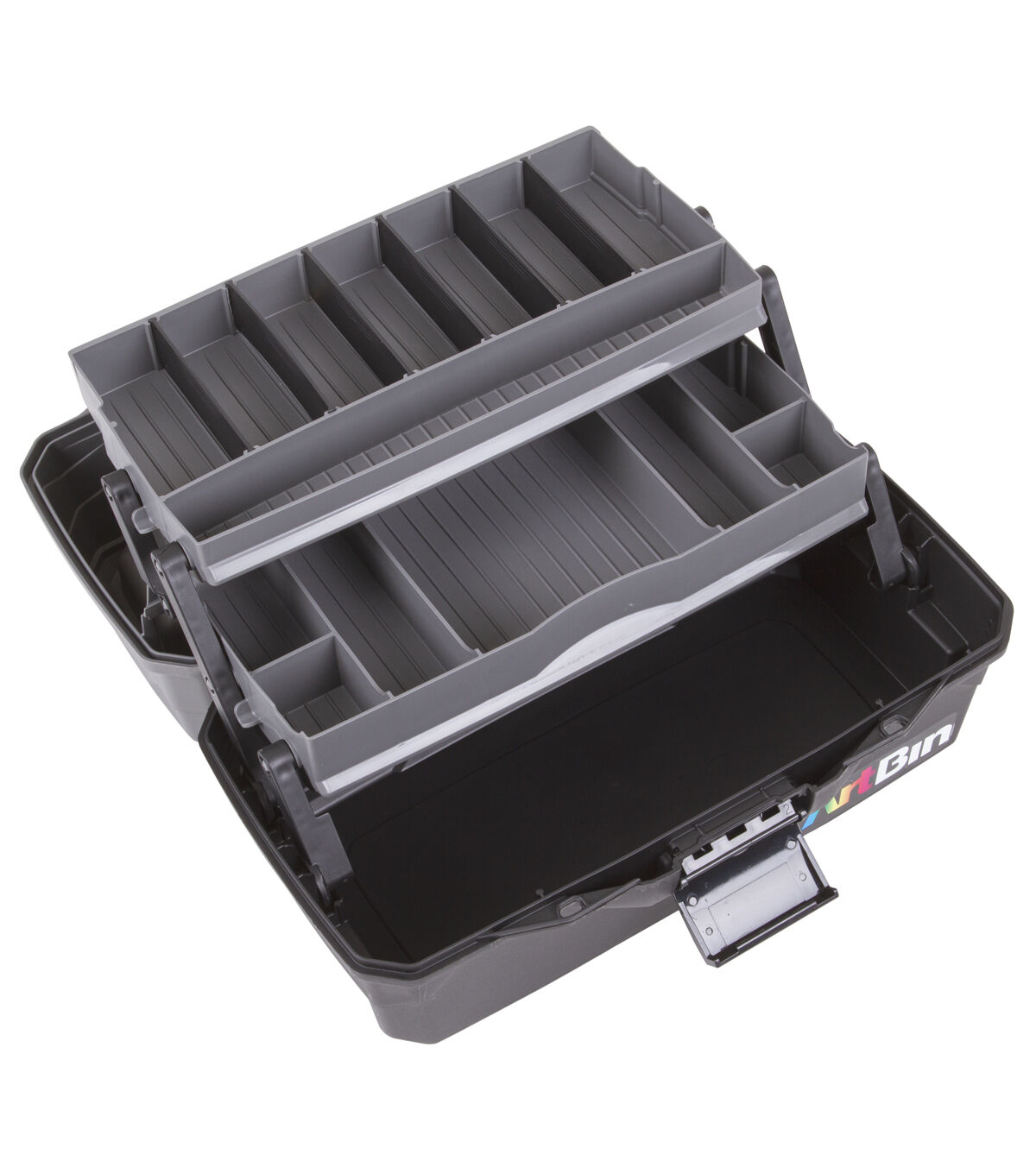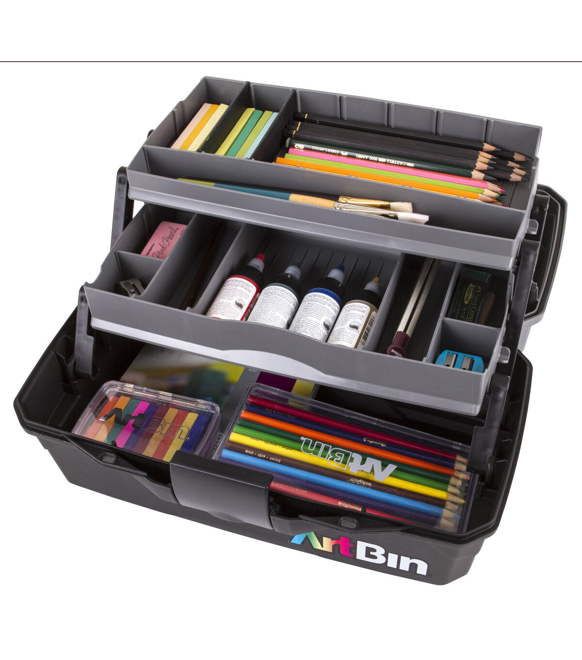 The ArtBin Two Tray Box features 2 cantilevered trays with removable dividers. The top tray with removable dividers is designed to allow for more storage of longer items such as paint brushes, pencils and markers. It has a large open area in the bottom of the box for storage of bulkier supplies. Perfect for both the professional and student Artist.