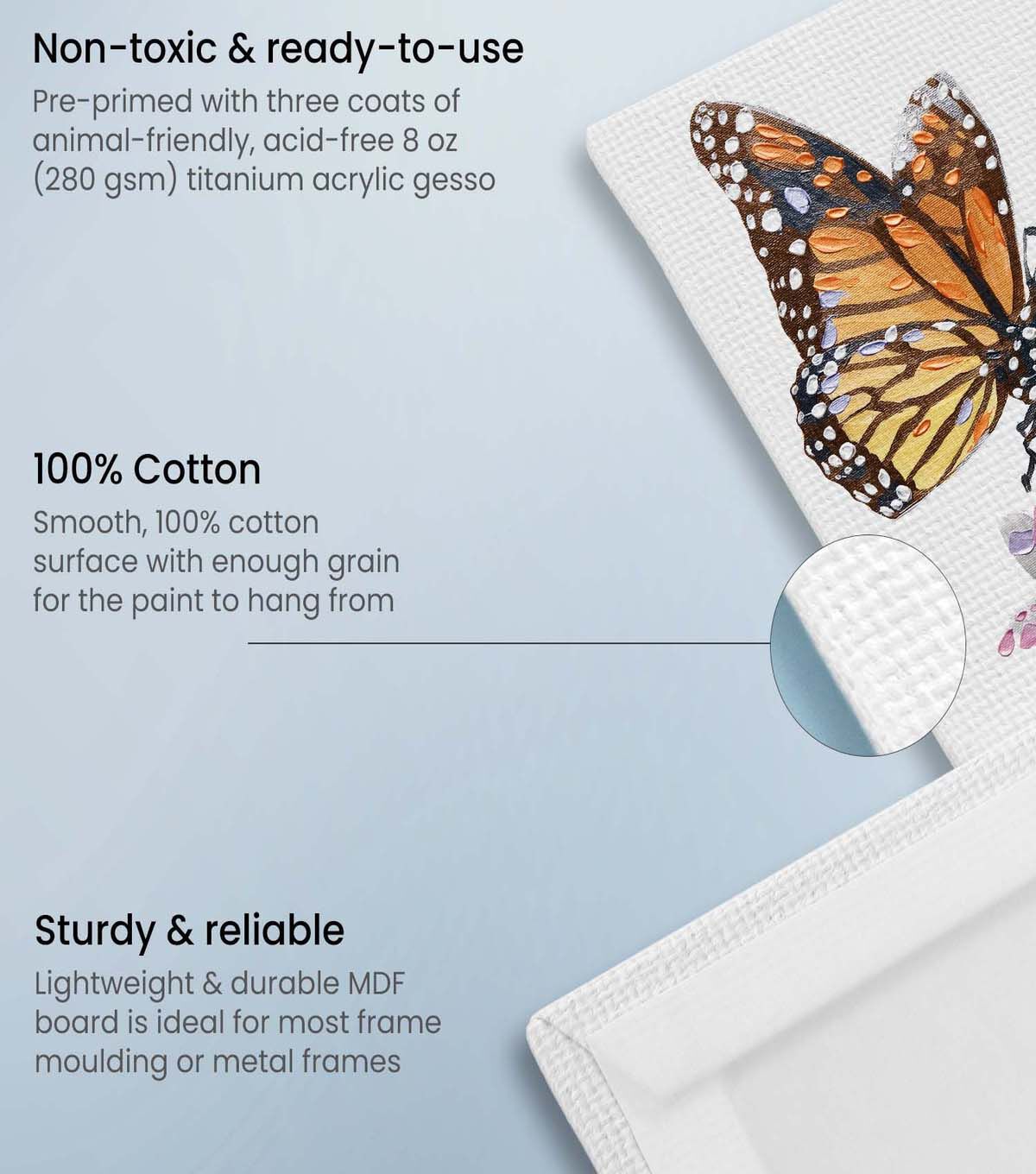 Arteza’s 11 by 14 canvas panels are made with care in order to display your spectacular paintings for generations. We’ve primed each canvas with three coats of non-toxic, cruelty-free, acid-free titanium acrylic gesso so that these canvases are ready to go as soon as you open them. Each gesso primed canvas is individually wrapped to meet your immediate needs. Whether you plan to gift these canvas panels to multiple artists or keep them all for yourself, they are individually wrapped to assure safe storage and transportation. The pre-primed canvases in this pack are perfectly textured; the 100% cotton surface is smooth to the eye, but grainy enough for paint grip nicely.