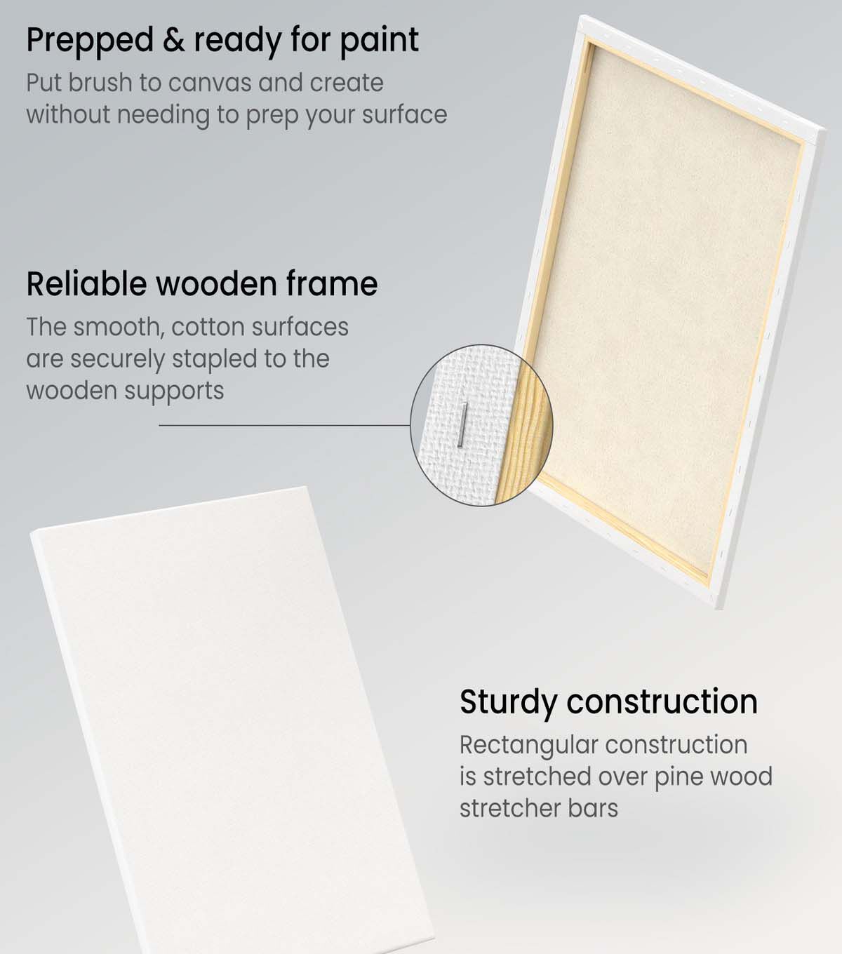 Arteza’s carefully designed 16 x 20 inches stretched canvases 6-pack are made with all artists wants and needs in mind. Each stretched canvas is pre-primed with three coats of cruelty-free (animal friendly), acid-free, titanium acrylic gesso. Since the stretched canvases featured in this pack have all been pre-primed, they are completely ready to be used the second you feel ready to create. Each canvas is made up of a smooth, 100% cotton surface, which is perfectly textured to assure your paint ‘hangs’ properly. These sturdy and reliable canvases work extraordinarily with both wet and dry media. Whether you are planning on using these gesso primed stretched canvases with acrylic paint, paint markers, pouring paint, tempera paint, oil paint, oil pastels, and/or graphite, these dependable canvases will showcase your work marvelously. These versatile pre-primed stretched canvases are made of durable pinewood stretcher bars to confidently hold your canvas together. Order your pack of 6 classic stretched canvases today to see for yourself how extraordinary it feels to paint on high-quality canvases.