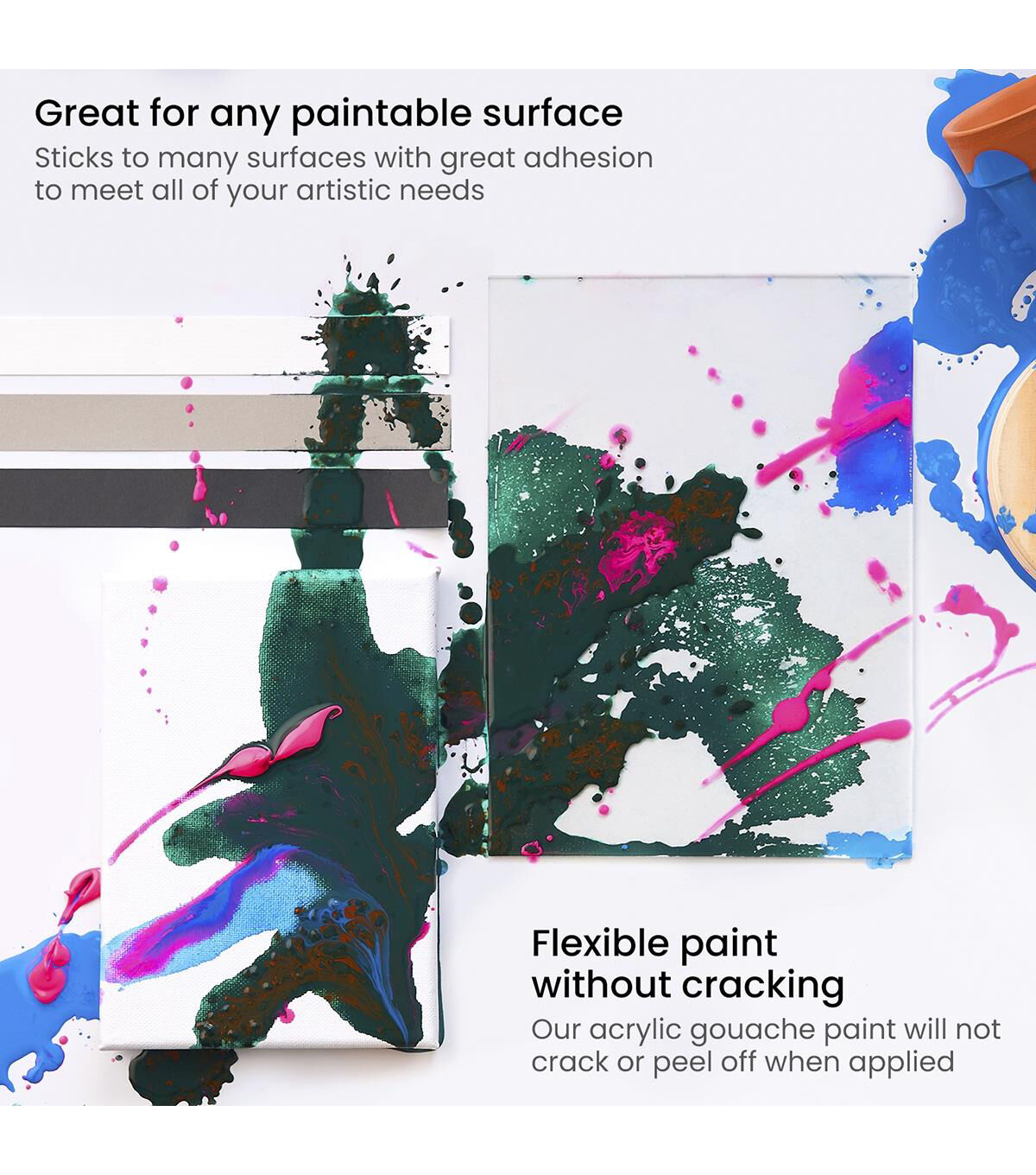 - For a Variety of Surfaces -In addition to canvas, acrylic gouache can be used on most surfaces like wood, glass, and metal