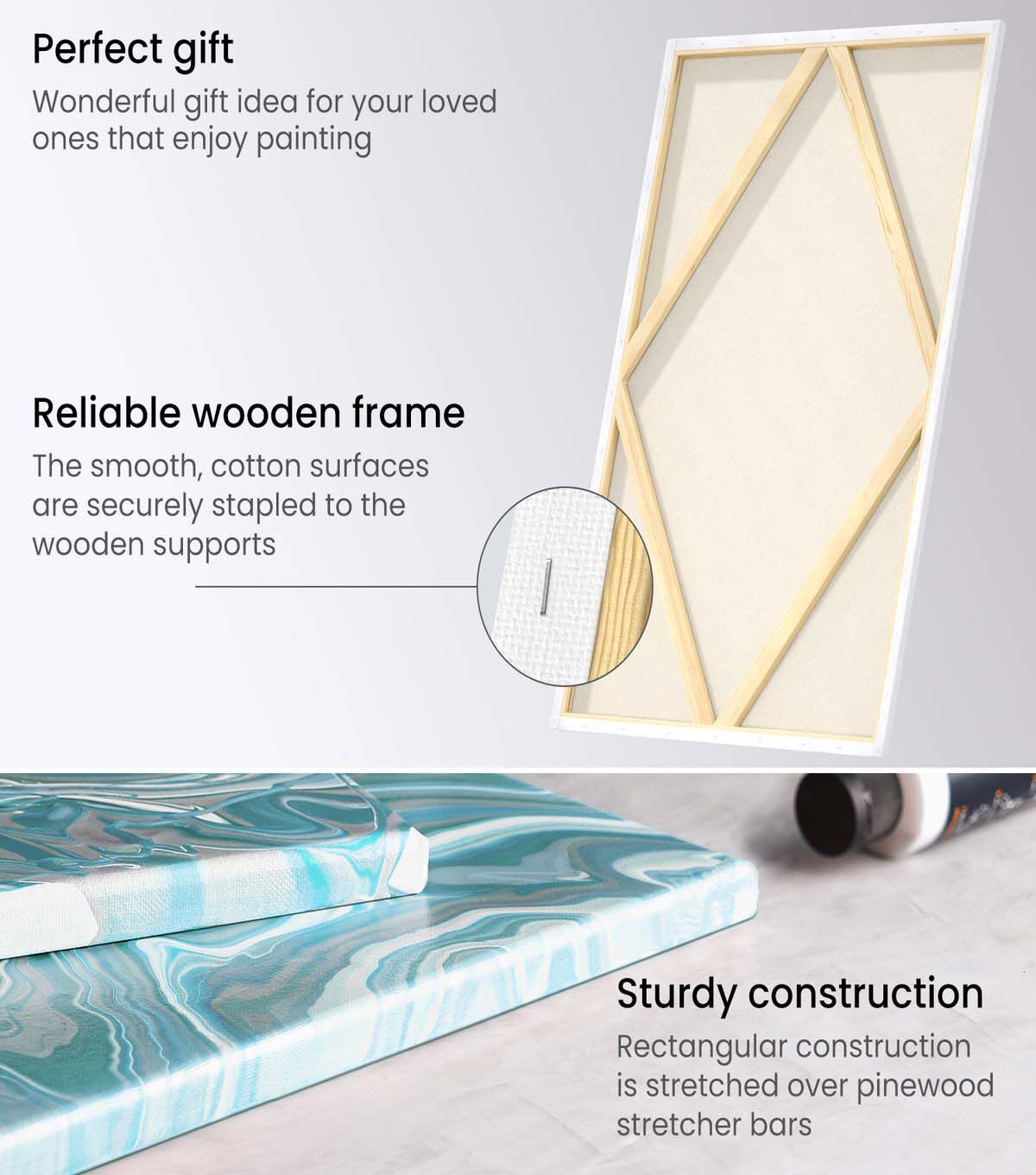 This pack of 5 classic cotton stretched canvases contains the perfect canvases for your next artistic project or creation. Our canvases are compatible with both wet and dry media, inviting you to experiment with a mixed media masterpiece. These versatile canvases were designed for a variety of paints and techniques. With our classic stretched canvases you can confidently work with acrylic, watercolor, tempera, oil, gouache, and pouring paints, as well as graphite, colored pencil, marker, oil pastel, and other dry media. Each canvas in this set of 5 comes pre-primed to save you the time, money, and energy. Each 24”x36” canvas comes pre-primed with three coats of cruelty-free (animal-friendly) acid-free titanium acrylic gesso. Your perfectly textured canvases are made of a smooth, 100% cotton surface which is then stapled to the durable pinewood stretcher bars, that hold your canvases firmly. The pre-primed surface is grained for paint to hang from with ease. Order your 5-pack of classic stretched canvases to create on a canvas that will showcase your work vibrantly, with no fading or yellowing over time.