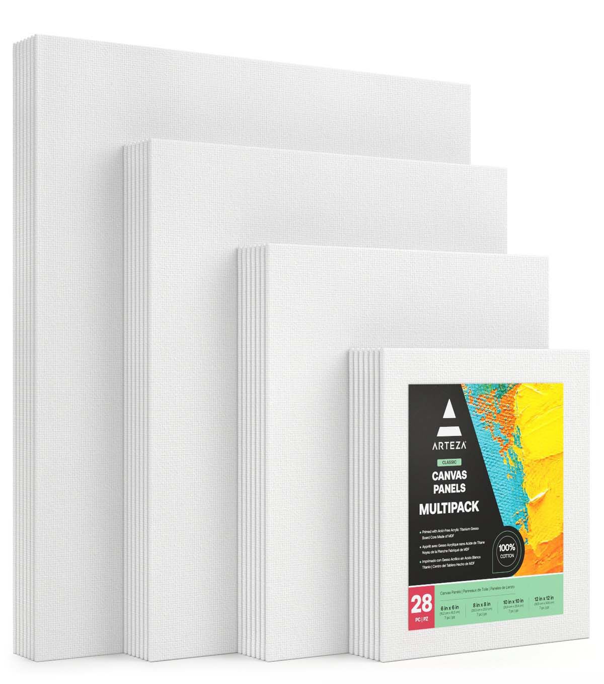 Arteza Classic Canvas Panels, Multi-Pack Sizes, Square - Set of 28