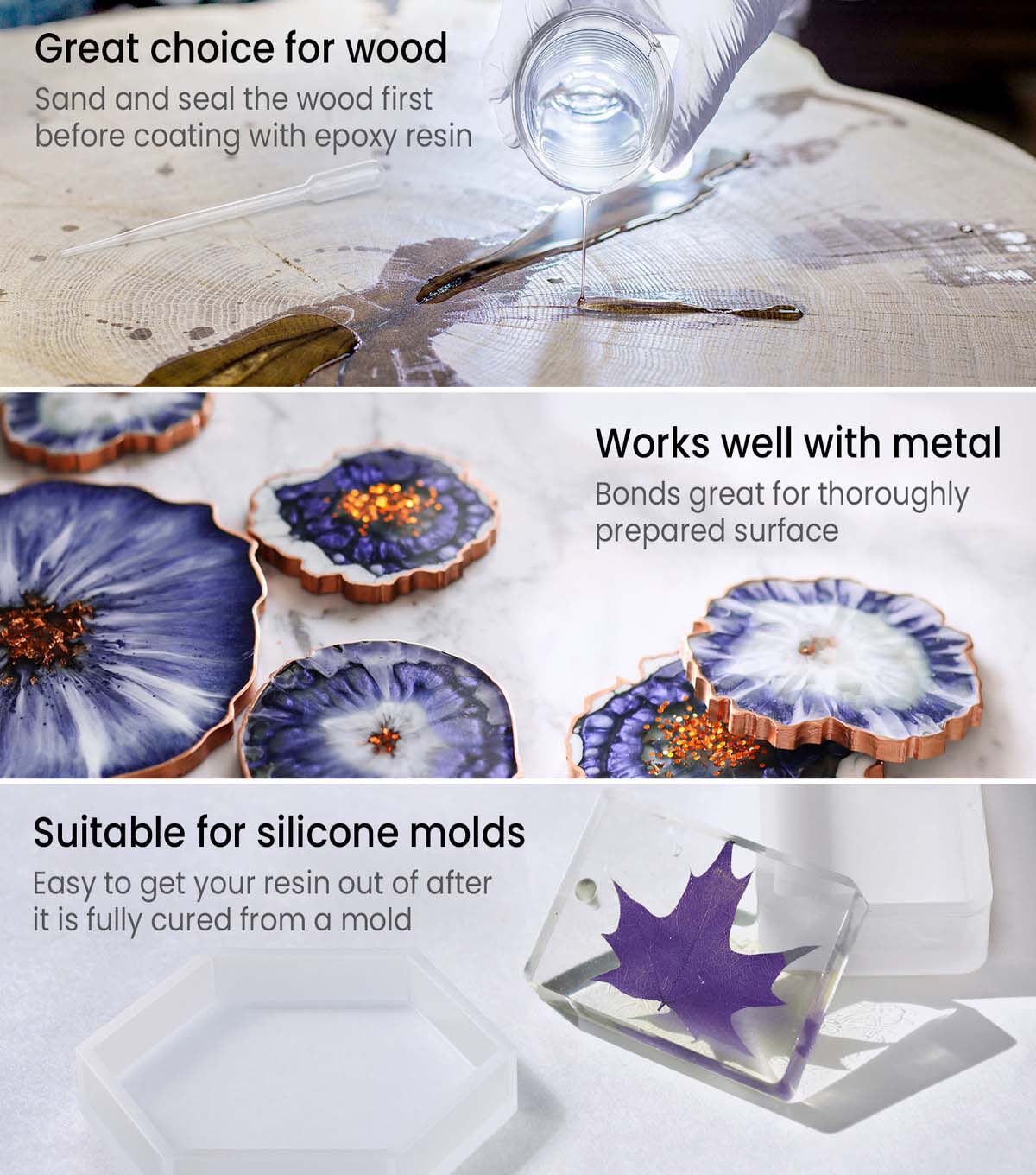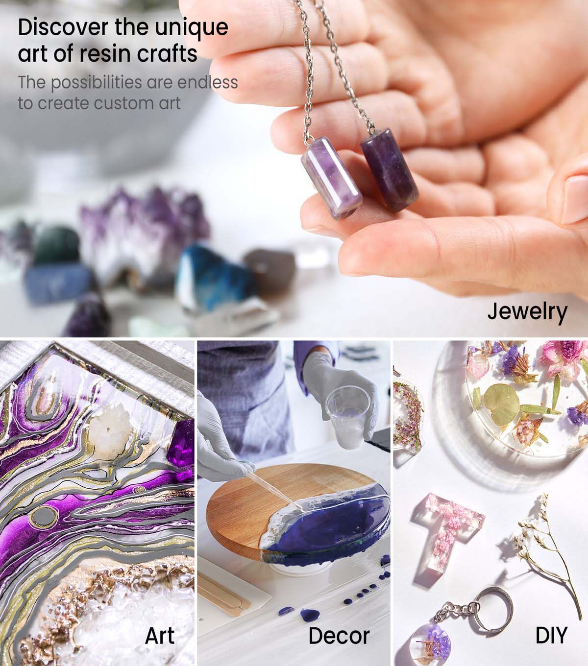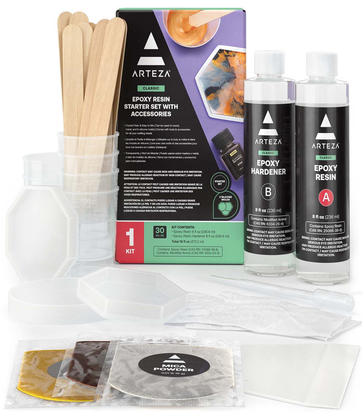 Discover the unique art of resin crafts with our Epoxy Resin Kit with Accessories, 16oz. Use this epoxy resin with one of the included molds and mica powders, and you’ll have unique decor to display or gift once your art has cured. Additionally, this epoxy resin is suitable with our wood slices! Use it as a clear topcoat for your art, or create an epoxy resin pour on them. Unlike many kits out there, our Epoxy Resin Kit with Accessories, 16 oz, features everything needed to get you started! Along with silicone molds and mica powder, you’ll also receive detailed instructions, wood sticks for mixing the resin and hardener, gloves, and mixing cups. All you need to bring is your creativity! As with all epoxy resin, please use it in a well-ventilated area or with a respirator if you have one. Set Includes: 1 Epoxy Resin 8 fl oz, 1 Epoxy Resin Hardener 8 fl oz, 1 Mica Powder White 5g, 1 Mica Powder Black 5g, 1 Mica Powder Gold 5g, 1 Instruction Book, 1 Dropping Pipette 0.1 fl oz, 1 Plastic Spatula, 1 Pair of Gloves, 3 Silicone Molds - Hexagon and Circle Shape, 6 Mixing Cups 3.4 fl oz, & 12 Wood Sticks. Safety: Keep out of reach of children. Use only in a well ventilated area. Warning: Contact may cause skin and serious eye irritation. May produce allergic reaction by skin contact. May cause respiratory irritation.