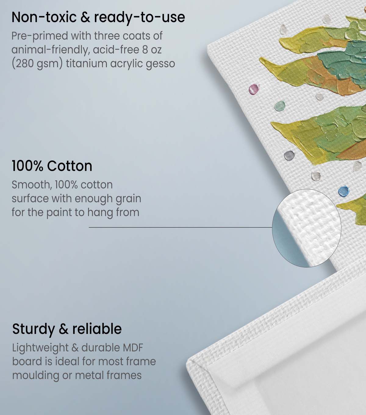 This 14-pack of 9”x12” canvas panels comes completely ready to paint on. Each canvas is pre-primed with three coats of non-toxic, animal-friendly, acid-free, titanium acrylic gesso. The surface of each gesso primed canvas is smooth in appearance, yet grainy in order to hold its paint beautifully. Our 100% cotton, pre-primed canvases are ideal for acrylic paint, acrylic pouring paint, oil paint, and mixed media creations. Our lightweight design makes these canvas panels easily transportable and easy to frame. The compact composition of our gesso primed canvas panels pairs well with both metal frames and frame moulding. This canvas is guaranteed to enhance the appearance of your artwork, whether you intend to use our carefully crafted 9”x12” canvas panels for finished paintings or for sketching with paint. Whether you are new to working on canvas, or you are a professional, this 14-pack of pre-primed canvas panels is sure to impress.