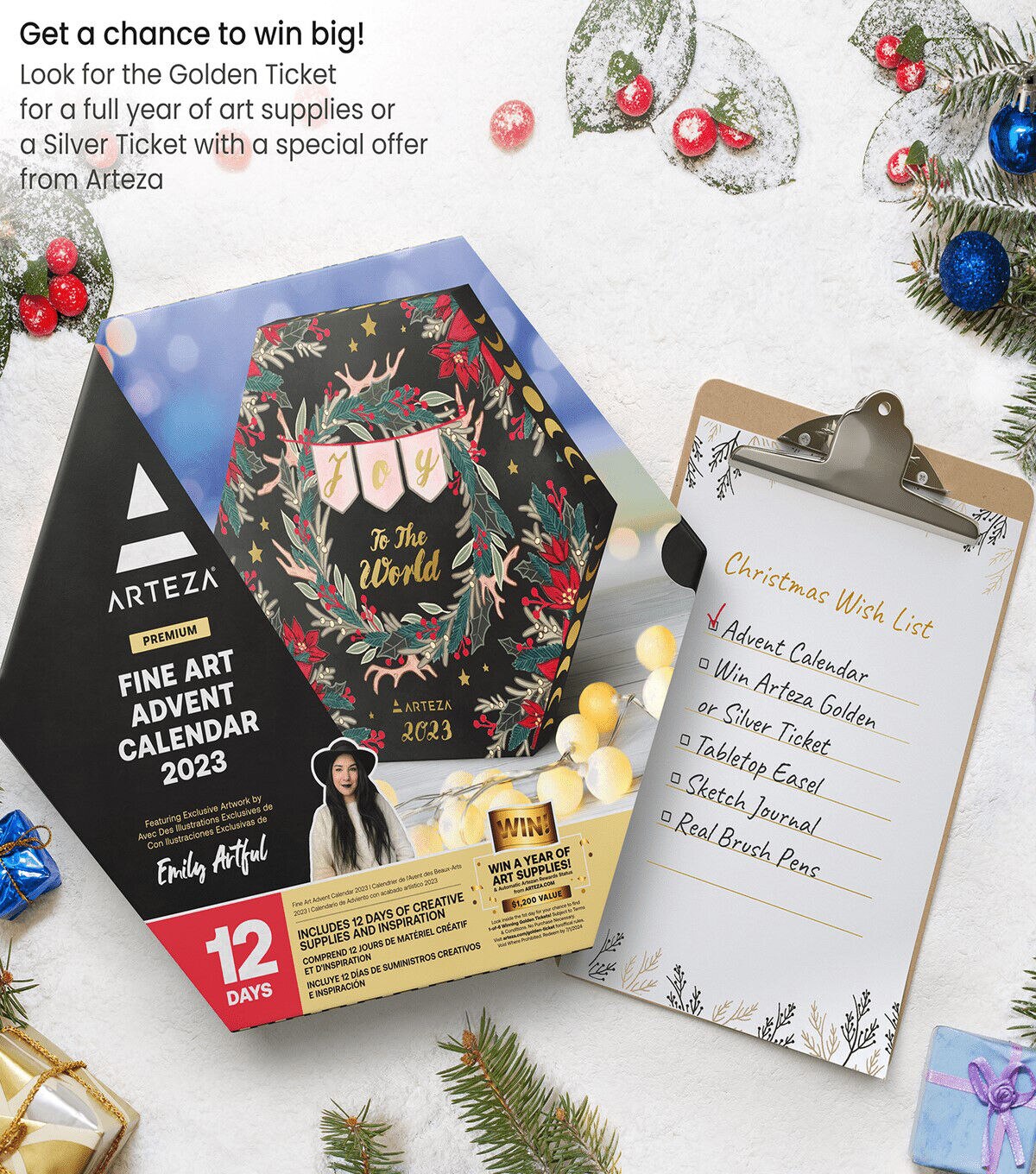 The Advent Calendar is a holiday tradition like a warm hug from December. It's not just a calendar; it's a 12-day journey of excitement, counting down to the joyous holidays. It's like opening a little surprise package daily as you peek behind the unique doors. As December rolls on, from the first day onward, you'll discover 12 delightful gifts waiting for you. Our exclusive Arteza calendar isn't just about presents; it's about having fun with creativity. With each door you open, you'll find not just an art product but a mini adventure—a collection of art product samples, playful challenges, and handy tips and tricks, all tailored to the unique gift of the day.In the company of this calendar, December transforms into a magical holiday wonderland. It's not just a countdown; it's a friendly journey of surprises that keeps you smiling throughout the month.