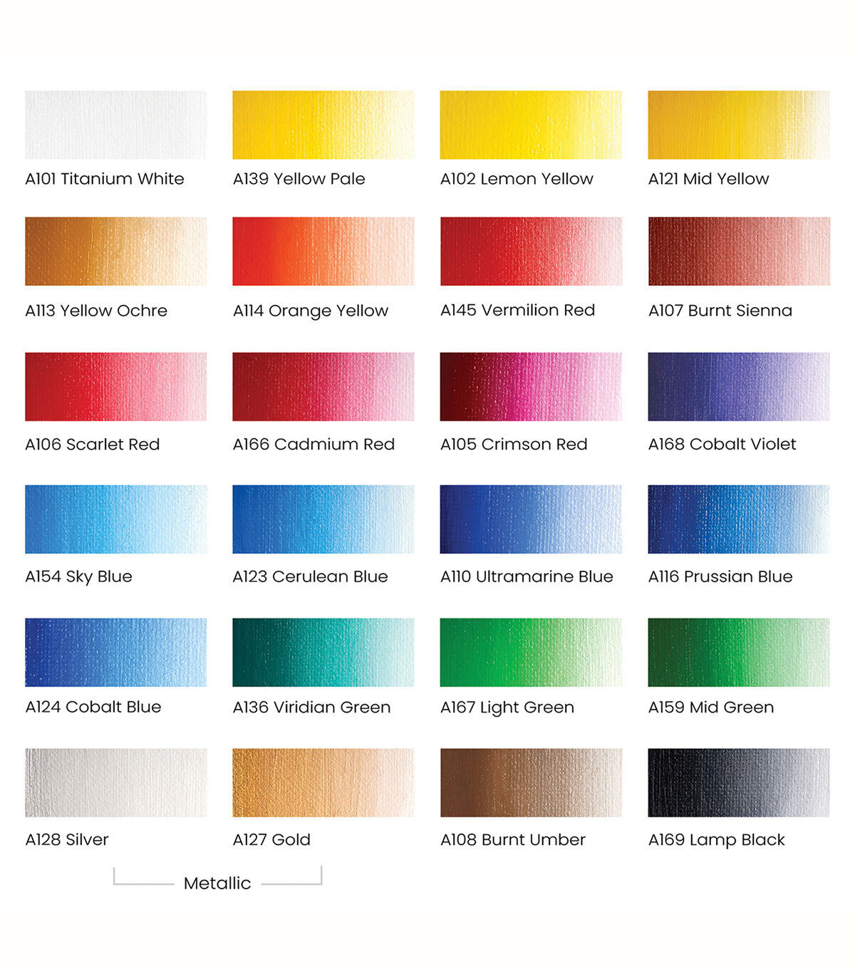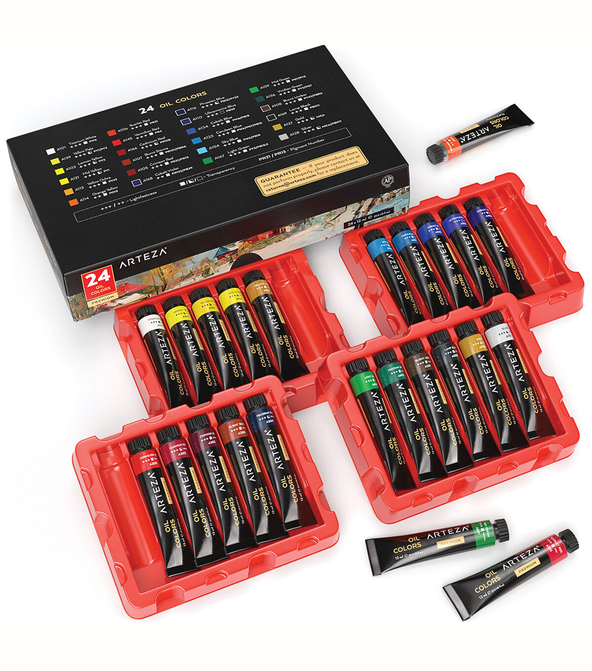 Create stunning paintings with this set of 24 premium oil paints. This set of oil premium artist paint tubes features 24 truly captivating colors: titanium white, yellow pale, lemon yellow, mid yellow, yellow ochre, orange yellow, vermillion red, burnt sienna, scarlet red, cadmium red, crimson red, cobalt violet, sky blue, cerulean blue, ultramarine blue, prussian blue, cobalt blue, viridian green, light green, mid green, silver, gold, burnt umber, and lamp black. The rich and vibrant colors featured provide artists with a wide spectrum of highly pigmented oil paints.